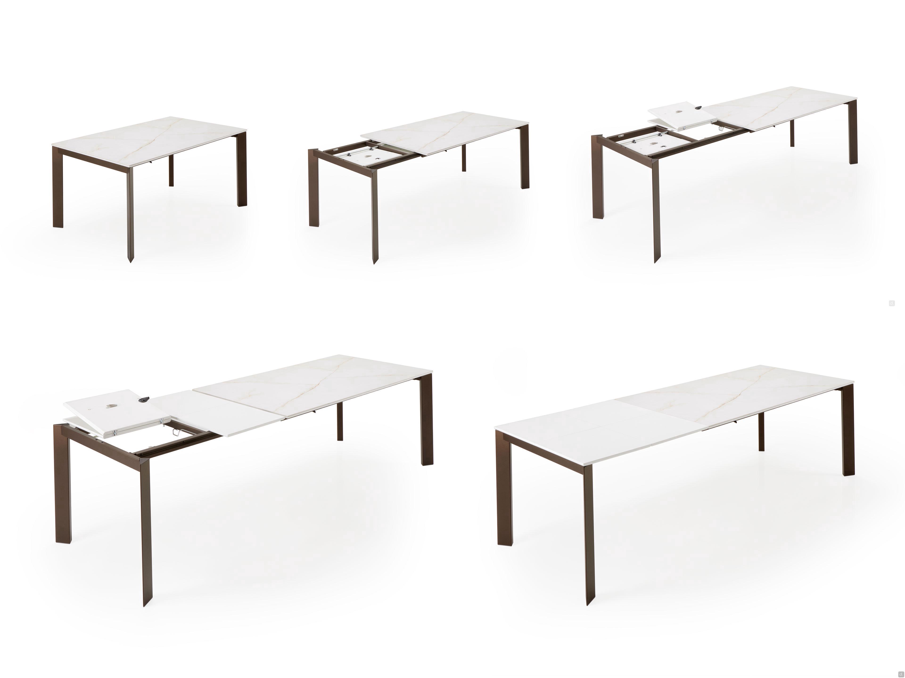 Der Ausziehmechanismus ist teleskopisch oder einklappbar, robust, aber gleichzeitig leicht und handlich und ermöglicht es, den Tisch einfach zu verlängern, um zusätzliche Sitzplätze zu schaffen. Die Verlängerungen befinden sich unter der Tischplatte und bleiben somit verborgen, wenn der Tisch geschlossen ist.