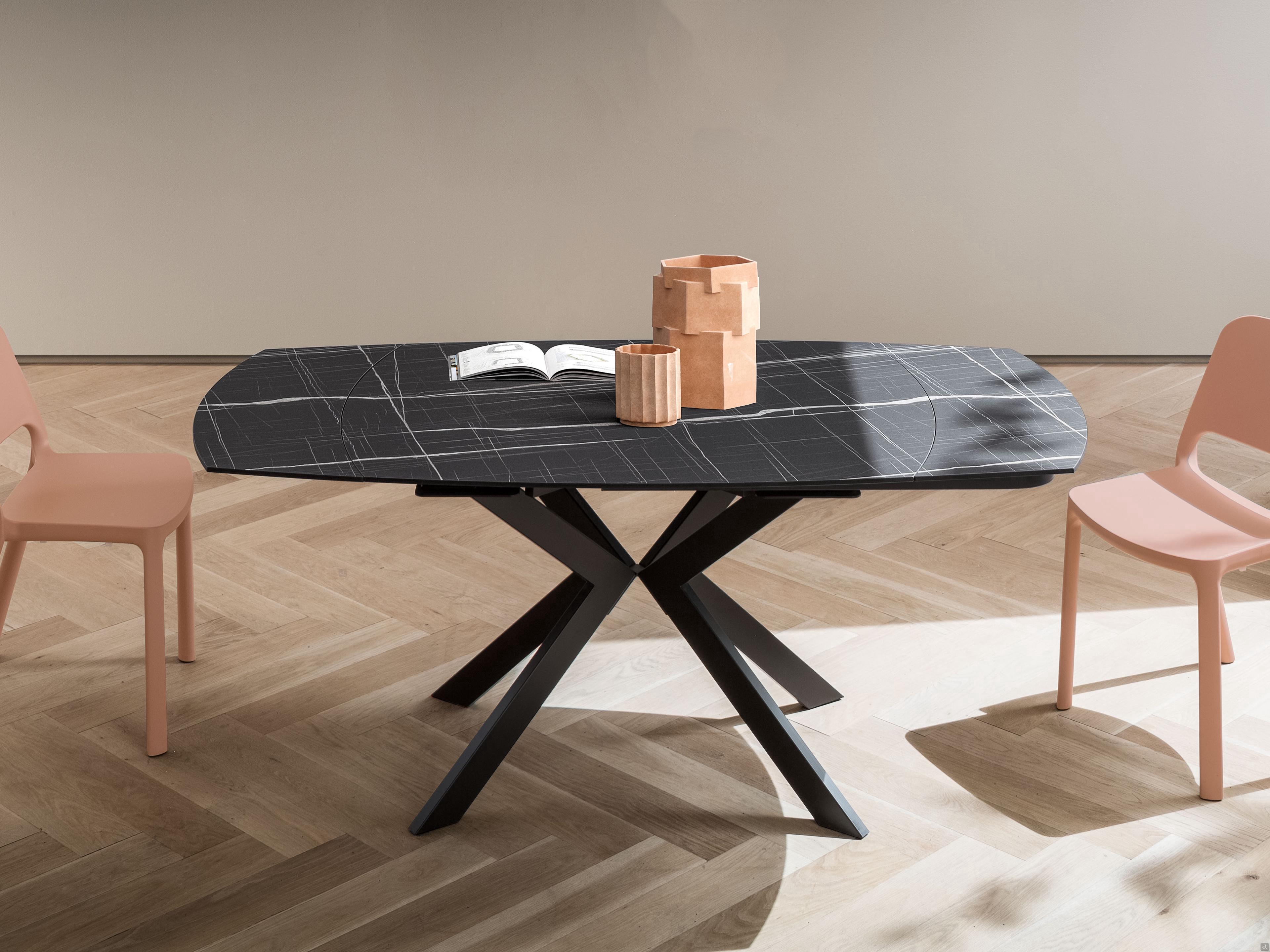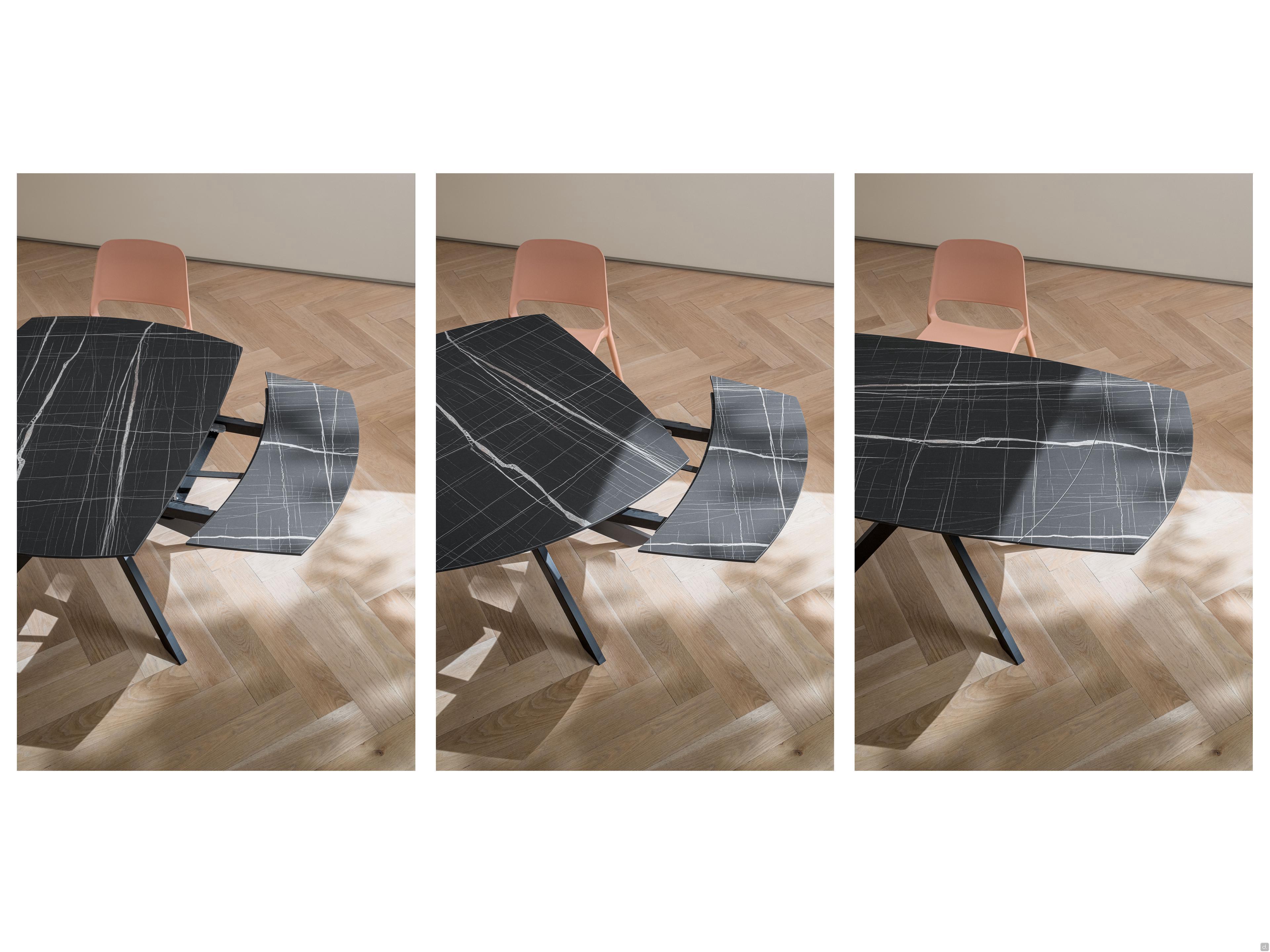 Vinci ist ein Ausziehtisch 120x90 cm mit einer rechteckigen Platte, deren Form durch die Tonnenform aufgeweicht wird und die mit einem Schwenkauszugssystem bis zu 180 cm ausziehbar ist. Als Material für die Platte stehen HPL-Schichtlaminat und Fenix-Schichtlaminat zur Verfügung, mit dem bemerkenswerten Mehrwert der Verlängerungen, die immer der Maserung der Platte folgen. Vinci zeichnet sich durch seine Vielseitigkeit aus: Er kann von einem idealen Tisch für zwei Personen in einen Tisch verwandelt werden, an dem bis zu 6 Personen bequem Platz nehmen können, auch dank der Ergonomie des Untergestells, was ihn zu einer raffinierten Lösung auch für Küchen oder Wohnzimmer macht .