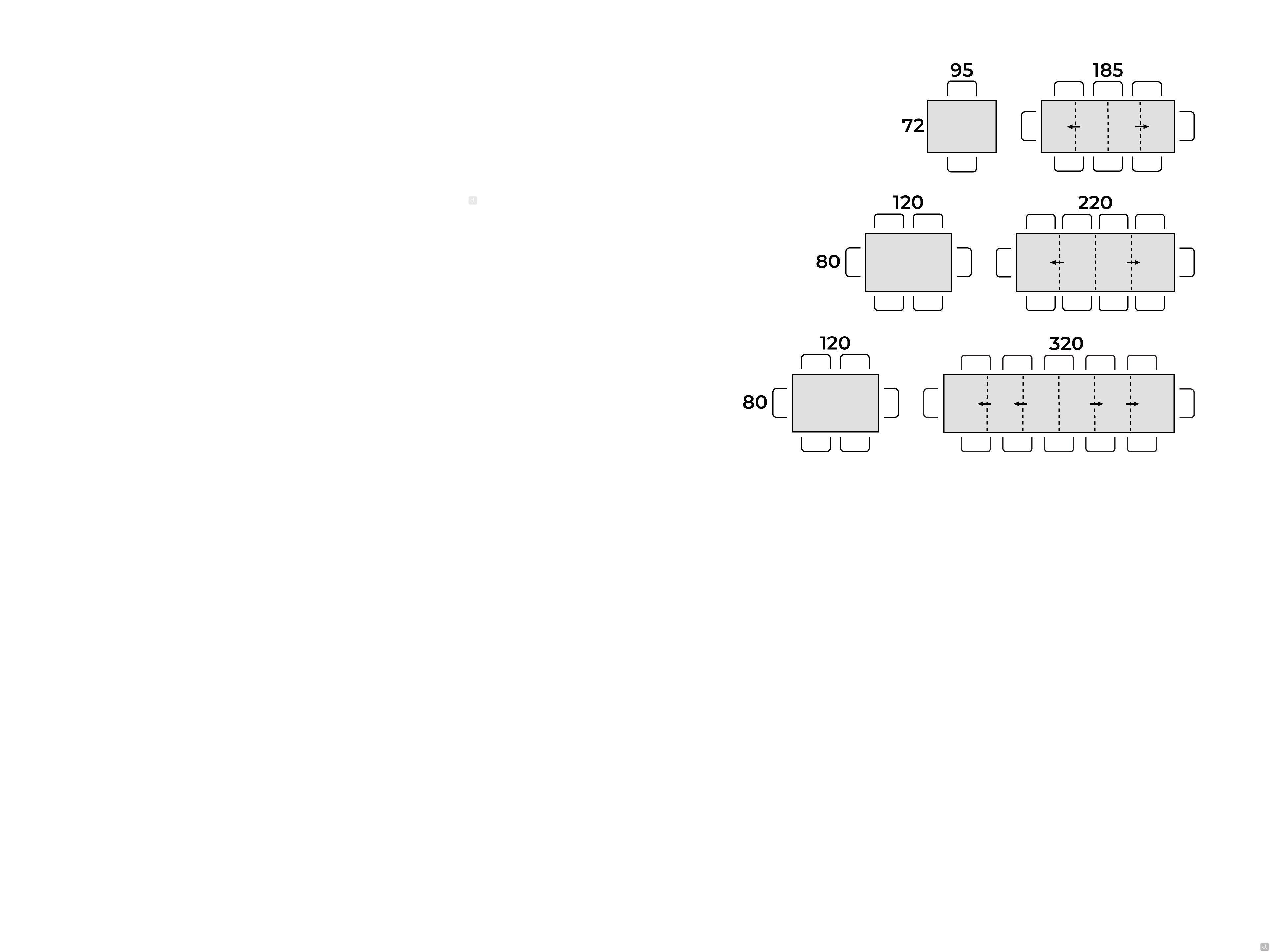 Maße- cm 95 (140 - 185) x 72; Höhe von 27 bis 81 cm- cm 120 (170 - 220) x 80; Höhe von 25 bis 88 cm- cm 120 (170 - 220 - 270 - 320) x 80; Höhe von 25 bis 76 cmPlattenstärke: 12 cm (nur für Tischplatte 95 x 72 cm: Stärke 10 cm)