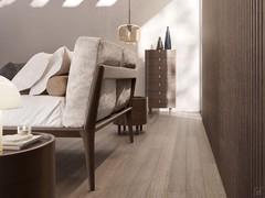 Das Bett Aries aus Massivholz mit Kissen-Kopfteil besticht auf den ersten Blick durch seine großzügigen und harmonischen Formen. Der Bettrahmen ist aus massivem Eschenholz, ebenfalls in Vintage-Ausführung, mit viel Liebe zum Detail gefertigt. An den Seiten sieht man deutlich die spezielle Senkung, die die Fugen zwischen dem Rahmen und den Füßen harmonisiert und erleichtert, wodurch ein angenehmes Spiel von einfachen und durchgehenden Linien entsteht. Im hinteren Bereich entwickelt sich das Kopfteil nach oben und wird durch den abgerundeten oberen Querbalken vervollständigt, sodass ein großer freiliegender Bereich entsteht, auf dem die Kissen zart aufliegen und einen angenehmen „Leichtigkeitseffekt“ erzeugen.