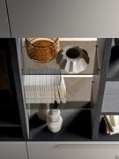 Die Ablagefächer (Türen, Vitrinen) sind nur einer Seite der Komposition zugewandt. Auf der gegenüberliegenden Seite werden feste Fronten angebracht, die zu den Türen oder der Struktur passen.