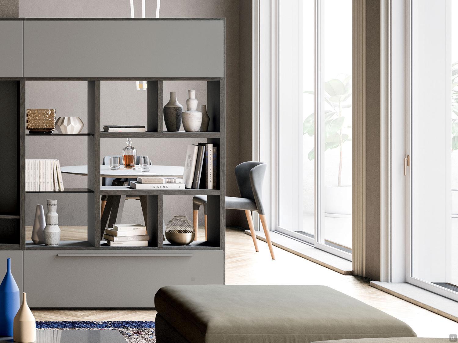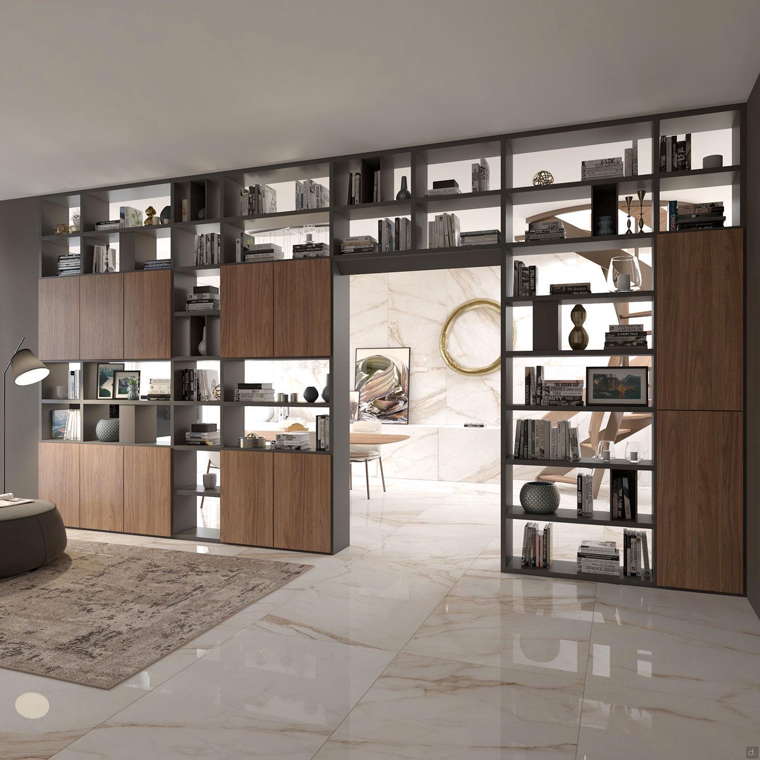 Aliant 06 ist ein doppelseitiges Überbaubücherregal, komplett mit Drehtüren, Klapptüren oder Vasistas, Vitrinen und Regalfächer. Aliant ist ein elegantes und modernes Regalsystem, das auch dank seiner zentimetergenauen Maßanfertigung in der Lage ist, der Umgebung eine große Persönlichkeit zu verleihen. Es ist ideal, um einen großen zeitgenössischen offenen Raum in zwei unterschiedliche Bereiche zu unterteilen.