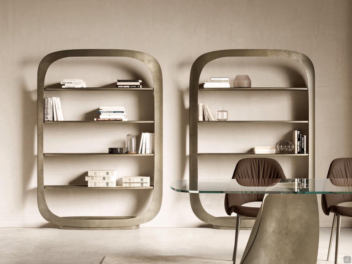Odyssey ist ein wandmontiertes Designer-Bücherregal aus Metall mit Einlegeböden aus Platin oder gebürstetem Bronze lackiertem Holz. Geschwungene Linien und abgerundete Formen charakterisieren eine Ergänzung, die das Wohnzimmer mit dem gleichnamigen Tisch vervollständigen soll. Wie die Elemente der gleichen Kollektion zeichnet sich auch das Bücherregal Odyssey durch einen lackierten Metallring aus, der so groß ist wie das gesamte Regal, in dem vier lackierte Holzböden mit einer maximalen Tragfähigkeit von je 10 kg zur Aufbewahrung von Gegenständen, Fotos, Erinnerungsstücken und Büchern untergebracht sind.Zusätzlich zur Wandmontage erhöht der zur Struktur passende Untersatz die Stabilität des Bücherregals. Die Tiefe von nur 35 cm erlaubt es, Odyssey auch in engen Fluren aufzustellen.Dieses elegante, raffinierte Bücherregal vervollständigt ein Wohnzimmer und zieht mit seinen edlen Oberflächen und kühnen Formen die Blicke auf sich.