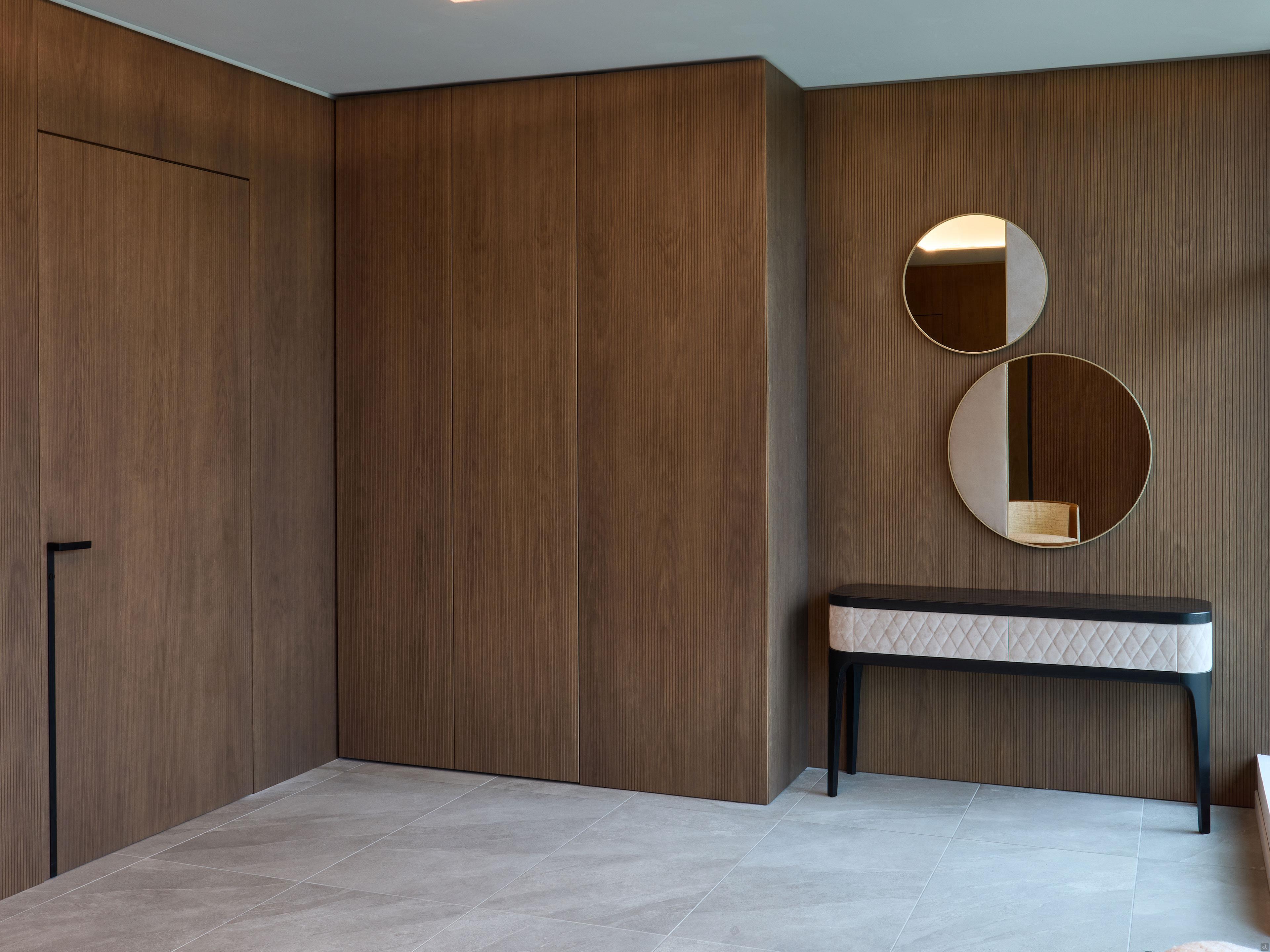Boiserie: aus 1,8 cm starkem MDF. Paneel komplett mit Material für die Wandmontage des 0,8 cm starken Technikfachs. Die Paneele können einfarbig oder individuell gestaltet werden (nur in matt lackierter oder offenporiger Eiche):