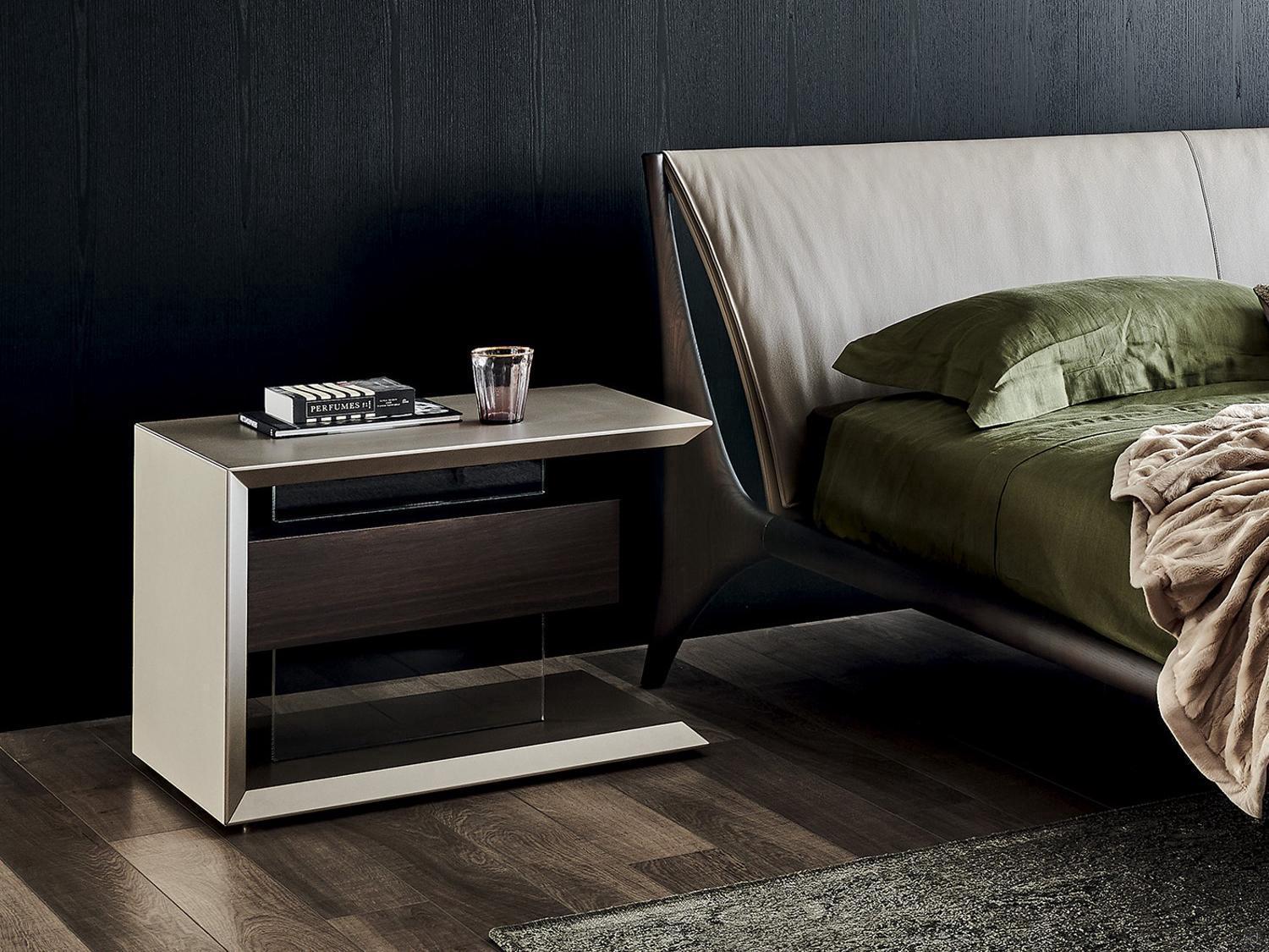 Biagio von Cattelan ist ein Designer-Nachttisch mit einer Schublade in Canaletto-Nussbaum oder gebrannter Eiche. Biagio zeichnet sich durch seine charakteristische C-förmige Struktur aus gaufriert lackiertem Holz aus, die in drei Farben erhältlich ist, sowie durch eine scheinbar schwebende Schublade, die, auf einer transparenten Trennwand montiert ist. Das besondere Spiel der Zwischenräume erzeugt eine sehr suggestive Wirkung. Die Elemente der Struktur sind mit einer 45°-Eckverarbeitung versehen, ein Detail, das, auch dank der Lackierung, die klaren definierten Linien hervorhebt und die große Sorgfalt bei der Verarbeitung und die Liebe zum Detail zeigt. Biagio ist sehr vielseitig und optisch auffällig und eignet sich perfekt für große Schlafzimmer mit modernen und besonderen Ausstattungsmerkmalen. Die linke oder rechte Seite des C-Elements kann bei der Montage gewählt werden.