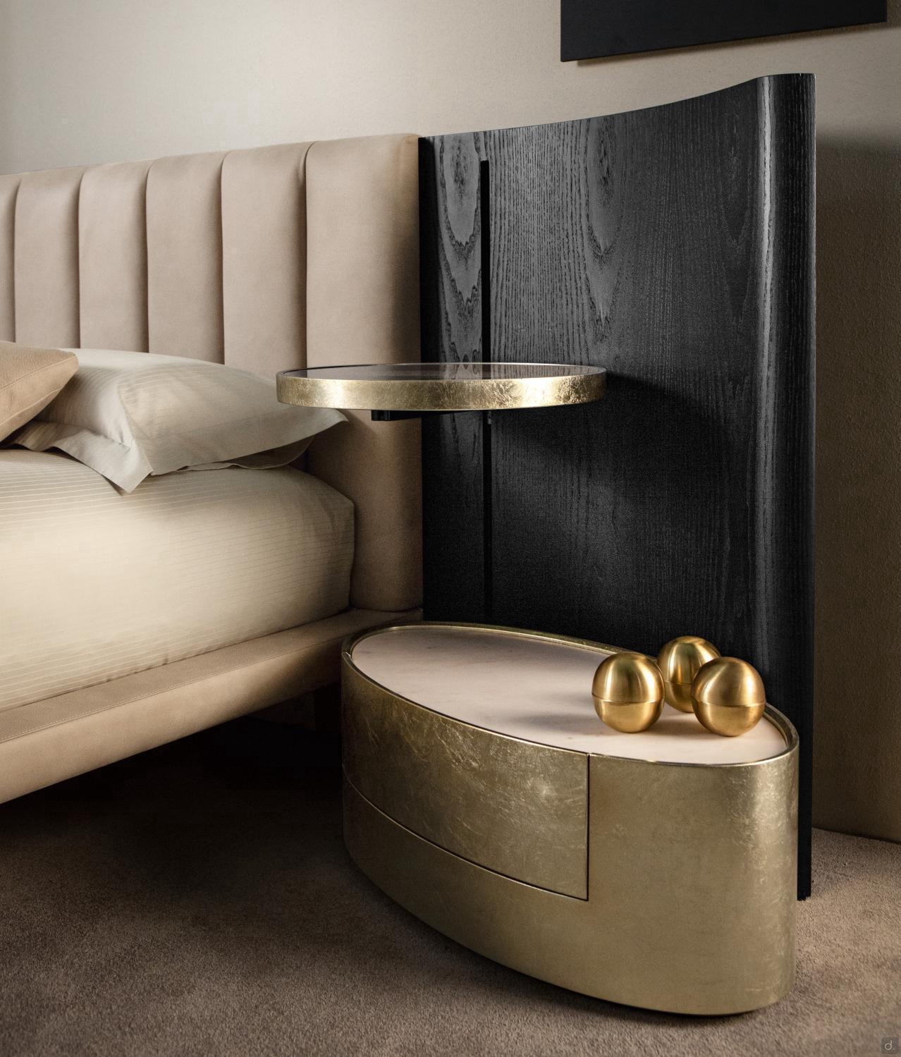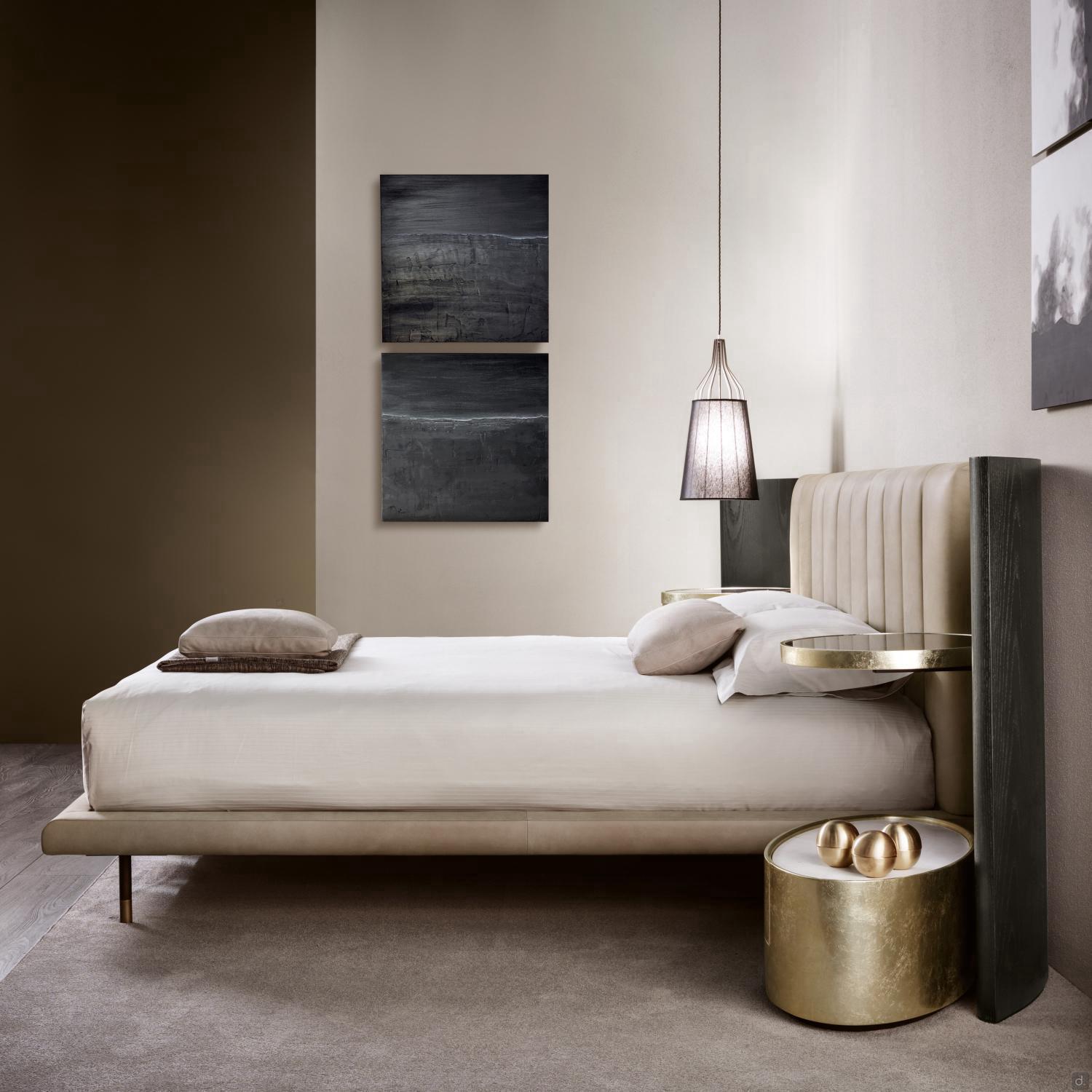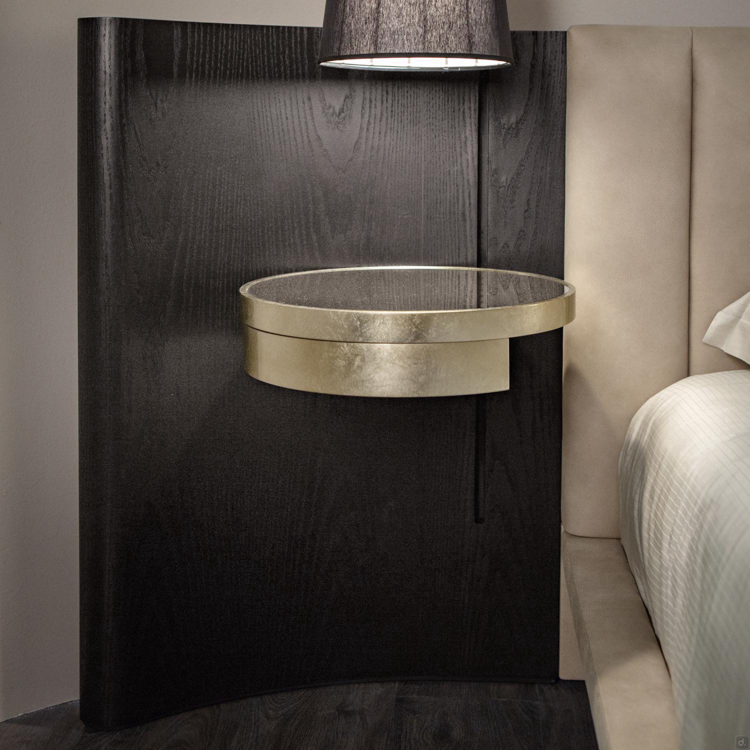 Das charakteristische Element des Bettes sind die seitlichen Holzflügel, die leicht nach innen gewölbt sind, um einen besonderen Umhüllung-Effekt zu erzielen. Die Flügel haben eine vertikale Ausfräsung für das Einsetzen von Nachttischplatten, die in 2 Modellen erhältlich sind: einfach oder mit Schublade.