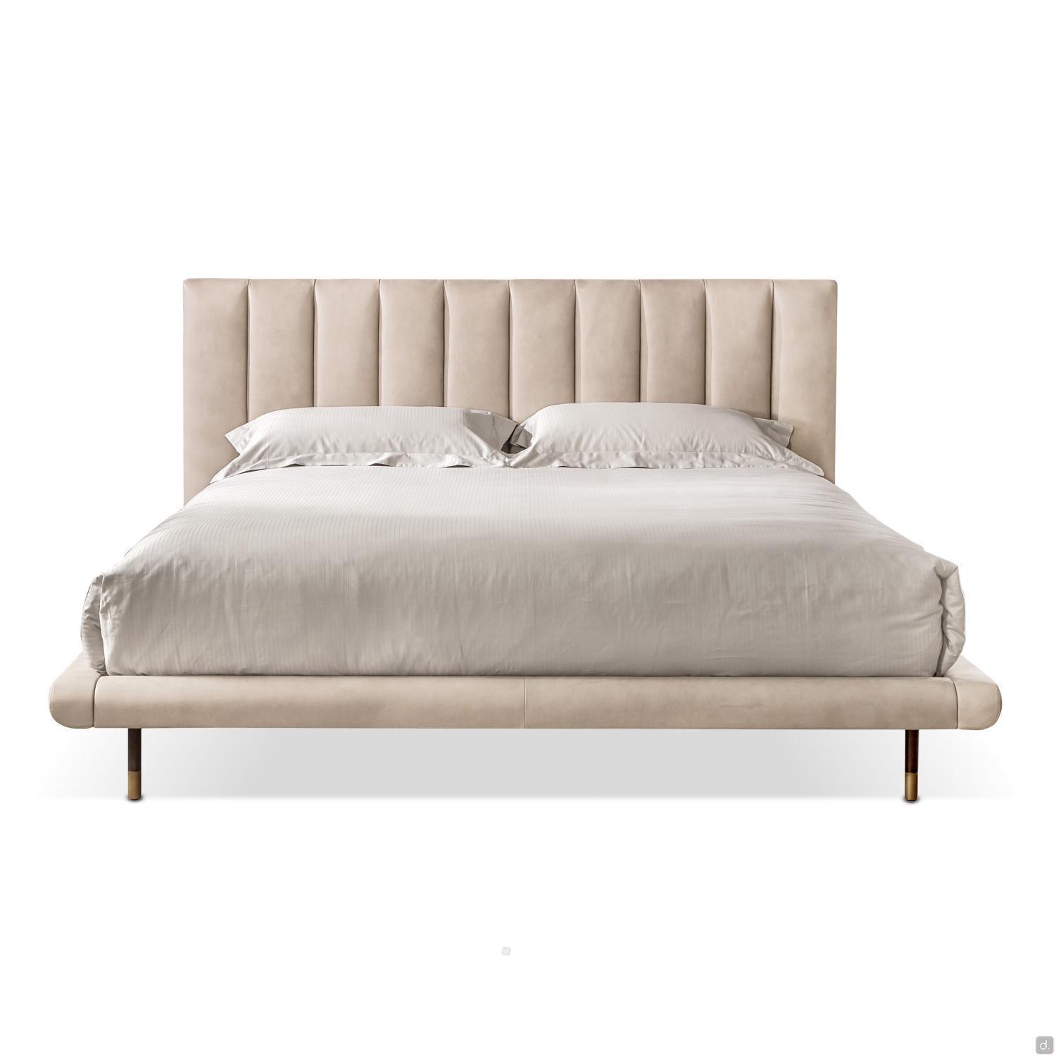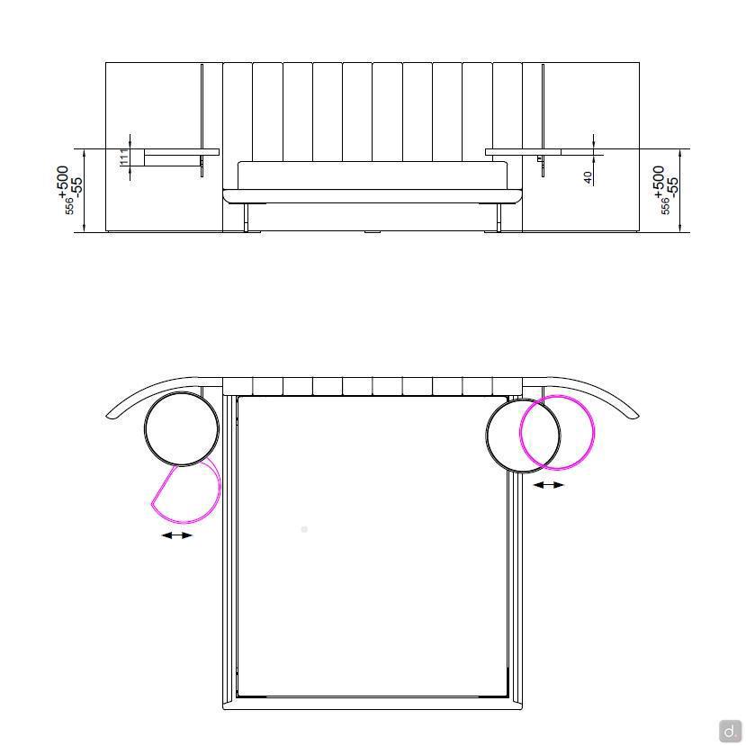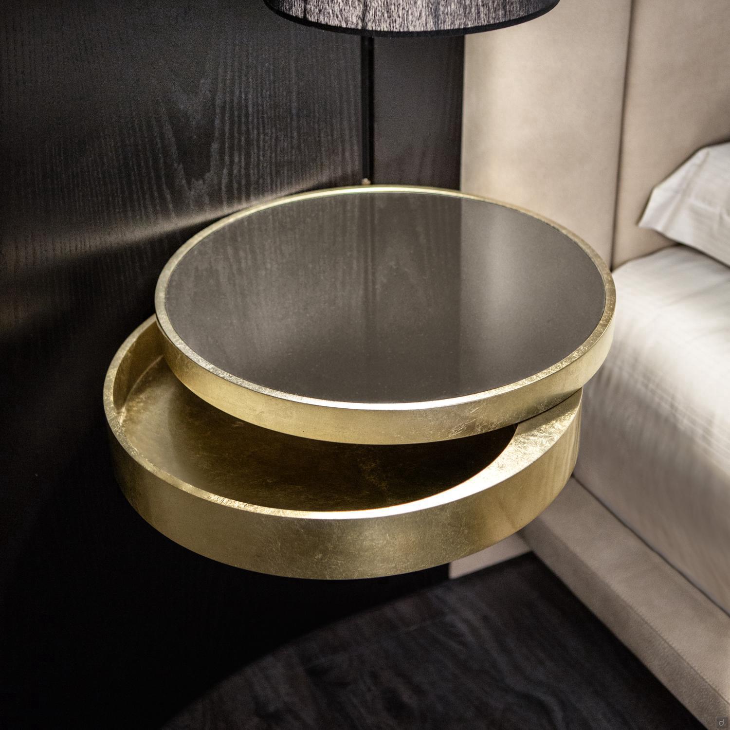 Das charakteristische Element des Bettes sind die seitlichen Holzflügel, die leicht nach innen gewölbt sind, um einen besonderen Umhüllung-Effekt zu erzielen. Die Flügel haben eine vertikale Ausfräsung für das Einsetzen von Nachttischplatten, die in 2 Modellen erhältlich sind: einfach oder mit Schublade.