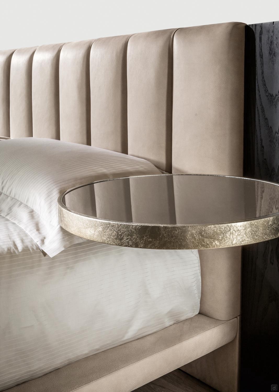 Mirage von Cantori ist ein Doppelbett mit Seitenablagen und Bezügen aus Stoff, Samt, Kunstleder oder Leder.