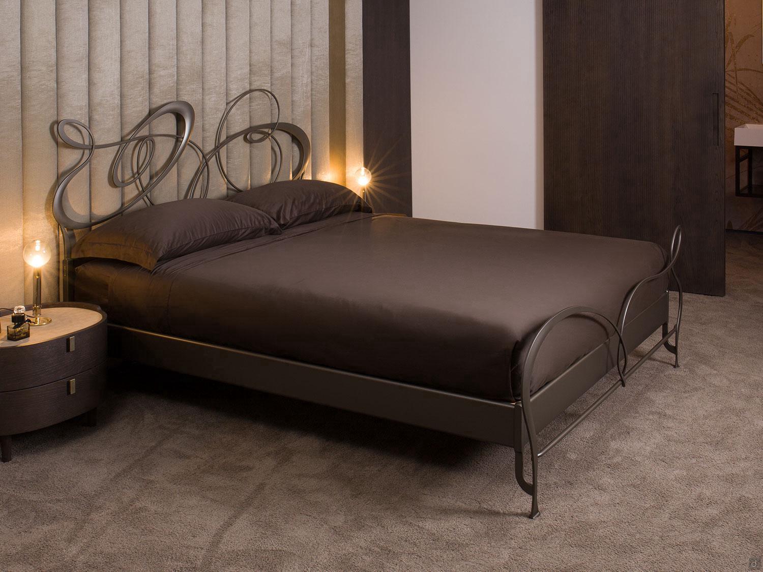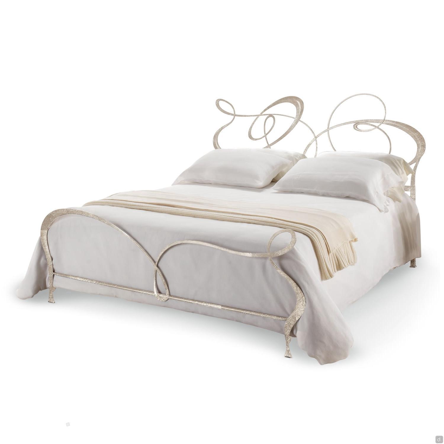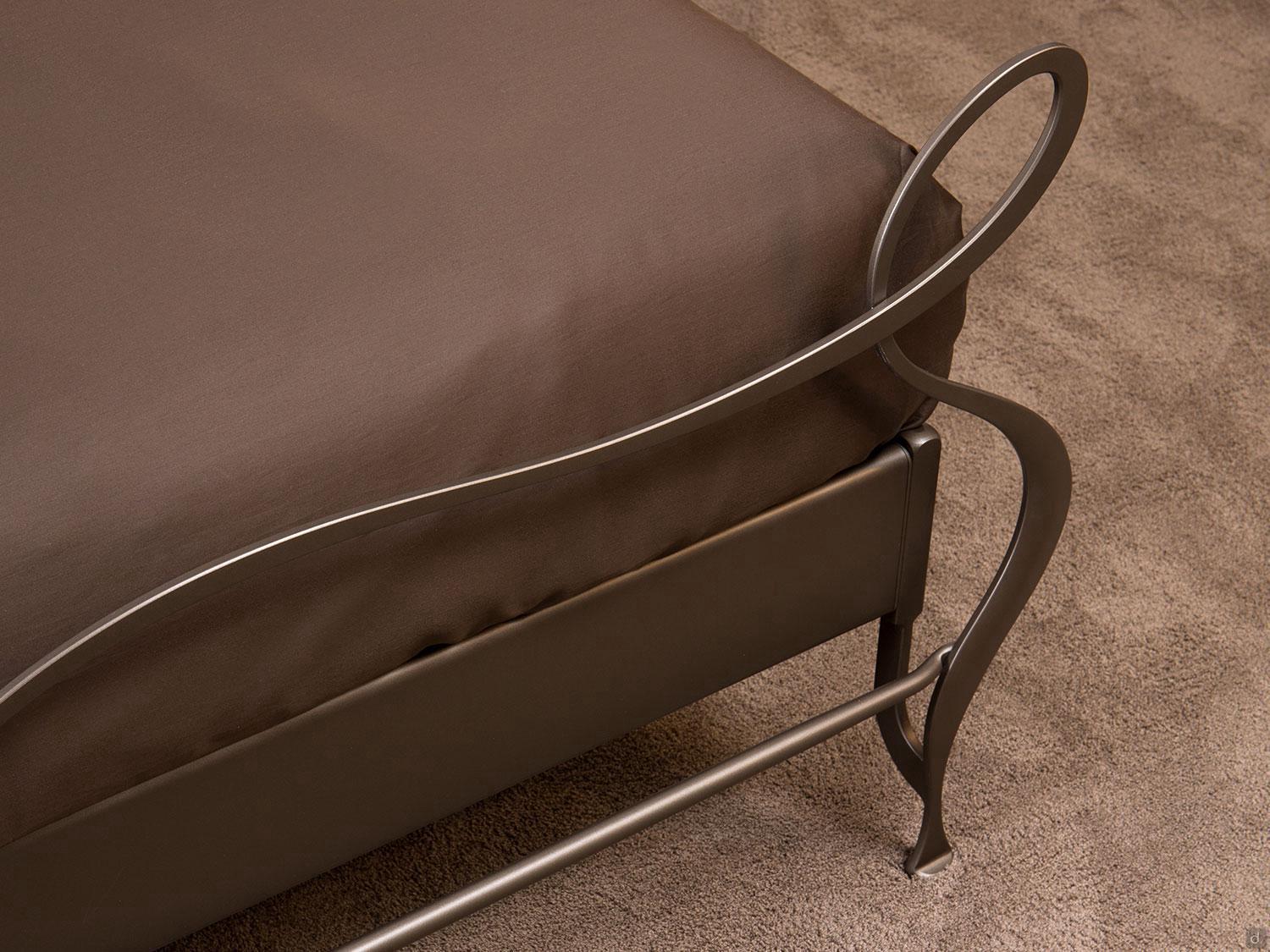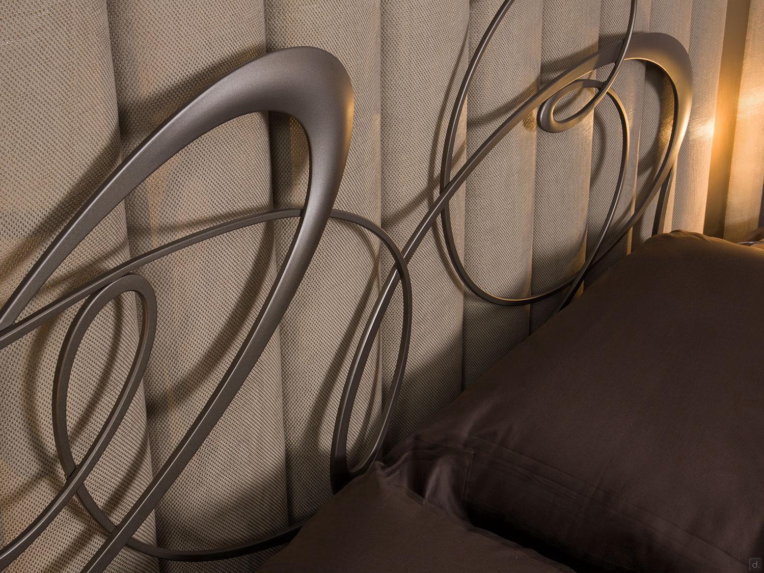Die Struktur besteht vollständig aus Laser geschnittenem, poliertem und Hand bearbeitetem Schmiedeeisen in einer breiten Palette von Ausführungen von Silber bis hin zu glänzend lackiert. Die Version mit Staukasten ist mit einem mit Stoff, Kunstleder oder Leder bezogenen Bettrahmen ausgestattet.