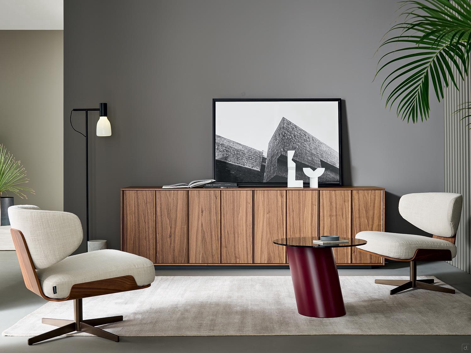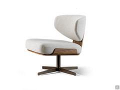 Olos von Bonaldo ist ein Lounge-Drehsessel im nordischen Stil, der seinen essenziellen, aber soliden und raffinierten Charakter zum Ausdruck bringt. Der breite und bequeme Sitz besteht aus einem dichten Kissen, während die umhüllende Rückenlehne dank ihrer geschwungenen Form, die den Gast fast zu umarmen scheint, hervorragenden Halt bietet.Sitz und Rückenlehne werden von einem massiven Holzrahmen getragen, wahlweise in Nussbaum oder Eiche, der die edle Holzmaserung an den Seiten und am Rücken dezent zur Geltung bringt. Der drehbare Fuß mit vier Metallspeichen vervollständigt die geschwungene Silhouette und bietet reichlich Bewegungsfreiheit.