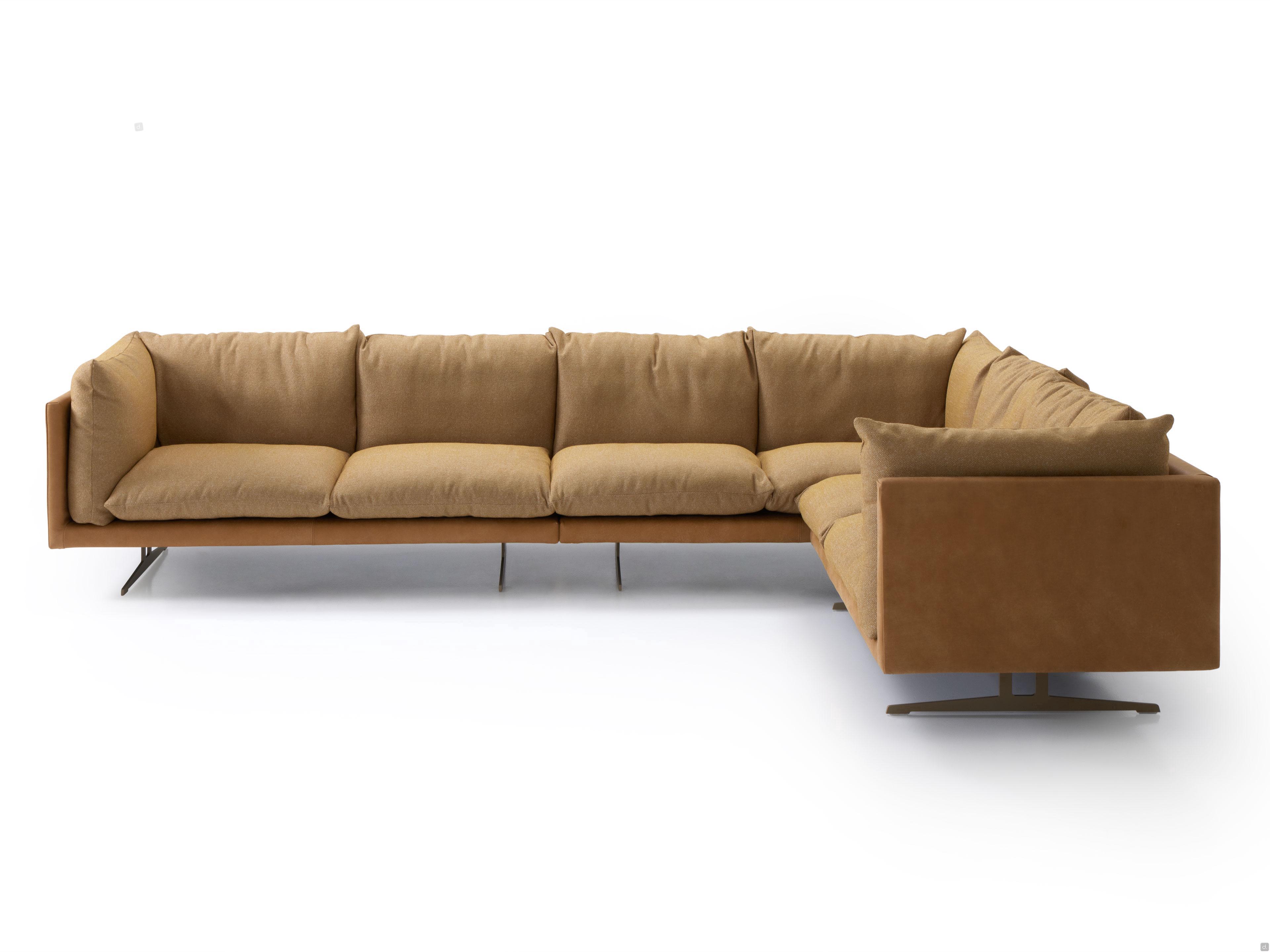 Aker outlet ist ein Designer-Ecksofa mit Federkissen, das sich durch seine markanten hohen Füße aus lackiertem Metall auszeichnet. Die weiche Polsterung der Kissen mildert die strengen Linien der Basisstruktur. Aker ist ein Sofa mit einer informellen Sitzfläche und unstrukturierten Rückenlehnen, das eine weiche und einladende Ausstrahlung hat.Es ist in einer zweifarbigen Ausführung erhältlich: Die Schale ist mit einem fein genarbten Leder bezogen, das halbglänzend aussieht und sich seidig anfühlt; die Sitz- und Rückenkissen aus Federn sind mit einem wasserabweisenden, schmutzabweisenden Gewebe mit weichem Griff bezogen.Aker Outlet fügt sich perfekt in jede Einrichtung ein und ist die perfekte Lösung, um Ihren Wohnbereich durch einen Hauch von Design einzigartig zu machen.