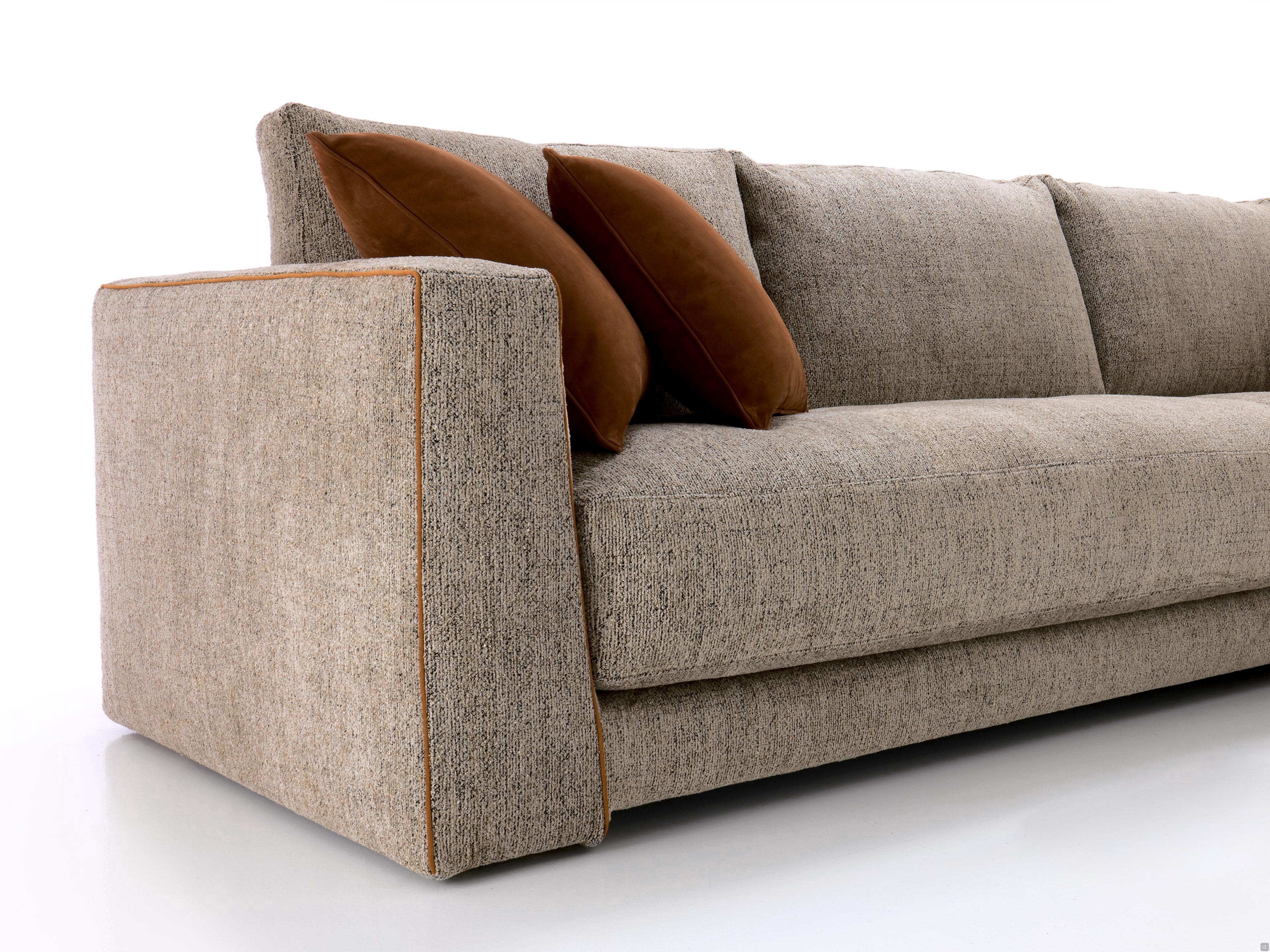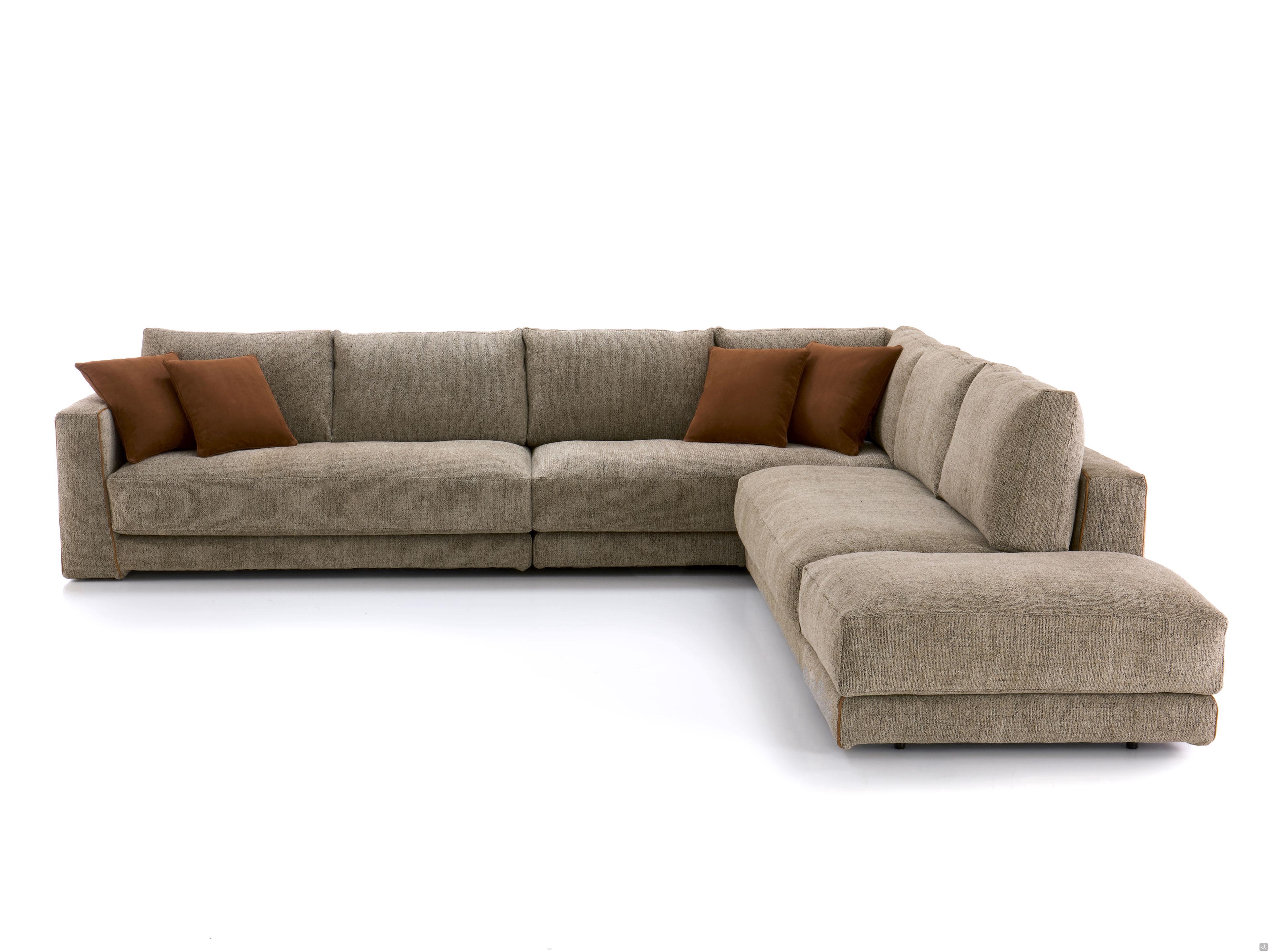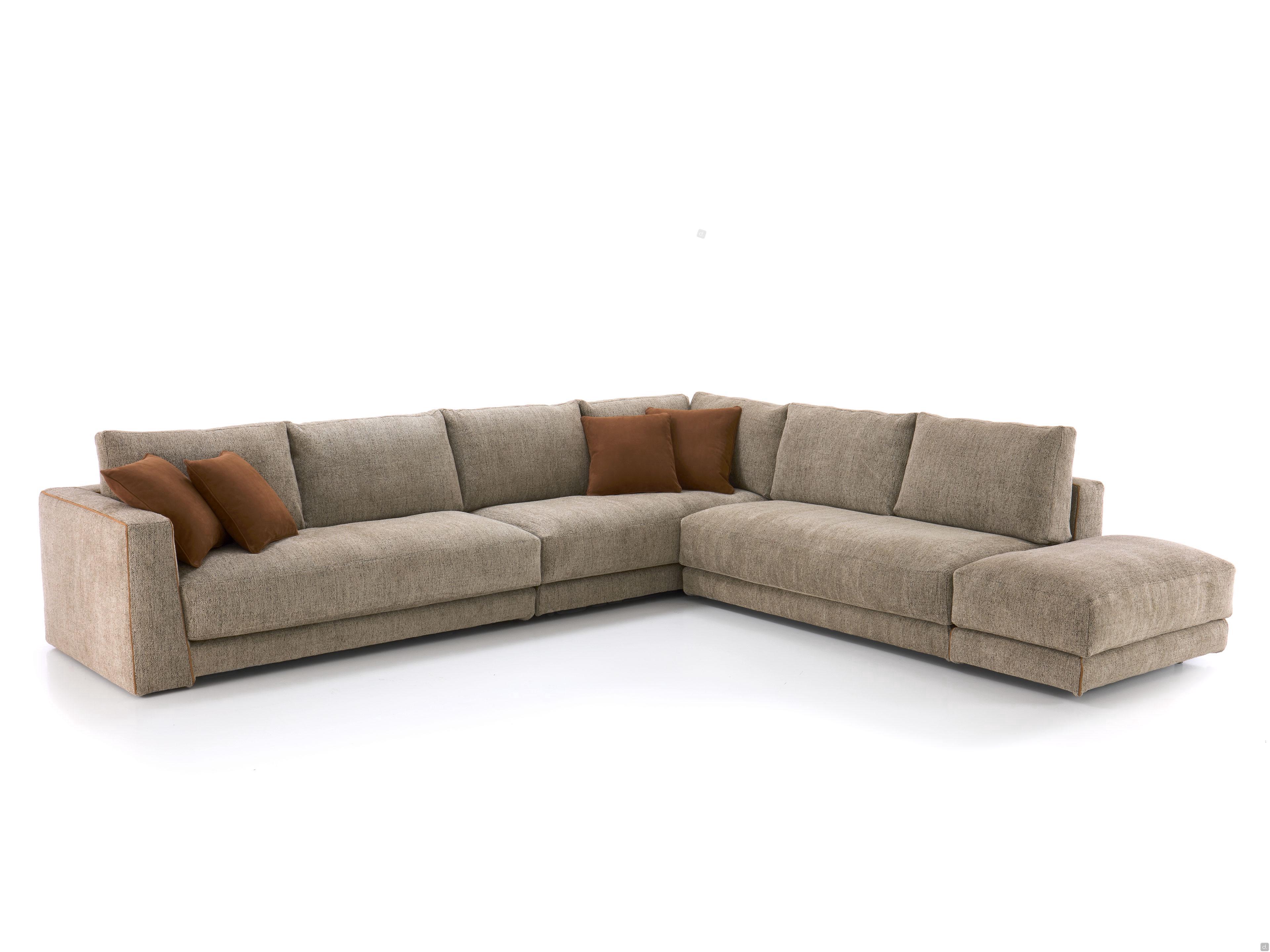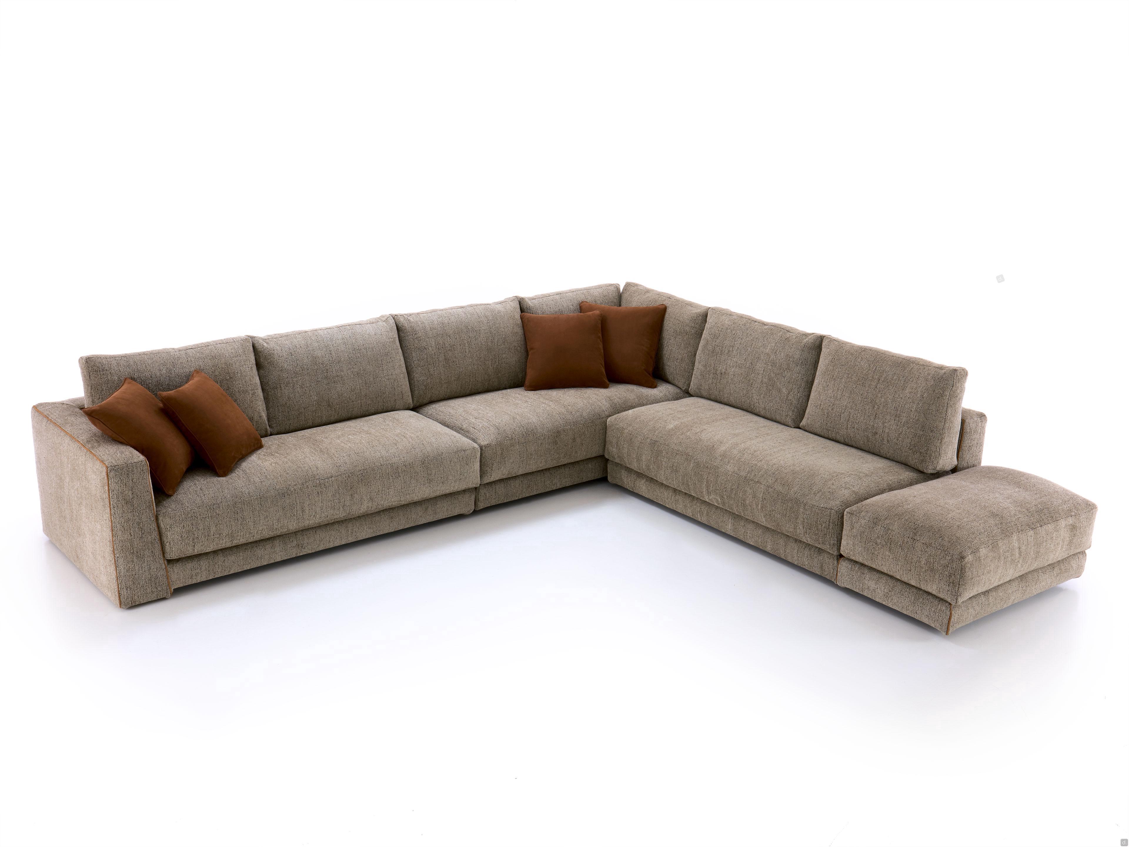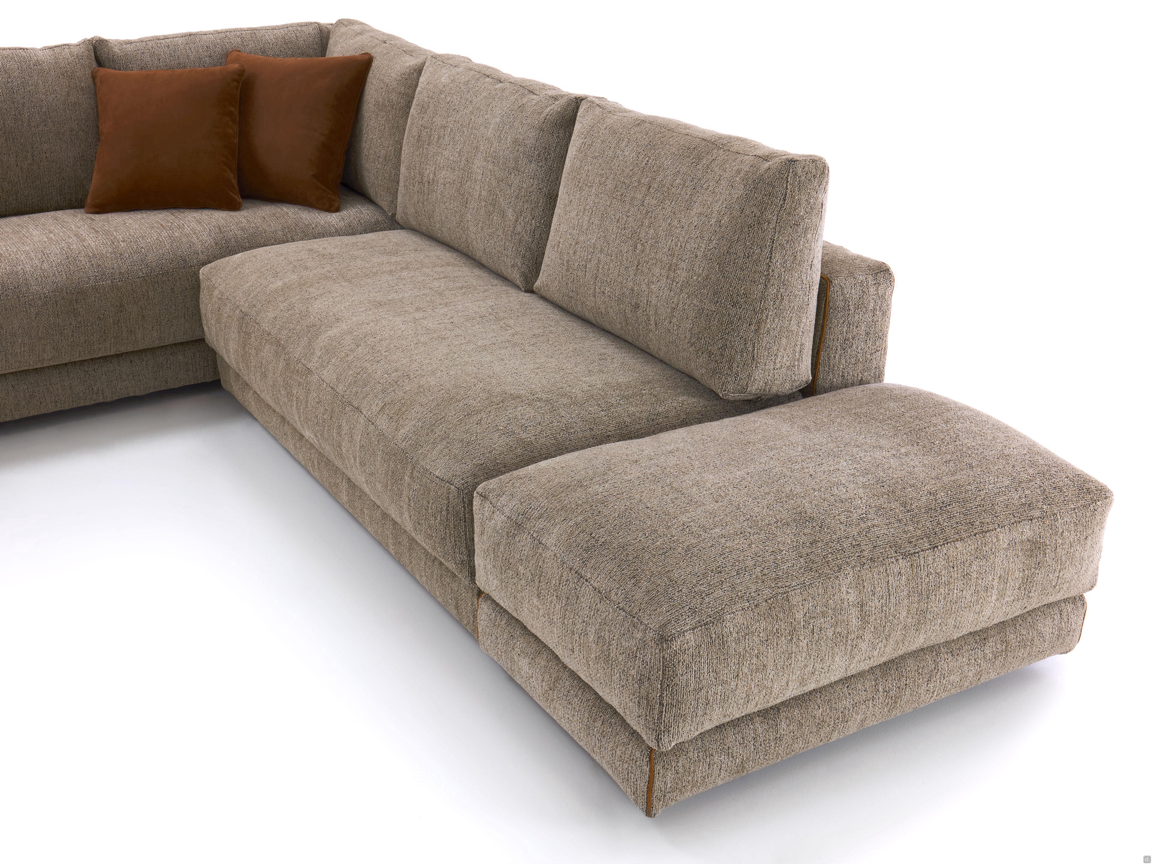 Clive Outlet ist ein Ecksofa mit Daunenkissen, das sich durch eine hohe Armlehne mit linearem Design und leicht ausgestellter Form auszeichnet. Clive ist ein besonders bequemes und geräumiges Sofa mit gut proportionierten Volumen und niedrigen, versenkbaren Füßen. Der hohe Komfort wird durch die Gänsedaunenpolsterung der Sitzkissen mit Einsätzen aus formbeständigem Schaumstoff für mehr Tragfähigkeit und Widerstandsfähigkeit sowie durch die Federung aus geflochtenen Gummibändern gewährleistet, die für die richtige Stützkraft sorgen. Die Armlehnen und die Rückenlehnen mit ihrem kantigen und strengen Design sind mit Rückenlehnen aus 100 % kanalisierten Federn ausgestattet, die optimalen Komfort bieten.Es wird in einer Eckkomposition für 7/8 Personen angeboten und verfügt über eine offene Seite, die mit einem bei Bedarf verschiebbaren Pouf endet. Clive Outlet ist ein Sofa, das Schneiderkunst und Liebe zum Detail vereint, was sich in den handwerklichen Kontrastnähten widerspiegelt, die seine Struktur konturieren.Der zeitlose Stil macht Clive Outlet zu einem Sofa, das sich sowohl für klassische Wohnzimmer als auch für große, moderne Wohnbereiche eignet, die zahlreiche Sitzgelegenheiten und viel Platz zum Entspannen erfordern.