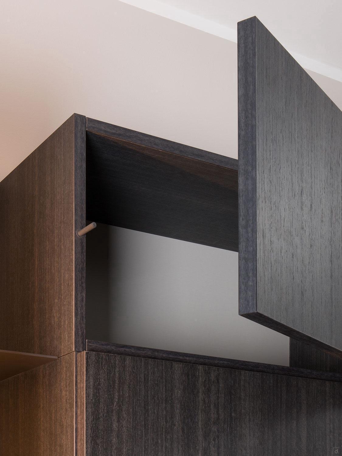 - Aufklappbare Kästen: n.1 Aufhängerohr aus moka-glänzend lackiertem Metall + n.2 Holzeinlegeböden passend zur Innenausstattung (Schrankversion) oder n.5 Glasböden + n.1 Einlegeboden passend zur Innenausstattung (Basisversion).