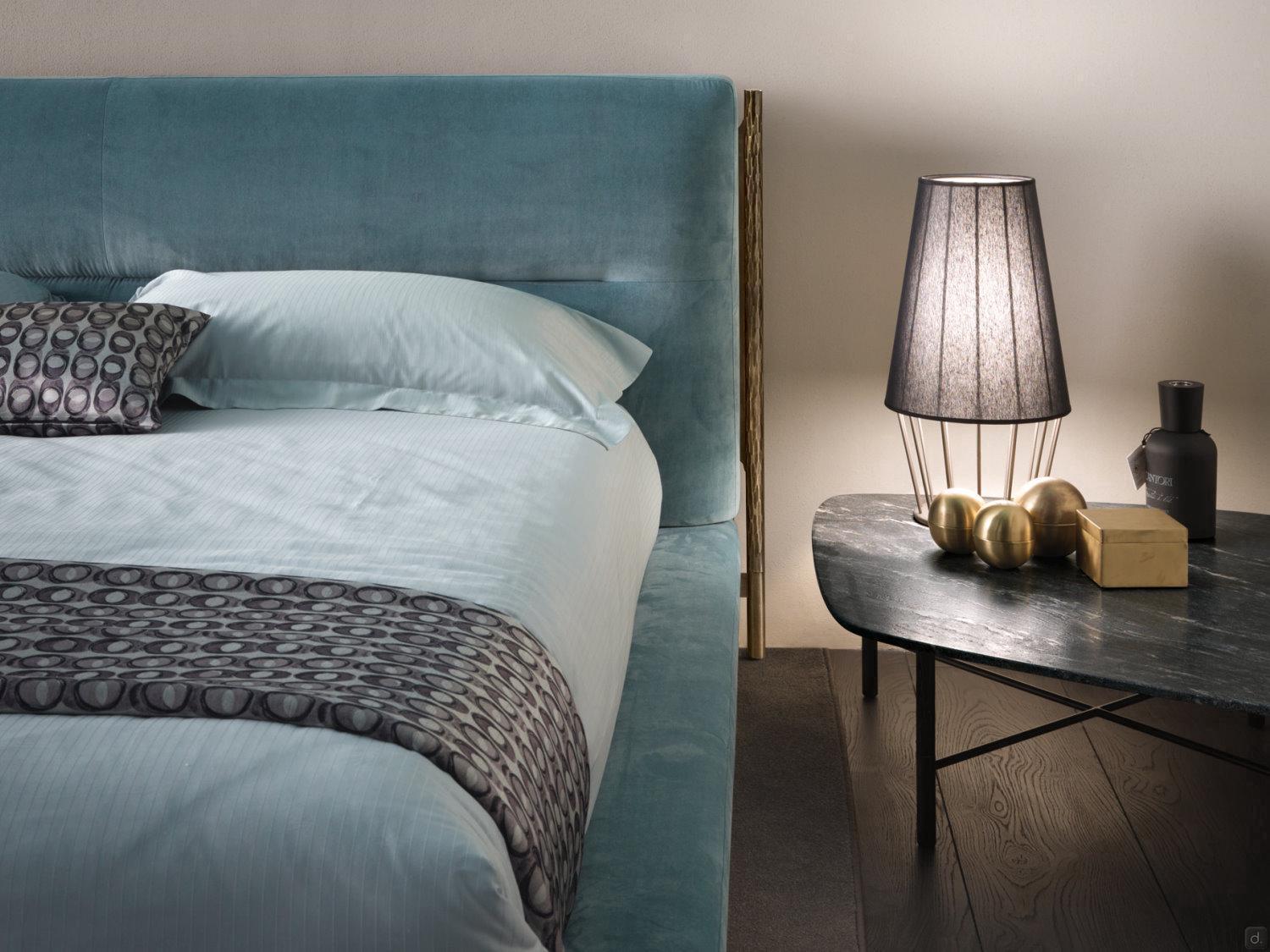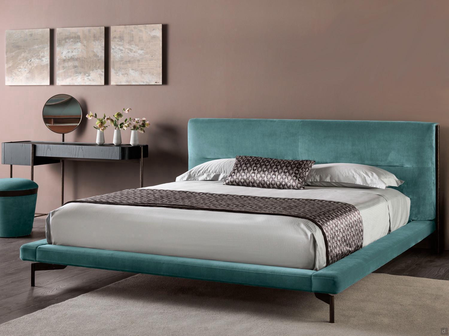 Das Kopfteil hat eine strenge Linie, die nur auf halber Höhe durch eine Naht abgeschwächt wird, die die Kontinuität der gepolsterten Fläche unterbricht. Der schlanke Bettrahmen ist ebenfalls gepolstert und für einen leichten Effekt vom Boden abgehoben.