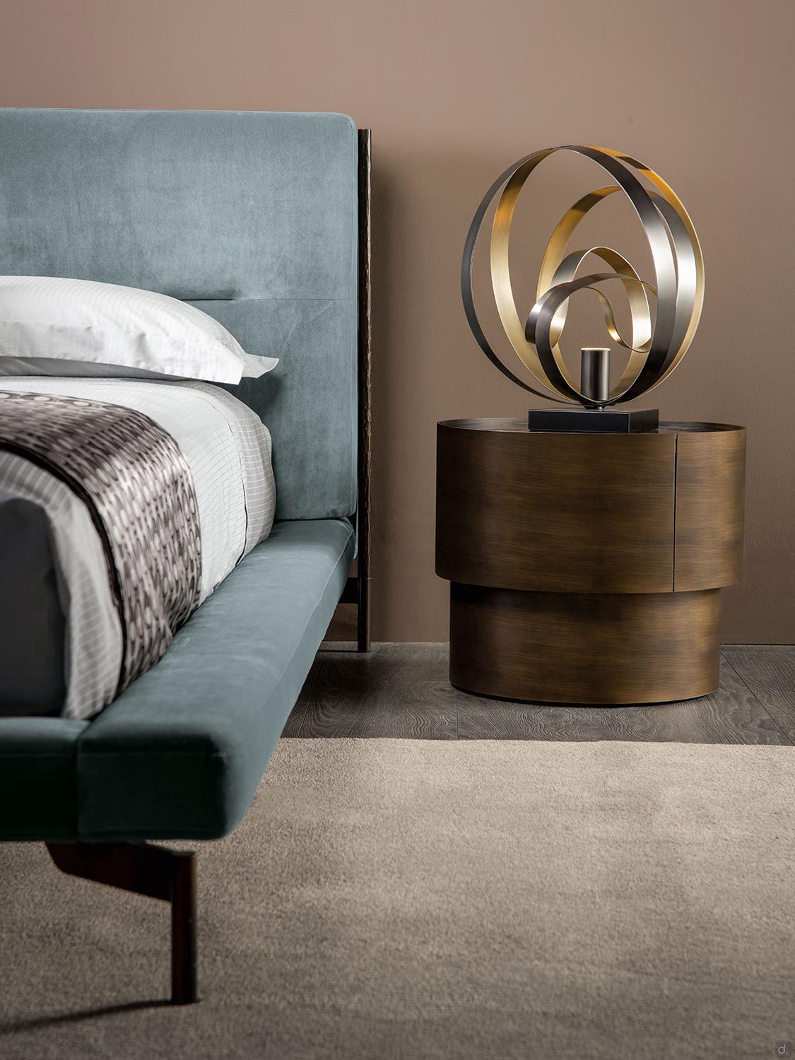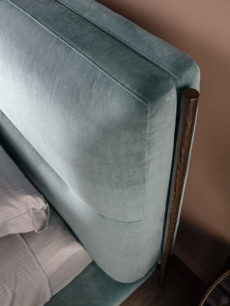 Shanghai von Cantori ist ein gepolstertes Bett mit einem schmiedeeisernen Rahmen, der von Hand geschmiedet und facettiert wurde. Die scheinbar essentiellen Linien des Bettes werden durch ein massives Schmiedeeisenrohr mit metallisierter oder bronzierter Oberfläche verschönert, das die Seiten des Kopfteils vertikal abgrenzt und gleichzeitig die hohen Metallfüße des Bettes bildet. Schmiedeeisen in moderner Form ist das Element, das das Bett Shanghai auszeichnet und seinen Wert als italienisches Design-Möbelstück von Cantori bestätigt.