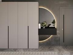 Die hängende Eingangsschublade Heritage bietet eine förmliche und funktionelle Lösung für Eingangsbereiche, die Hochwertigkeit und Liebe zum Detail ausdrücken sollen. Erhältlich in zentimetergenauen Breiten, wird er einzeln angeboten, im Breitenbereich von 59 bis 89 cm, und doppelt mit nebeneinander stehenden Unterschränke, von 119 cm bis zur maximal verfügbaren Breite von 179. Was ins Auge springt, ist zweifellos die besondere Verarbeitung der gefrästen MDF-Vorderseiten, die maschinell hergestellt werden. Die Lamellenvorderseiten verleihen der Aussicht eine große szenische Schönheit, die durch den Wechsel von leeren und vollen Fräsungen entsteht. Die wandhängenden Unterschränke sind komplett lackiert und können in allen verfügbaren RAL oder Sikkens Farben hergestellt werden. Das obere Profil der Vorderseite, das mit einem 45°-Schnitt versehen ist, dient als Öffnungssystem mittels einer Nut, um das Design geradlinig und schlicht zu halten. Ein Höchstmaß an Qualität wird durch die Verwendung des Julius-Spiegels erreicht, der auch nach Maß angefertigt werden kann und zur Vervollständigung des Eingangsbereichs mit Halbmondformen" entwickelt wurde, die unten oder oben an den Hängeelementen angebracht werden können.