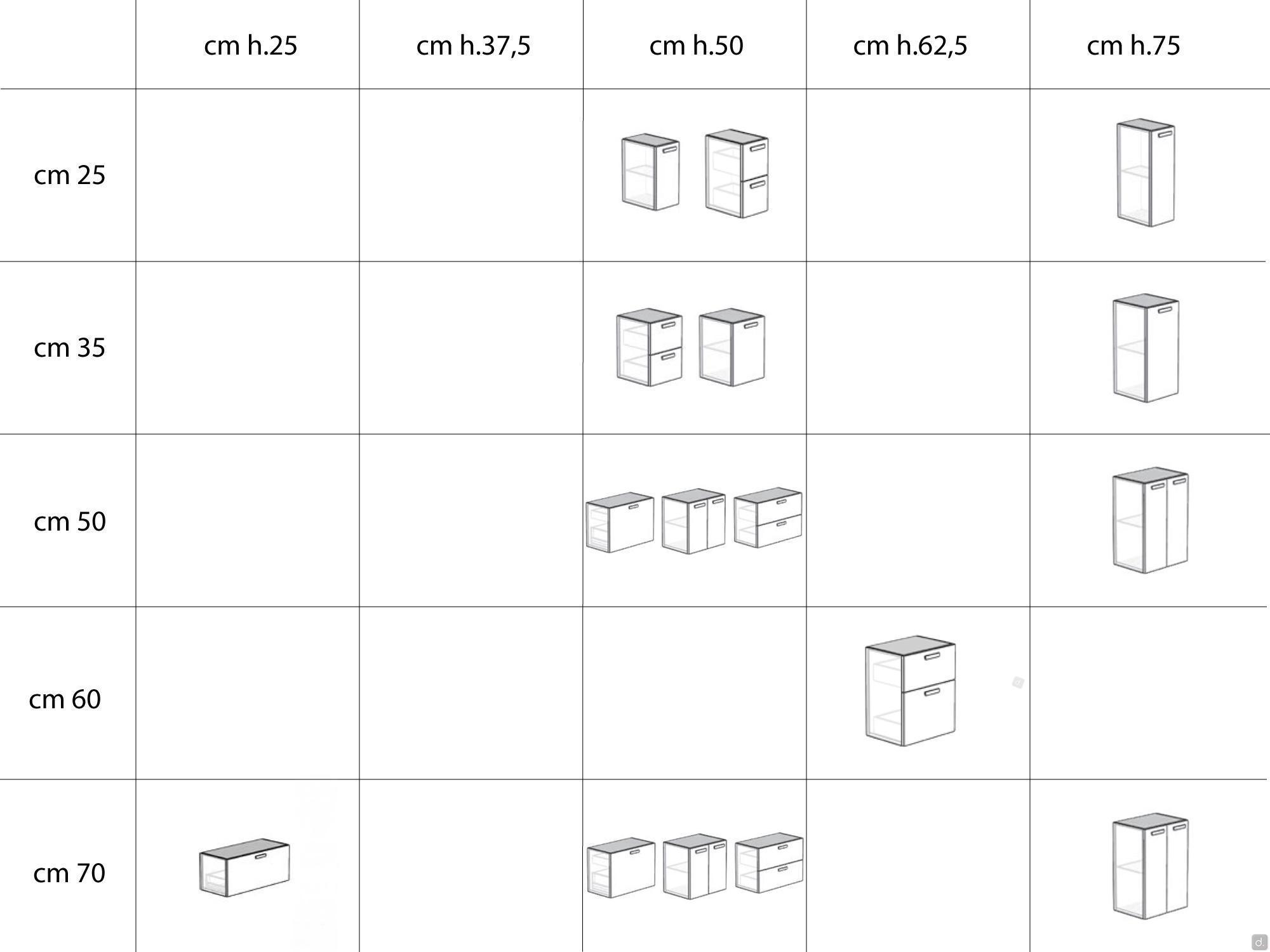 Der wandhängende Badunterschrank Atlantic T.62 ist in zahlreichen Modellen erhältlich, die sich in Breite, Höhe und Zusammensetzung unterscheiden. Er ist mit Flügeltüren, Körben und Schubladen erhältlich und lässt sich durch die Wahl der Oberflächen und Farben sehr individuell gestalten. Der wandhängende Unterschrank Atlantic p.62 ist die perfekte Lösung für alle, die viel Platz haben wollen, ideal für die Vervollständigung moderner Badmöbel, in Kombination mit anderen Elementen derselben Familie. Hier wie auch bei den anderen Tiefen erfolgt die Positionierung bei den Modellen mit einer Höhe von 25 cm und 37,5 cm hängend, bei den anderen Höhen auf dem Boden, wobei zwischen verschiedenen Modellen von geformten, rechteckigen oder quadratischen Füßen und dem Sockel gewählt werden kann. Unter den verschiedenen Arten von Öffnungen finden wir das klassische Push-Pull-System, die Rille, das "L"- oder "U"-Metallprofil und zahlreiche Modelle von Griffen.