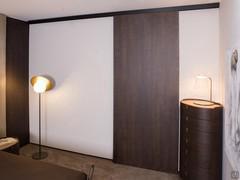 Die Schiebetür ist so konzipiert, dass sie sich perfekt mit allen Lounge-Möbeln der Tag- und Nachtkollektion kombinieren lässt: Die Materialien, Ausführungen und Farbtöne sind die gleichen. Auch die Außenseite der Tür kann mit Metalleinsätzen, geometrischen Fräsungen oder aufgesetzten Leisten bearbeitet werden, so dass die Einheit mit den Schränken und der Boiserieverkleidung gewährleistet ist.