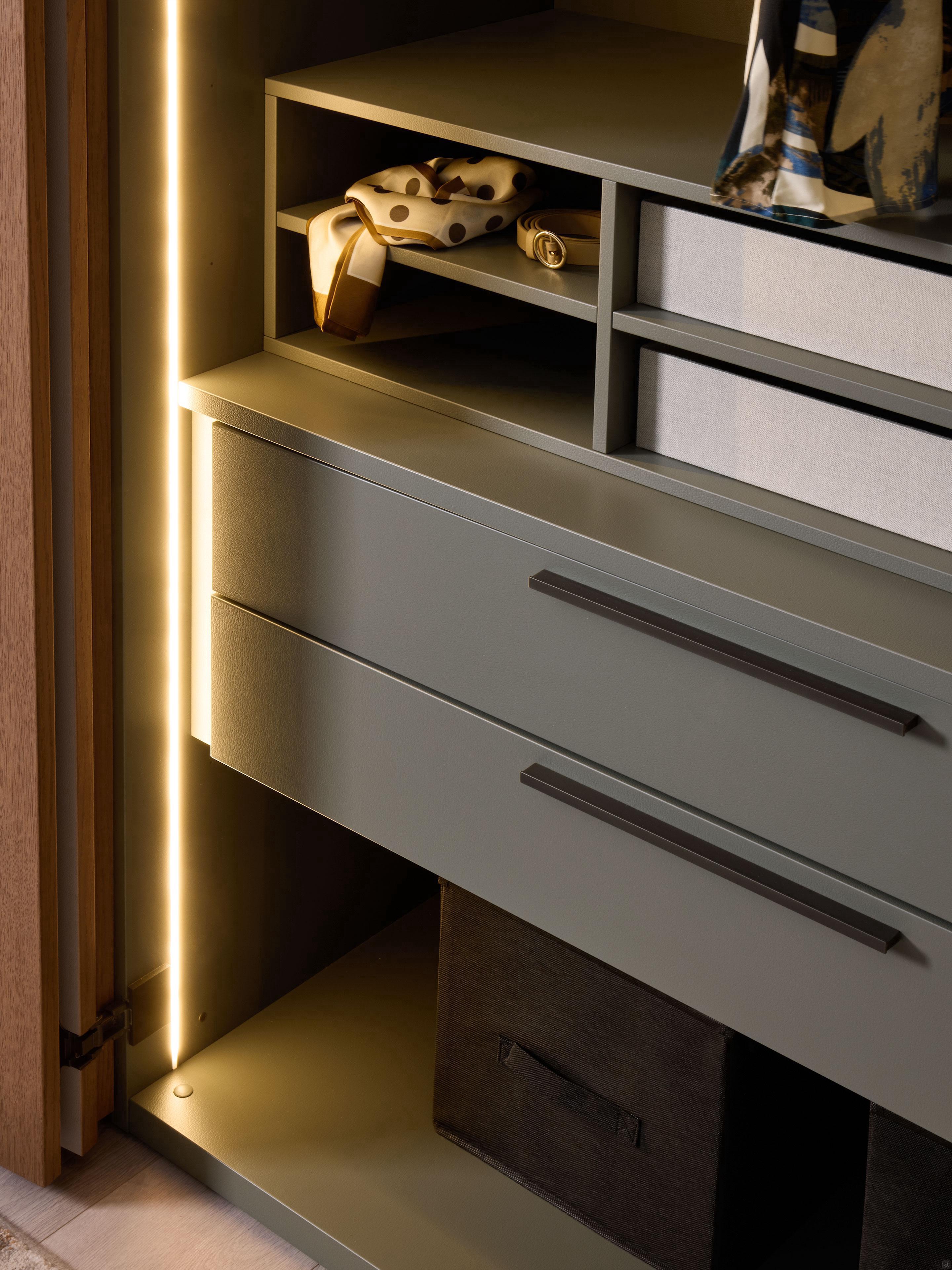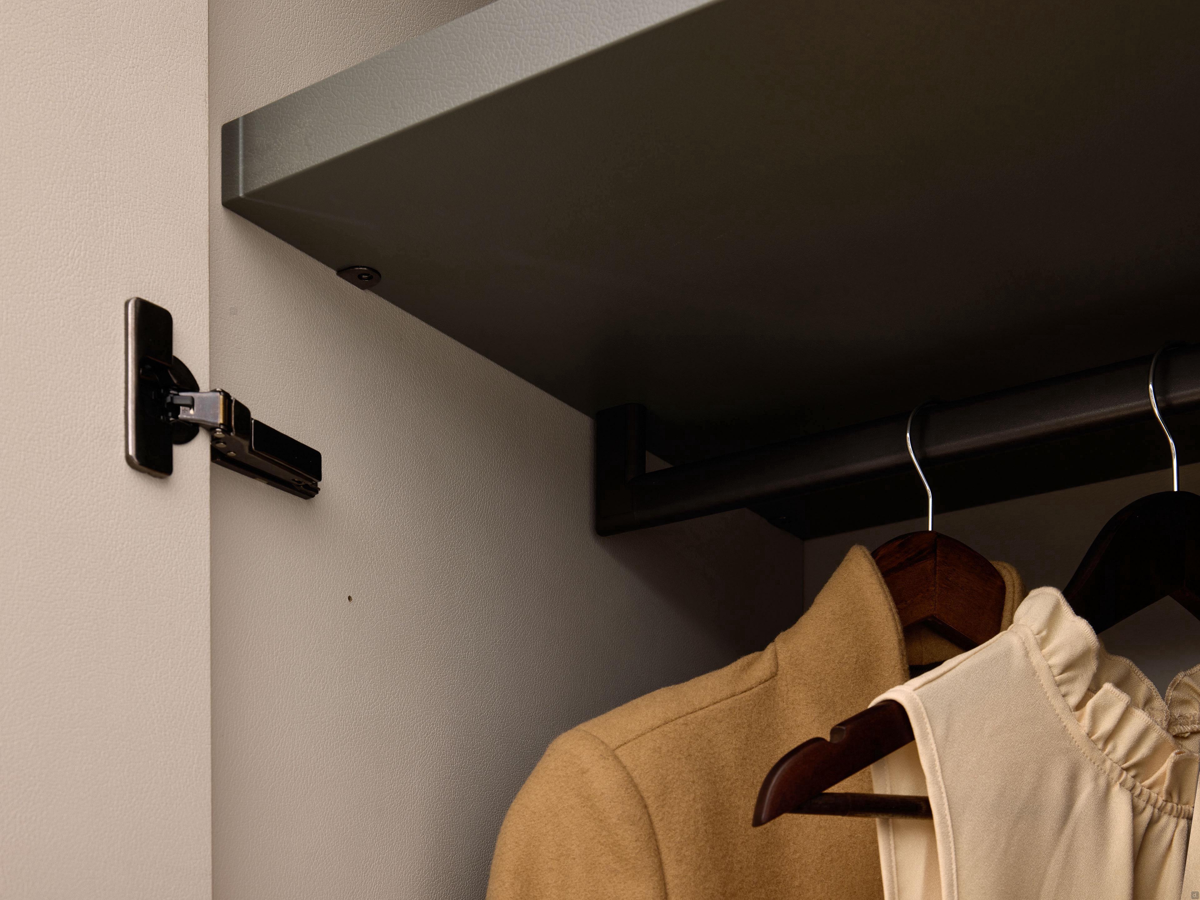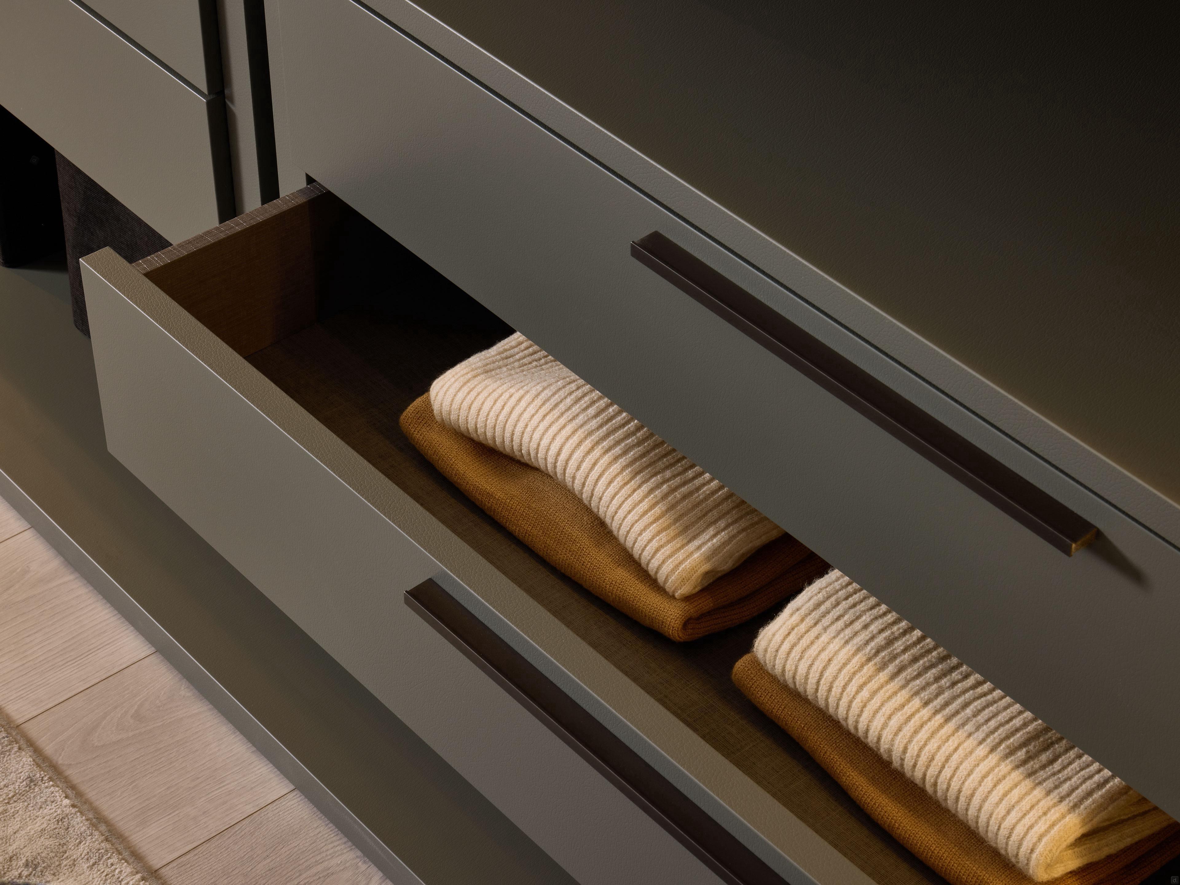 Hängerohre: aus lackiertem Metall in Umbra Shine. Die Schrankmodule werden mit Kleiderbügelrohren in der Standardversion geliefert: im Produkt „Driver Wide Innenausstattung“, das unten auf der Seite verlinkt ist, kann man dann die Premiumversion mit einem quadratischeren Profil wählen.