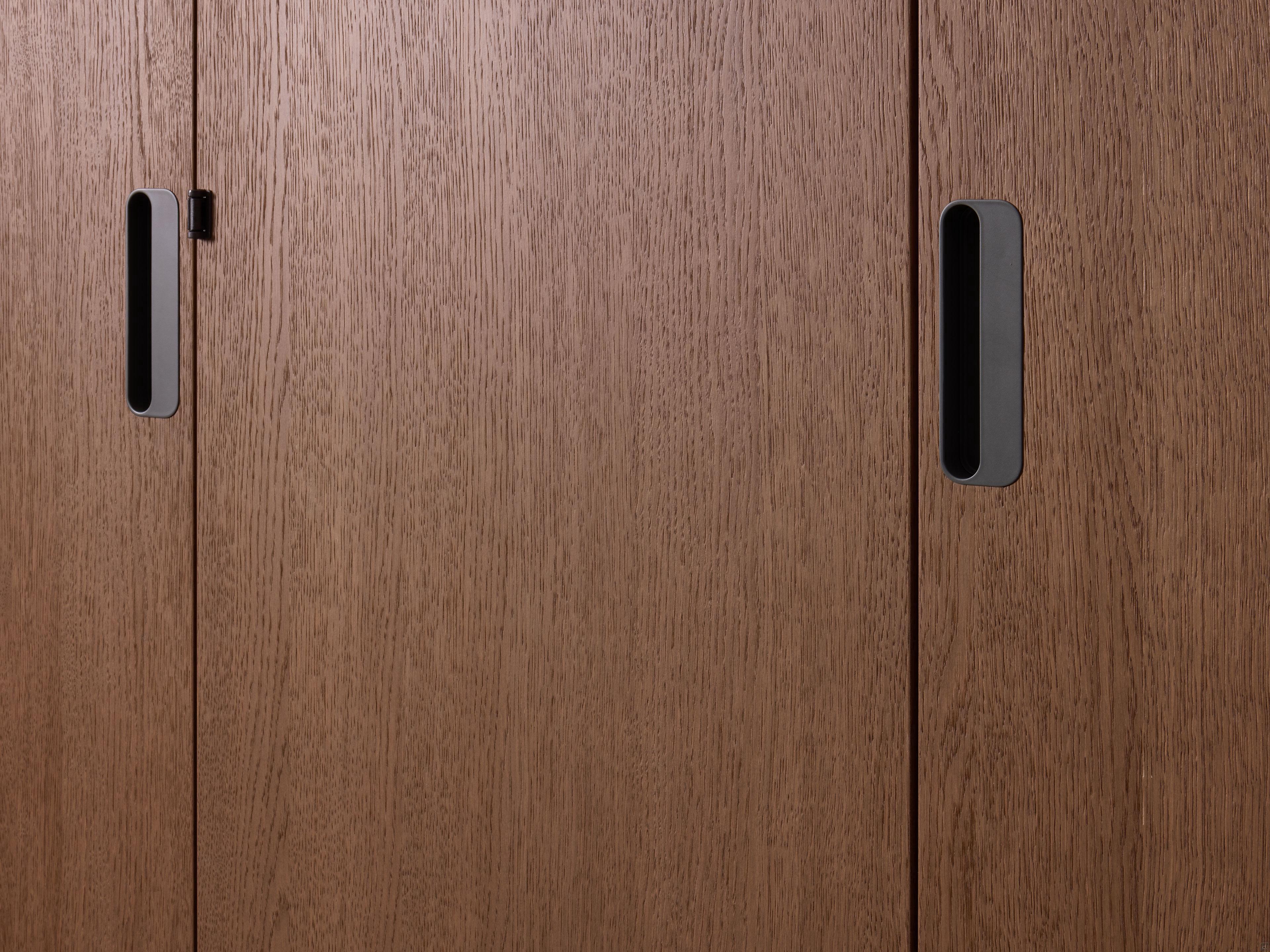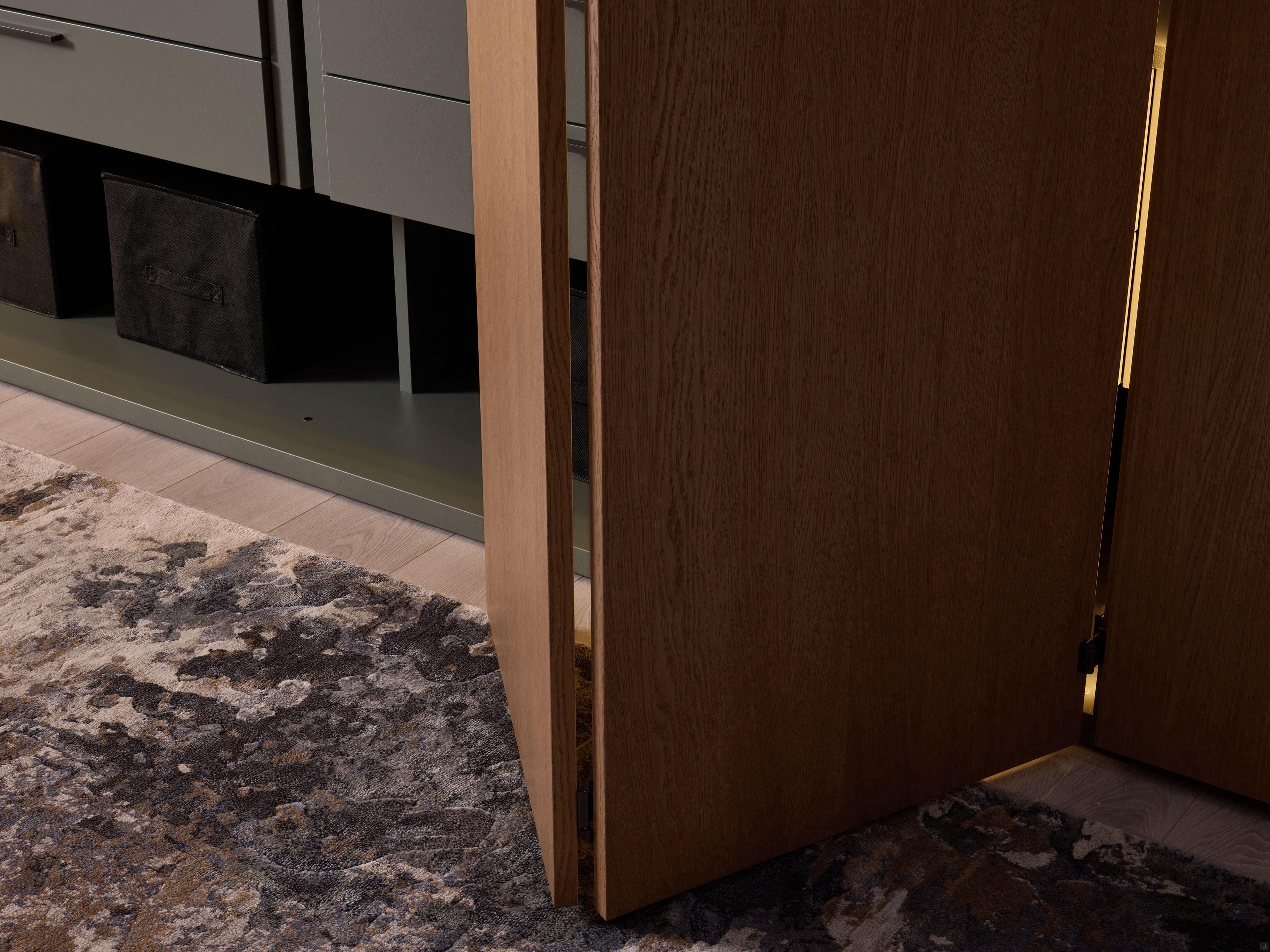 Drehtüren Melamin / Holz: 2,2 cm stark, mit titanlackierten Metallscharnieren mit 110°-Öffnung und Schließdämpfung. Die Drehtüren sind bis zu einer Höhe von 229,5 cm mit 4 Scharnieren und bei größeren Höhen mit 5 Scharnieren ausgestattet.