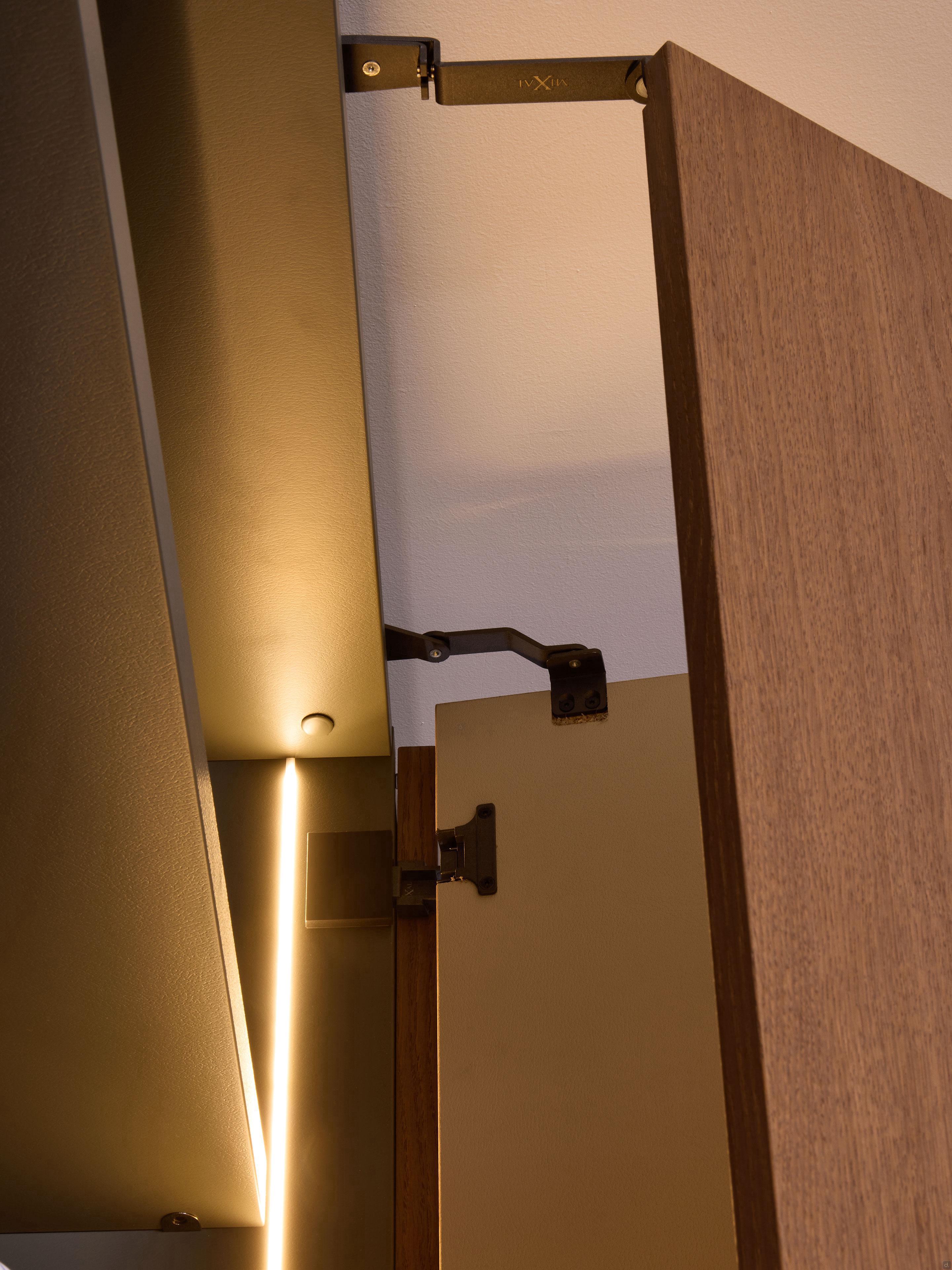 Falttüren Melamin / Holz: 2,2 cm stark, mit 3 Pivot-Scharnieren zum Öffnen von Paket-Türen. Mit Dämpfungsfunktion und ebenfalls aus lackiertem Metall in Moka-Shine.