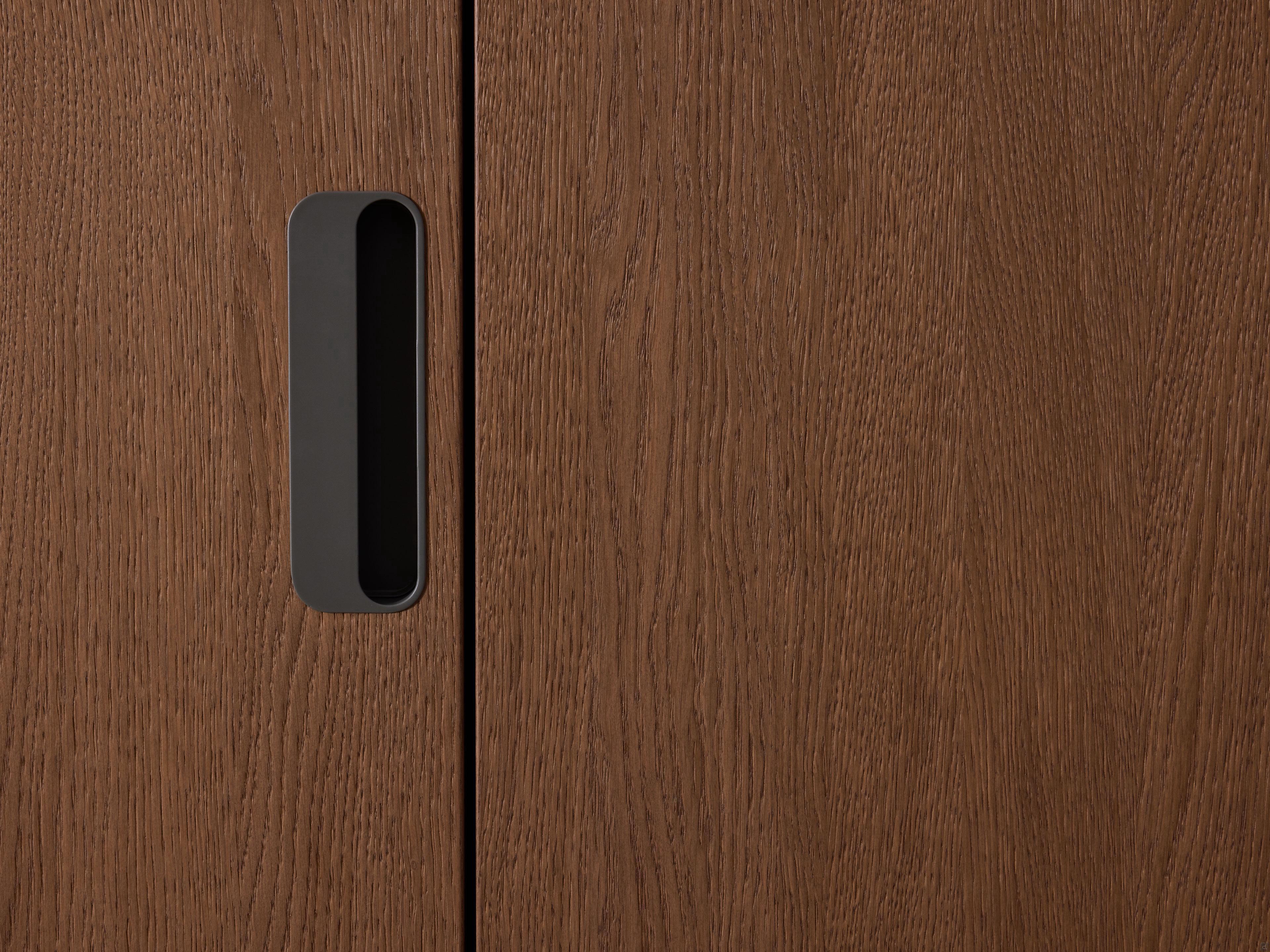 Türen: aus Holzspanplatten der Klasse E1 mit geringer Formaldehyd-Emission oder aus Bronzeglas, Bronze-Satiniertes-Glas, Naturspiegel: In letzteren Fällen sind die Türen komplett mit Rahmen und integriertem Griff aus glänzendem Mokka oder nickelfarbigem Metall.