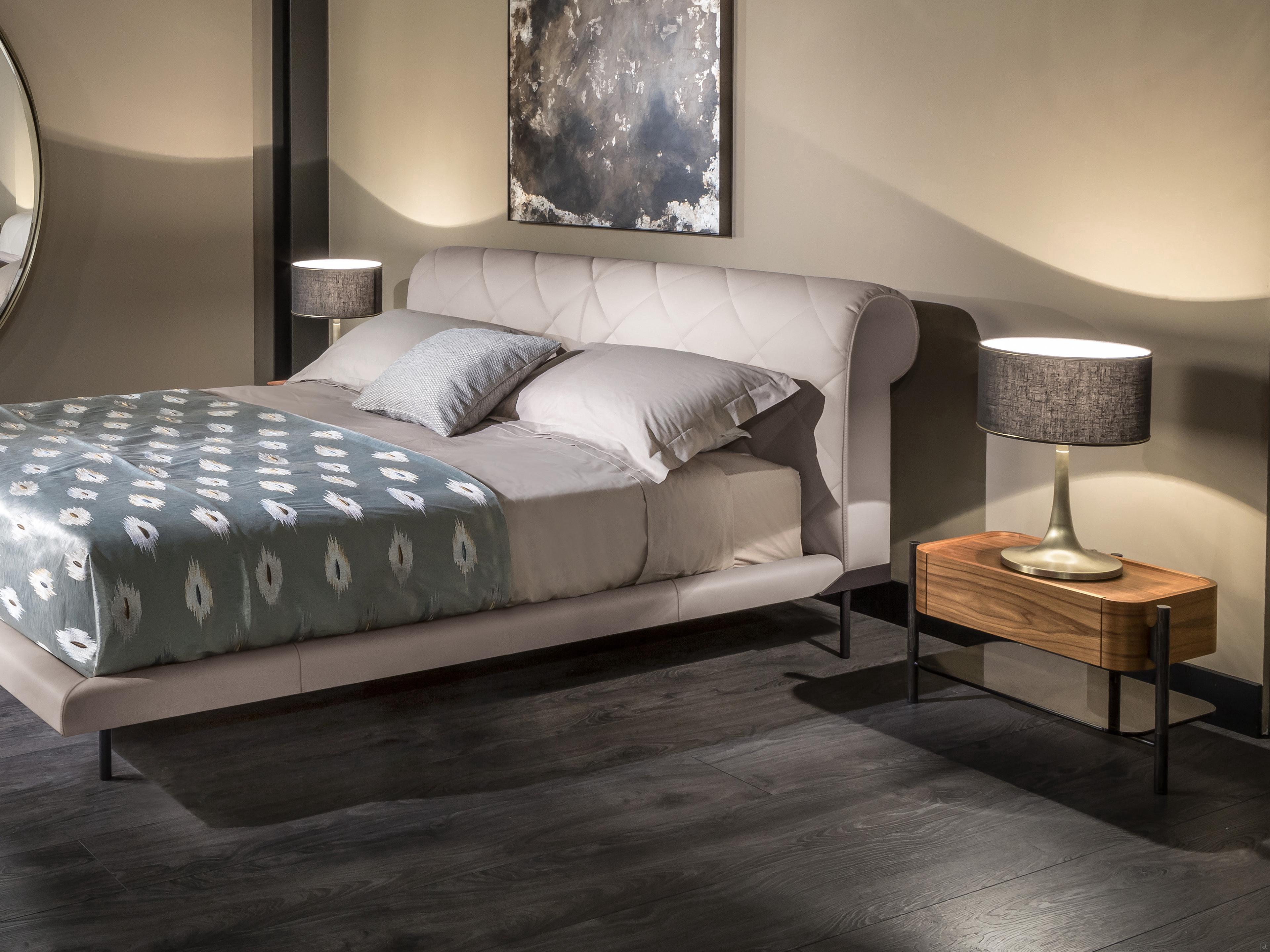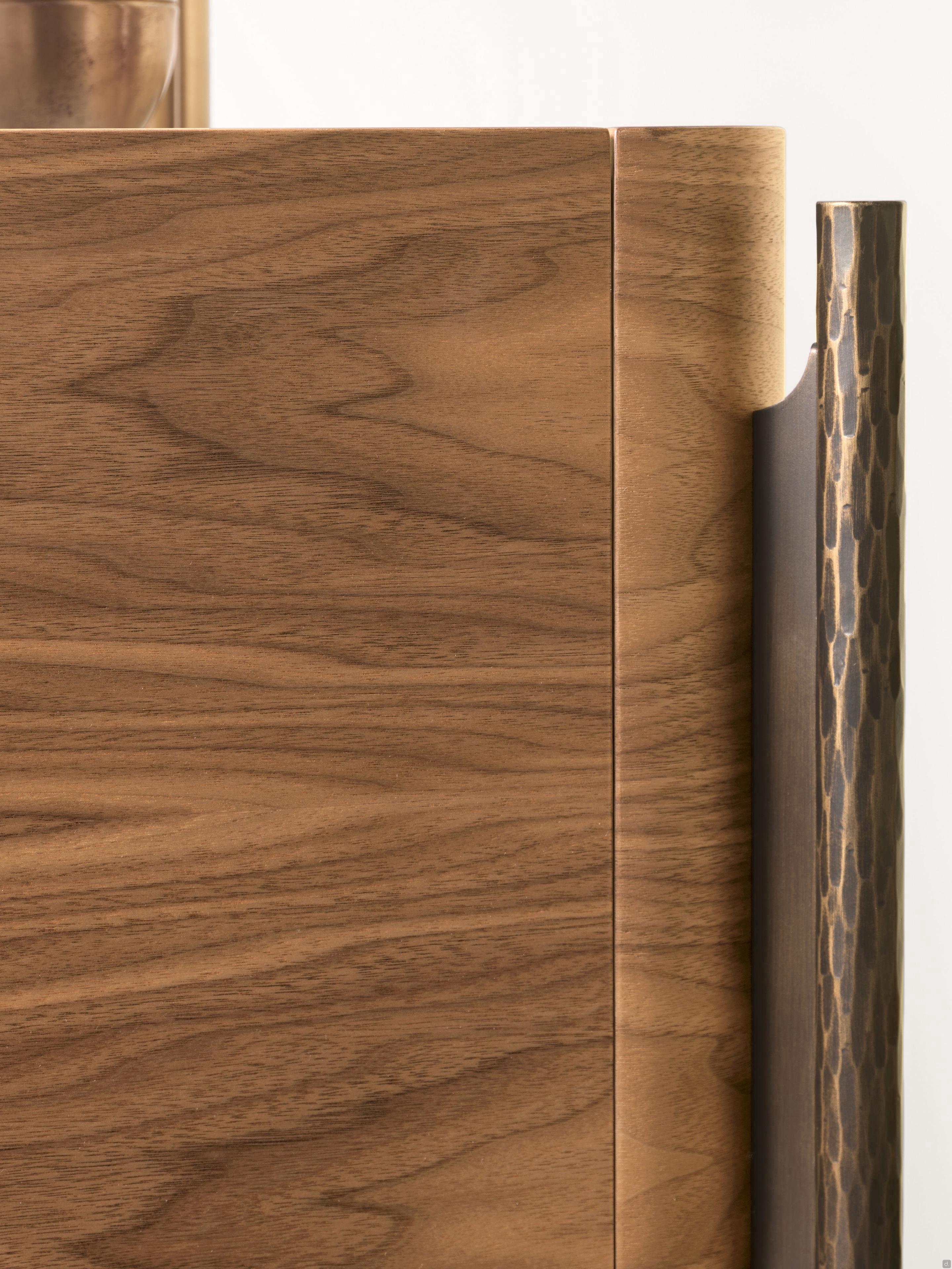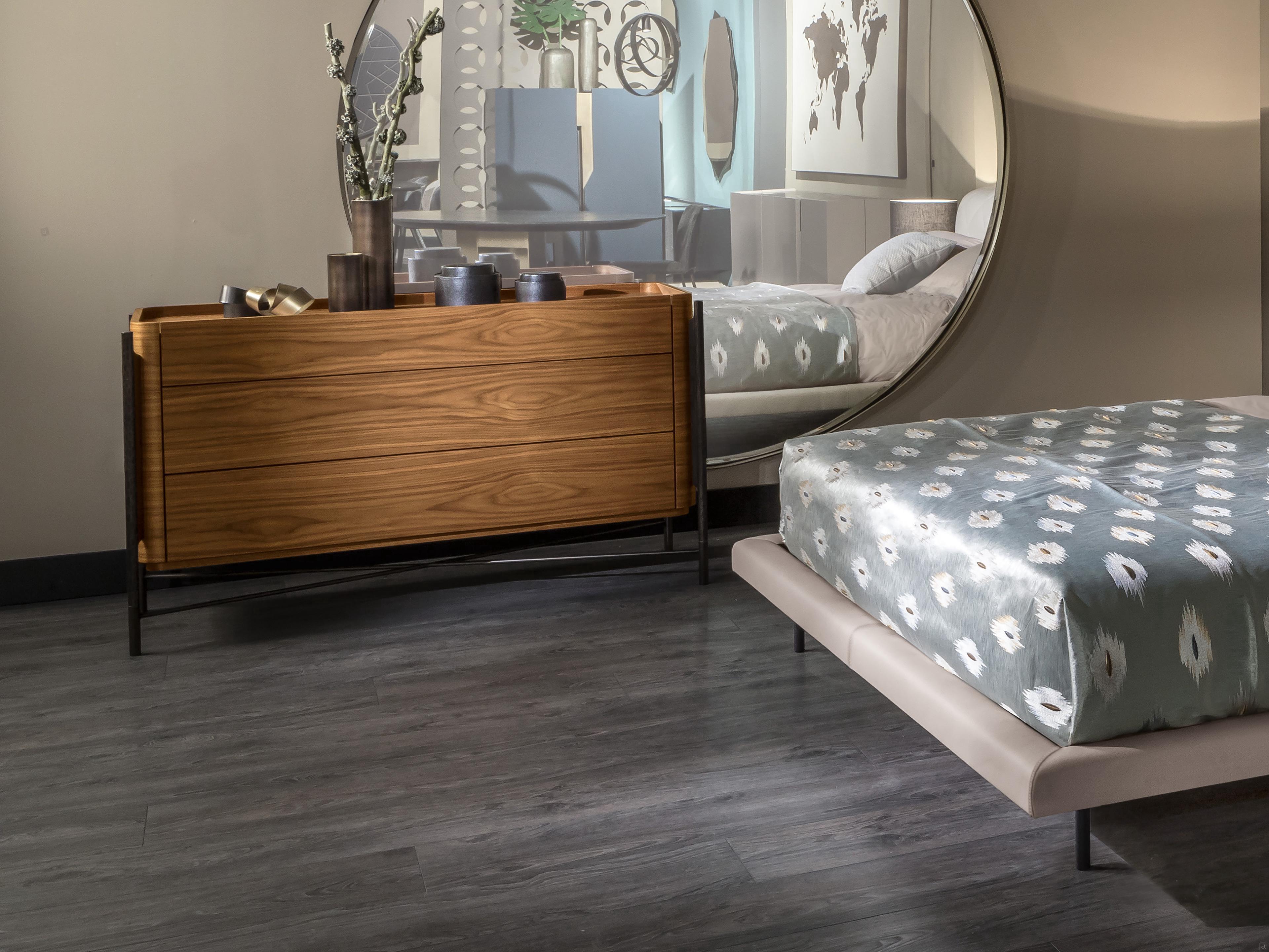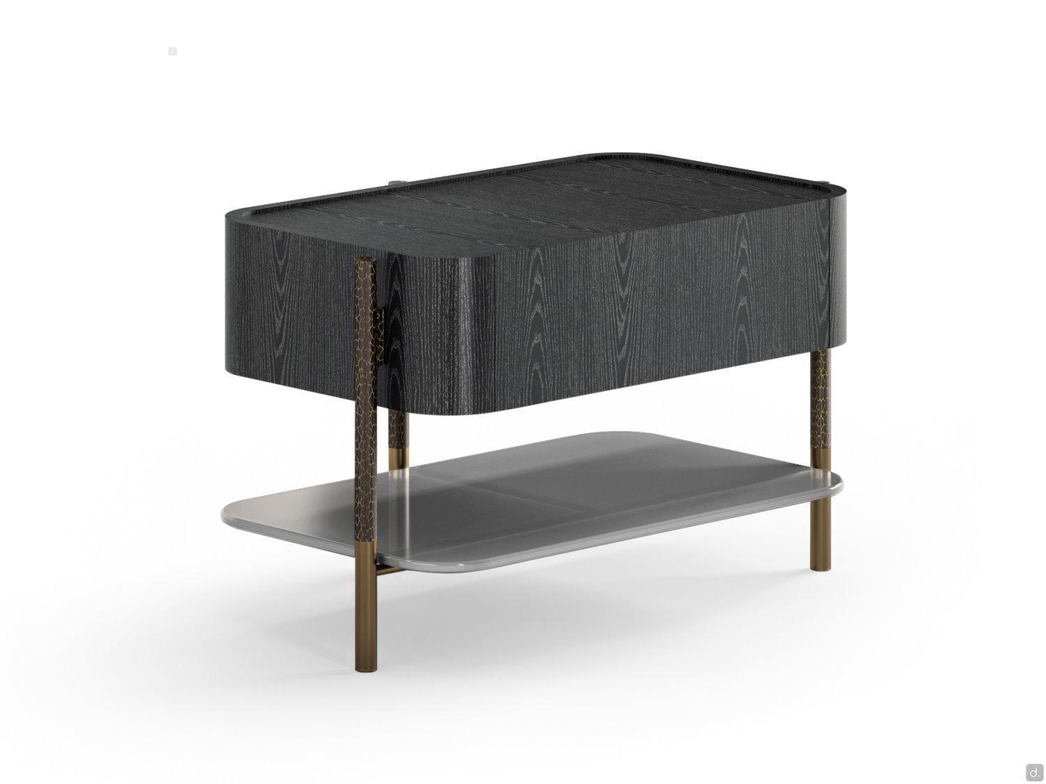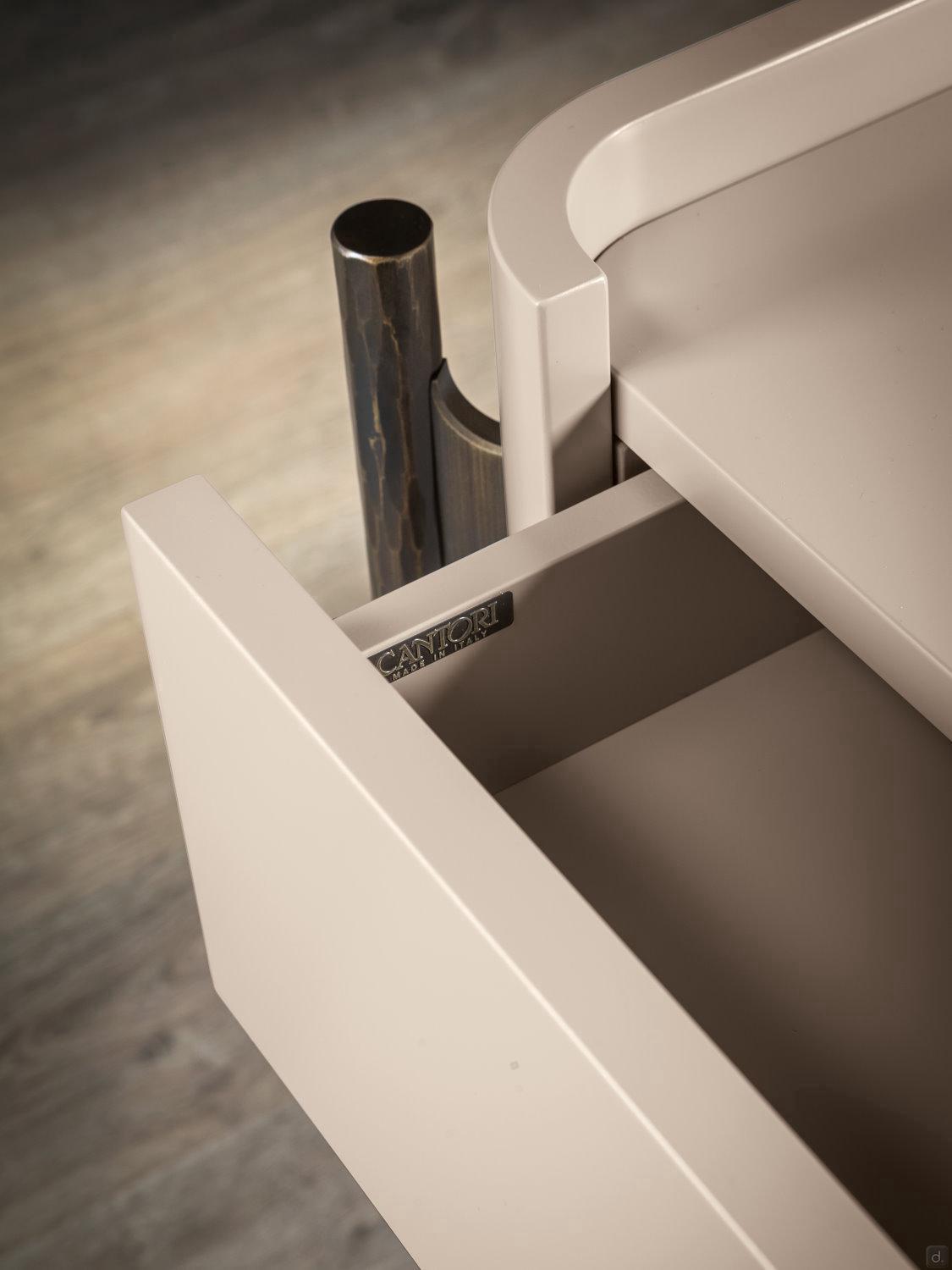 Die Bettgruppe Shanghai von Cantori besteht aus einer Holzkommode und einem Nachttisch mit schmiedeeisernen Füßen. Handgeschmiedete und von Hand facettierte Rohrelemente aus Schmiedeeisen stützen das Volumen des Möbels und sind in einer Art Bocksockel miteinander verbunden. Die Struktur, aus der die Schubladen bestehen, ist aus Holz, mit abgerundeten Ecken und die Platte ist leicht abgesenkt, Details, die die Qualität und den Wert dieser Bettgruppe unterstreichen. Die Kommode ist mit drei Schubladen ausgestattet, während der Nachttisch mit einer Schublade durch eine untere Glasablage ergänzt wird; die Schubladen haben einen Soft-Close-Mechanismus.Die antike Seele des Schmiedeeisens lebt in einer eleganten Bettgruppe mit zeitgenössischem Stil wieder auf; die raffinierte Metallstruktur, die die Schubladen vom Boden abhebt, erleichtert eine nur scheinbar wesentliche Silhouette und wird zum wichtigsten dekorativen Element.