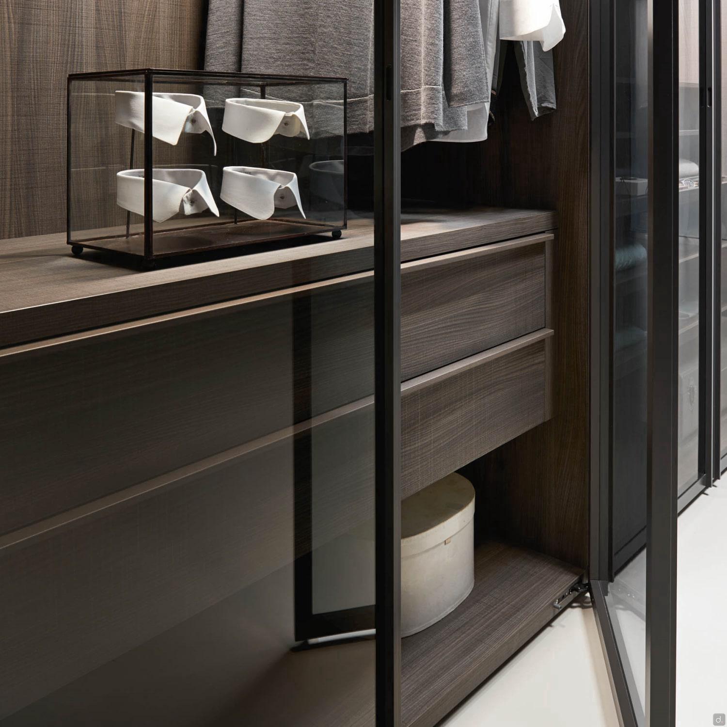 Glasregal: 3,5 cm stark mit Metallrahmen. Kann mit einer doppelten LED-Leiste (vorne und hinten) für den "doppelseitigen begehbaren Kleiderschrank" (nur mit elektrifizierter Rahmenseite) oder einer einzelnen LED-Leiste (vorne) für den "doppelseitigen begehbaren Kleiderschrank mit Rückwand" ausgestattet werden.