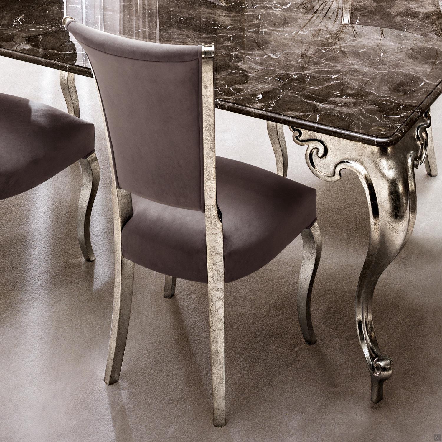 Raffaello ist ein klassischer Polsterstuhl mit Holzbeinen von Cantori. Das Gestell besteht aus handgeschnitztem Holz und der Bezug ist aus Samt, Leder oder Nubuk leder erhältlich. Es handelt sich um einen handwerklichen Stuhl mit breitem Sitz und hoher und geformter Rückenlehne. Das Holzgestell mit schlichtem und elegantem intarsiertem Dekor und die vorderen Säbelbeine machen Raffaello hochwertig und raffiniert. Dieser Stuhl ist für klassische Esszimmer besonders geeignet, auch in Kombination mit den Tischen aus derselben Kollektion.