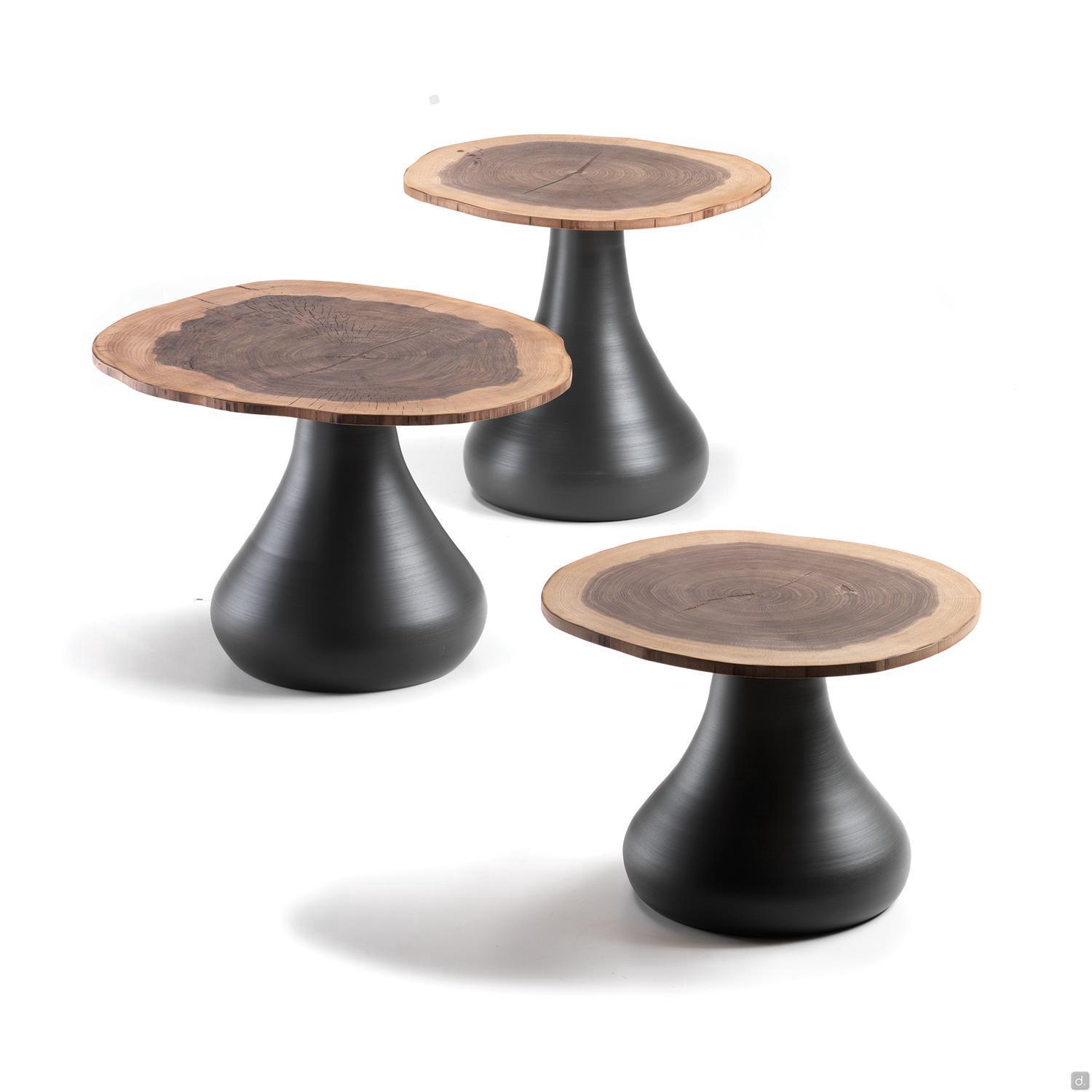 Rio von Cattelan ist ein Beistelltisch, dessen Platte aus einem Querschnitt von einem Nussbaumstamm besteht. Die Verwendung des Holzblattes für das Furnier unterscheidet sich die Platte in Form und Maß und die Abmessungen ändern sich leicht von Mal zu Mal. Die Basisstruktur ist in Grafit geprägtem Metall Farbe erhältlich: ein dunkler Farbton, der gut zur Platte passt und die warmen, unverwechselbaren Töne des massiven Nussbaums hervorhebt.