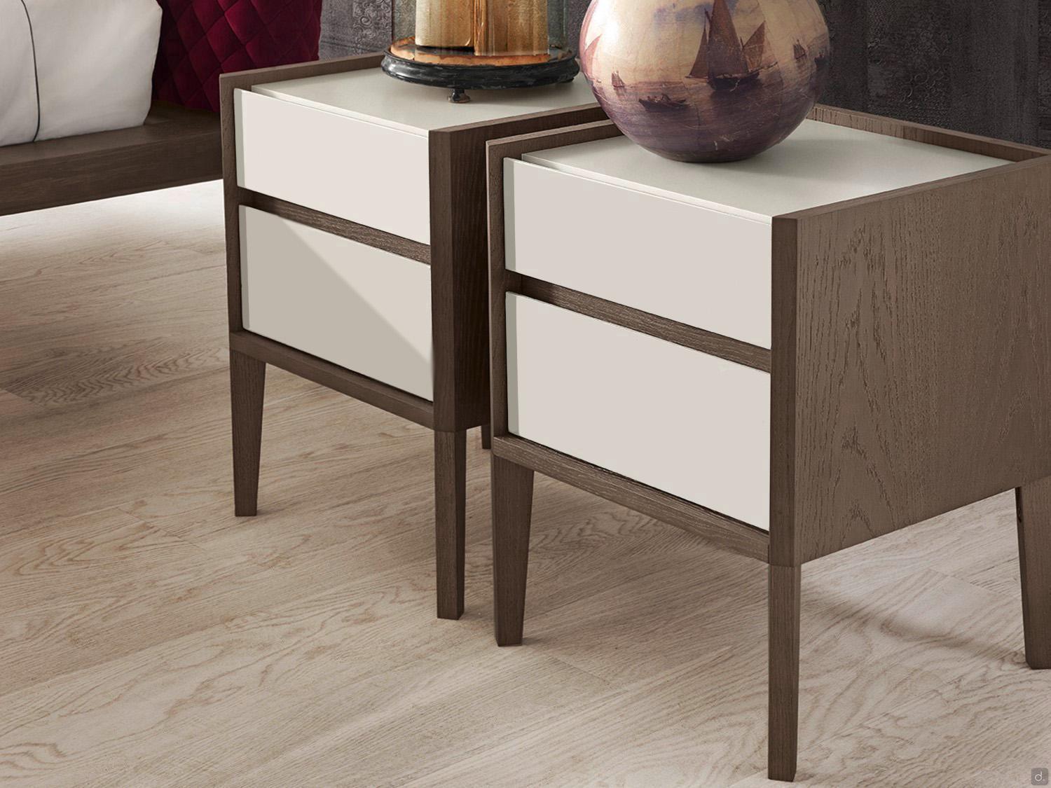 Die Kommode und die Nachttische aus Eichenholz mit Schubladen der Linie Taurus sind eine raffinierte und originelle Wahl für Ihr Schlafzimmer. Verfügbar sind auch eine Hochkommode mit 6 Schubladen und ein Beistelltisch, der als Nachttisch verwendet werden kann, mit einer extra klaren Glasplatte.
