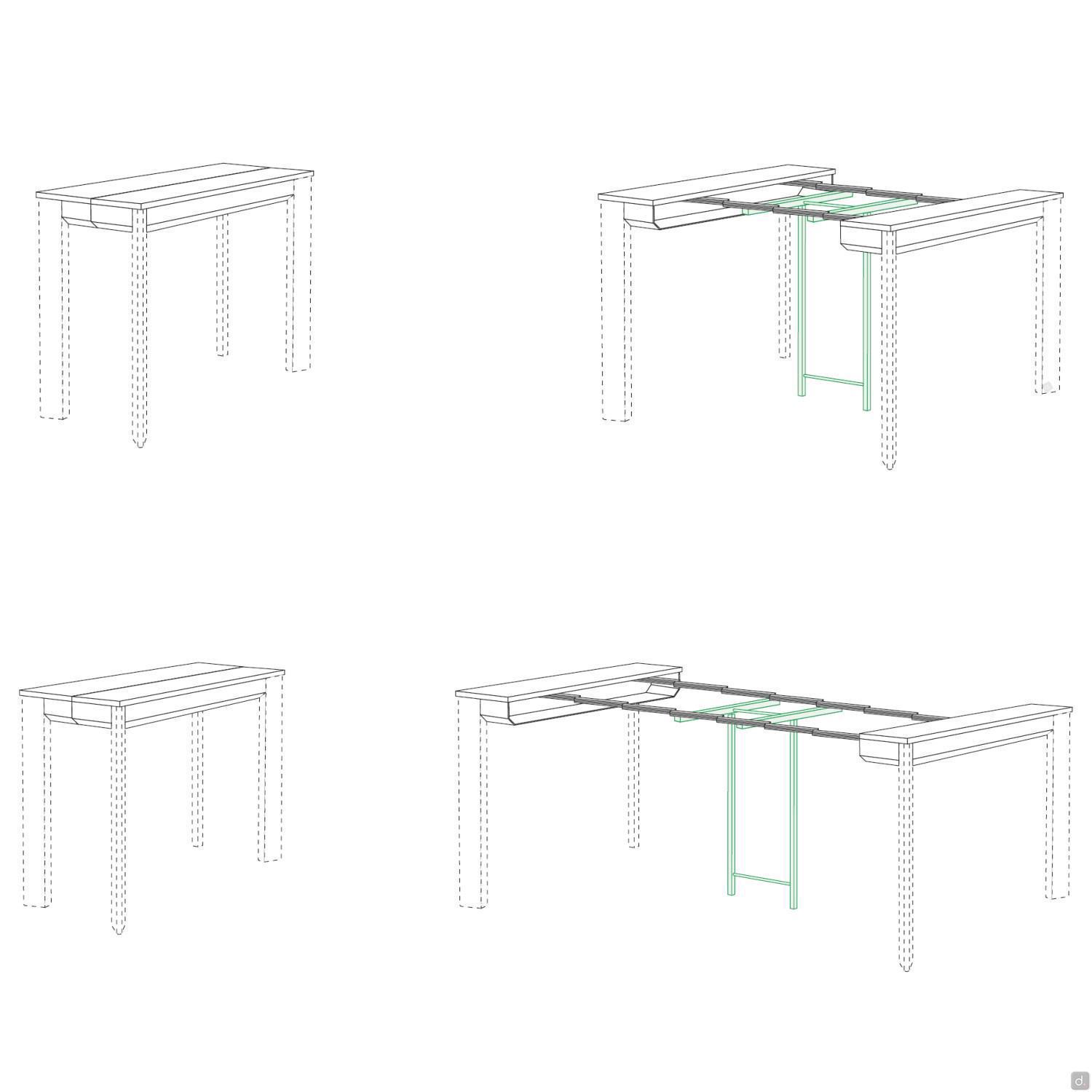 Evans ist ein erweiterbarer Konsolentisch mit einem Gestell aus lackiertem Aluminium, das in fünf verschiedenen Farben erhältlich ist. Die Platte ist in HPL oder Fenix-Melamin in verschiedenen Ausführungen erhältlich. Der Evans-Konsolentisch wird mit einem oder zwei Sets von Verlängerungsplatten geliefert, die zur Platte passen und es ermöglichen, die Größe eines Esstisches zu erreichen, an dem 4 bis 8 Personen bequem Platz finden.Die Verlängerungsplatten werden in einem praktischen Polypropylen-Koffer geliefert, in dem sie bei Nichtgebrauch aufbewahrt werden können. Der Evans-Konsolentisch hat vier umlaufende Beine mit rautenförmigem Querschnitt und einen zentralen, einklappbaren Bock, der nur verwendet wird, wenn der Konsolentisch geöffnet ist.