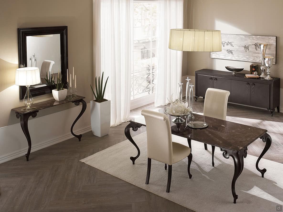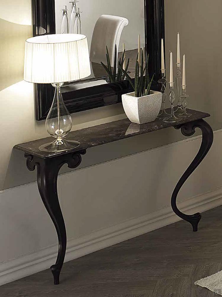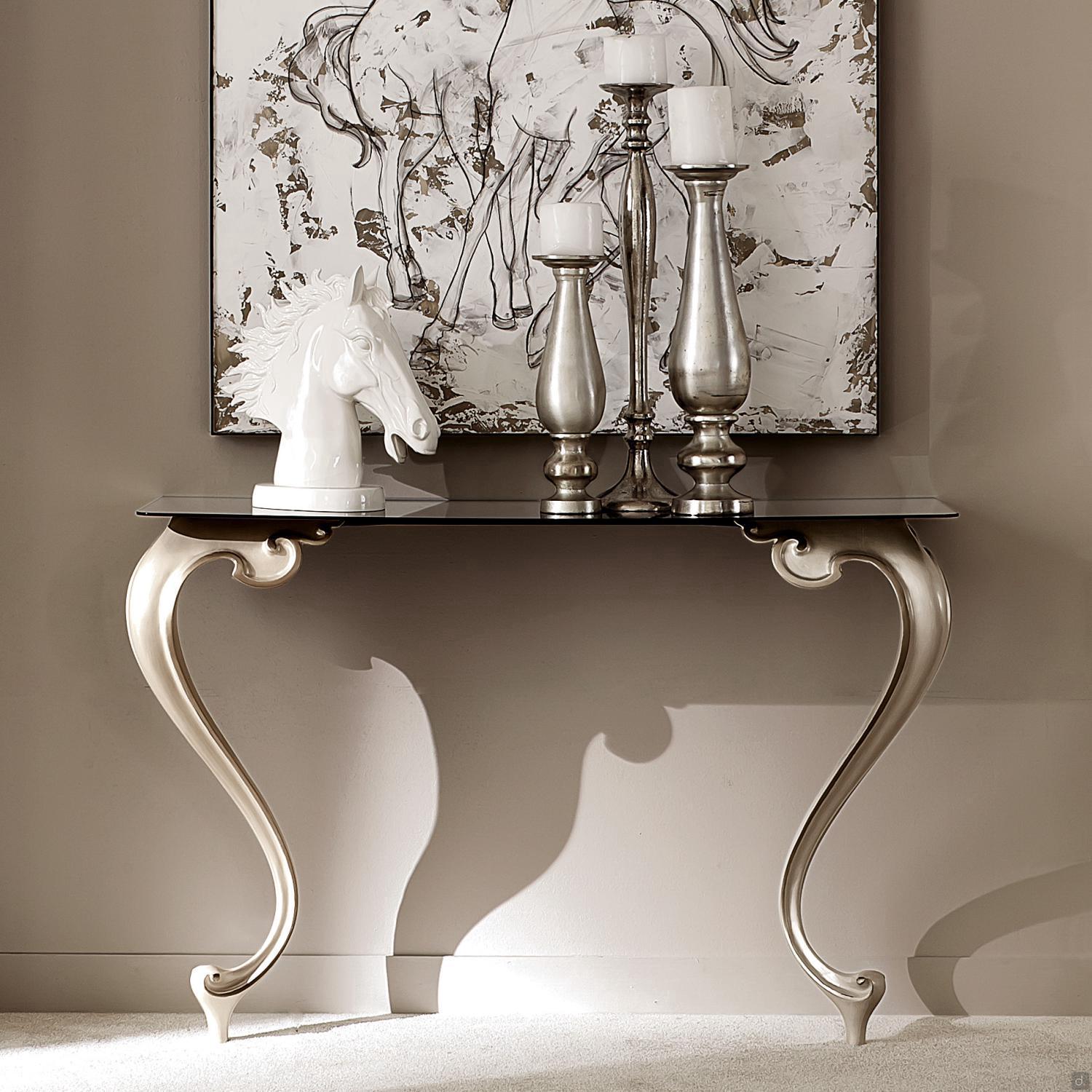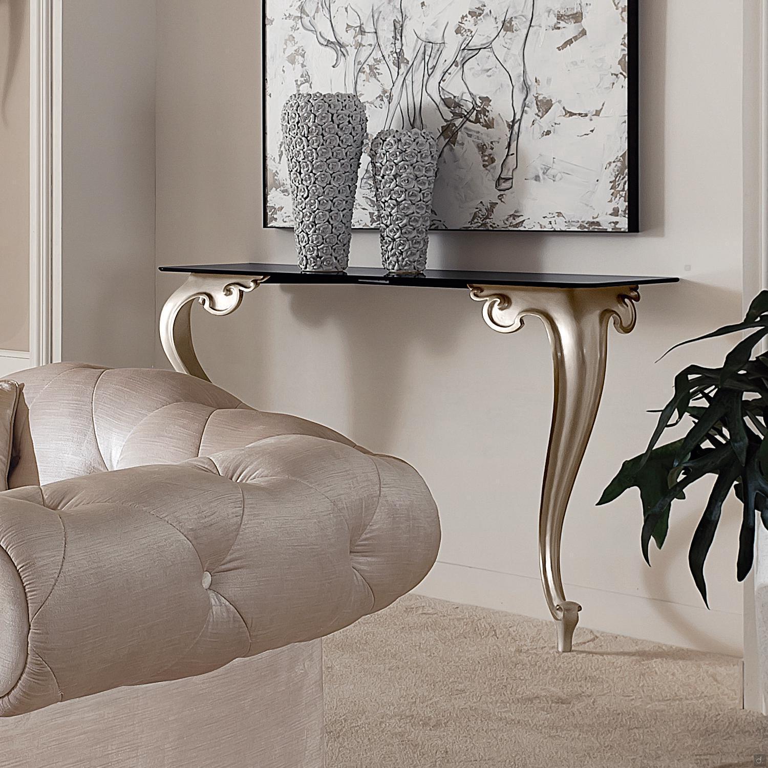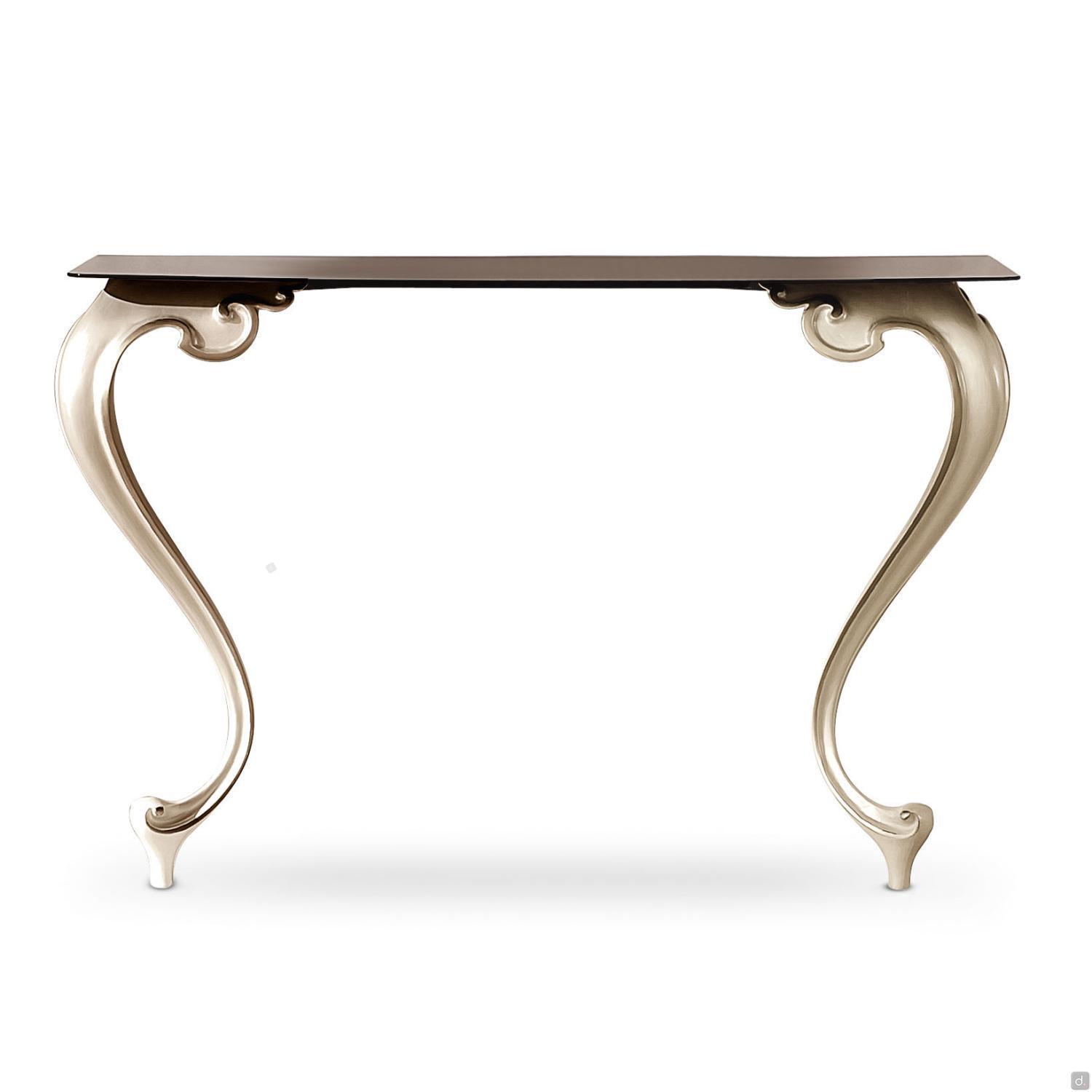 George ist ein klassischer Konsolentisch von Cantori für den Eingangsbereich, der in verschiedenen raffinierten Ausführungen mit Spiegel oder Marmorplatte erhältlich ist. George hat eine gewundene, leichte und elegante Struktur, die mit der Schaffung von leeren und luftigen Volumen spielt.Die handgefertigten Säbel-Beine verleihen der Konsole einen besonders geschwungenen und leichten Effekt. Sie ruhen auf dem Boden auf Füßen, die an das Bild einer eleganten Balletttänzerin auf Zehenspitzen erinnern.