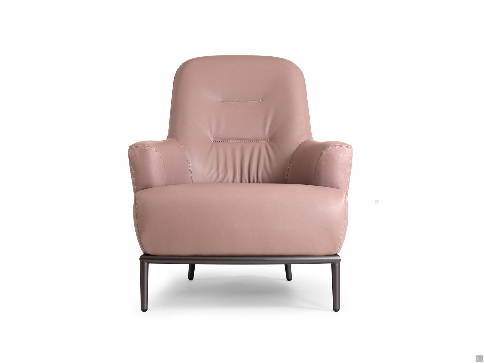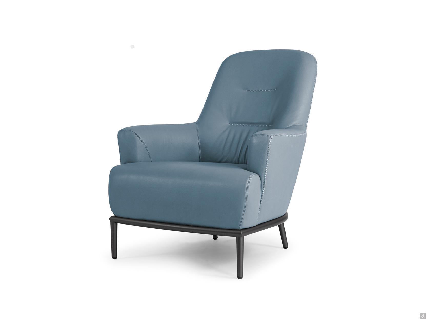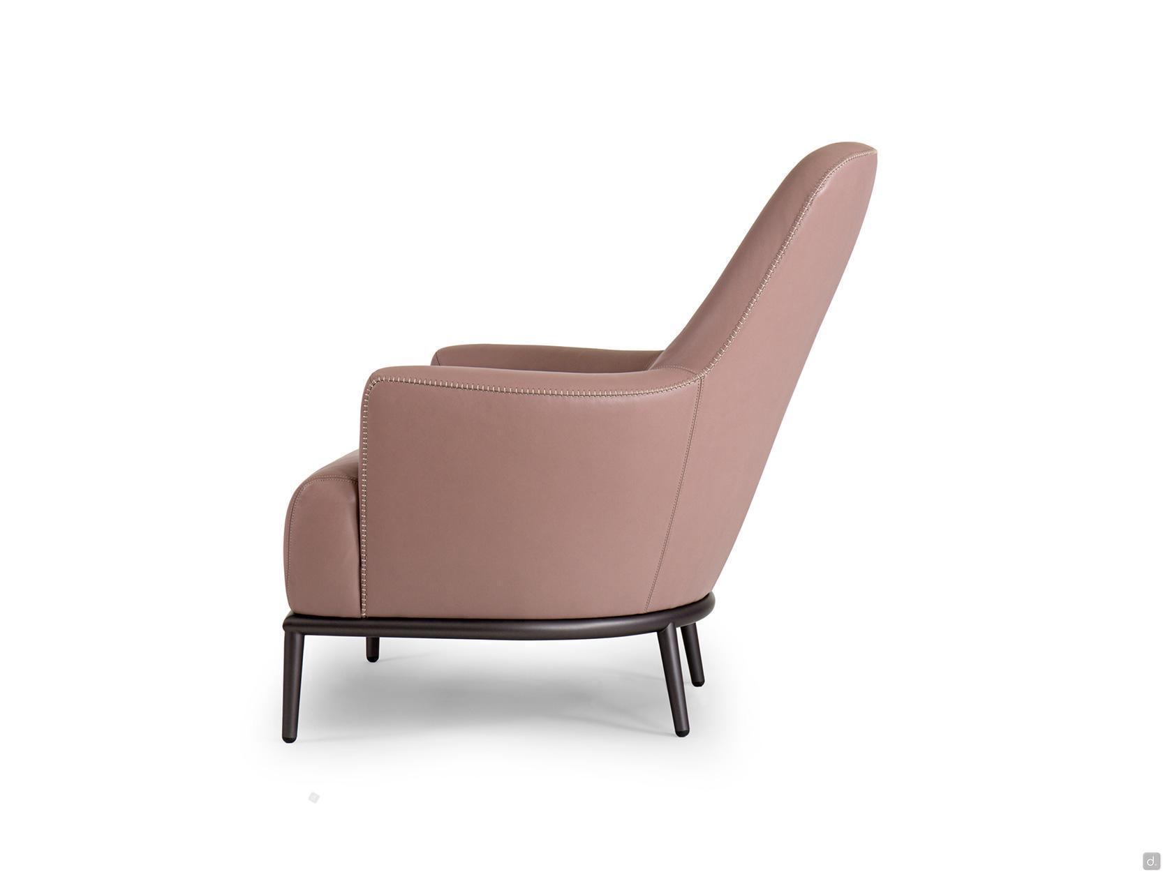 René ist ein Lesessel mit einer hohen, leicht geneigten Rückenlehne und integrierten Armlehnen. Die gepolsterte Struktur mit ihren weichen Kurven charakterisiert den Sessel und verleiht ihm Komfort und Ergonomie, indem sie die Sitzfläche umhüllt und stützt.Der Bezug des Sessels René ist ein - oder zweifarbig, in Echtleder, edlem Samt oder Stoff in verschiedenen Webarten und Farben erhältlich. Die Innenseite der Rückenlehne ist in der Mitte mit zwei Stickereien versehen, die die Polsterung verschönern; dieselbe Stickerei verläuft entlang des Profils der Rückenlehne und der Armlehnen und wird in zwei verschiedenen Varianten angeboten, die erste mit einer Kreuzstichnaht, die zweite mit einer vom Design-Studio entworfenen Verarbeitung, die "Trap" genannt wird.Das Gestell des Sessels, aus pulverbeschichtetem Metall oder matt oder glänzend lackiert, folgt seinem gesamten Umfang und ruht auf vier 18 cm hohen Beinen auf dem Boden.