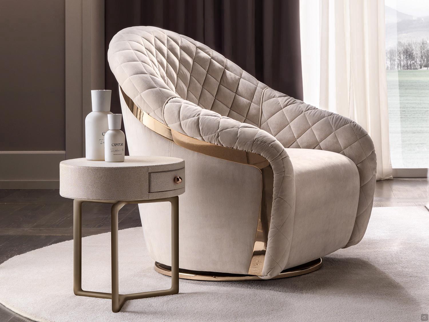 Portofino von Cantori ist ein luxuriöser, gesteppter Sessel mit drehbarem Fuß und Details in Gold oder Bronze. Das dekorative Metallband begrenzt das Profil der Armlehnen und kreist um die geschwungene, umhüllende Rückenlehne und betont die weichen, abgerundeten Linien des Sessels. Der runde Metalldrehsockel ist mit einem Rückstellsystem ausgestattet und passt zum Finish des Metallprofils.Der bequeme und gemütliche Sitz ist zwischen den beiden niedrigen Armlehnen eingeschlossen. Die Polsterung und Versteppung der Innenseite der Schale ist vollständig handgefertigt; der Bezug ist in weichem Samt, praktischem Kunstleder oder Leder, Wildleder oder Nubuk erhältlich.Portofino ist ein eleganter Sessel, ideal für luxuriöse und geschmackvolle Umgebungen; das Sofa und der Hocker vervollständigen die Kollektion.