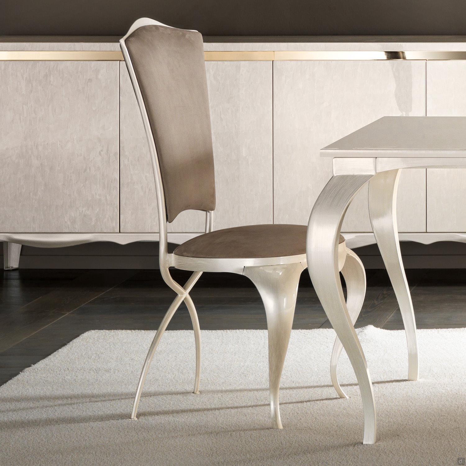 Ghirigori von Cantori ist ein Stuhl mit Säbelbeinen aus Metall, gekennzeichnet durch eine Rückenlehne mit wertvoller Handarbeit und asymmetrischen Verzierungen. Eine weiche Polsterung macht den Sitz des Stuhls Ghirigori äußerst bequem.Ghirigori ist auch mit gepolsterter Rückenlehne erhältlich und präsentiert sich mit einem eleganten und raffinierten Design, das sich ideal für luxuriöse Speisesäle eignet. Die große Auswahl an Bezügen aus Samt, Stoff, Kunstleder und Leder bietet ein hohes Maß an Individualisierung.