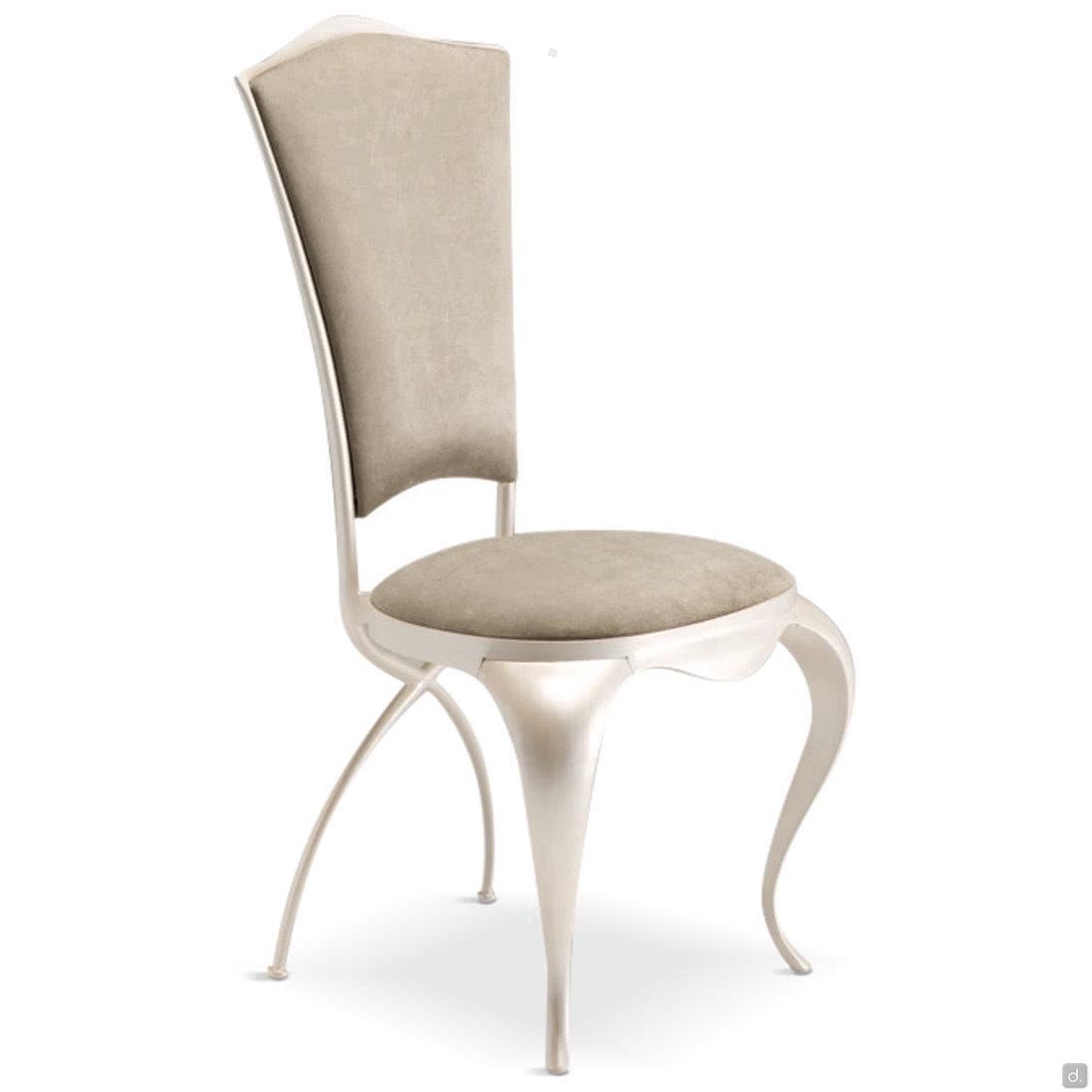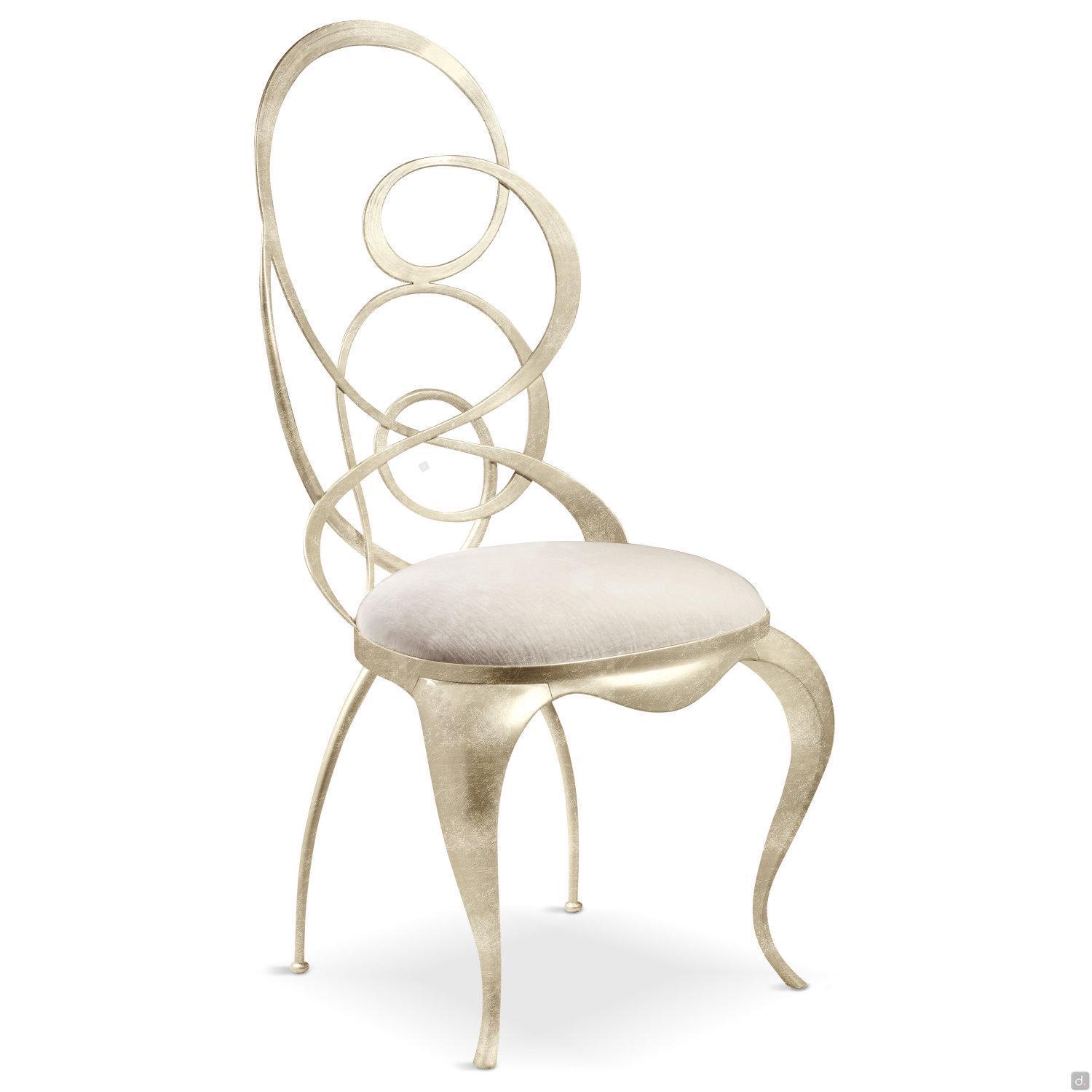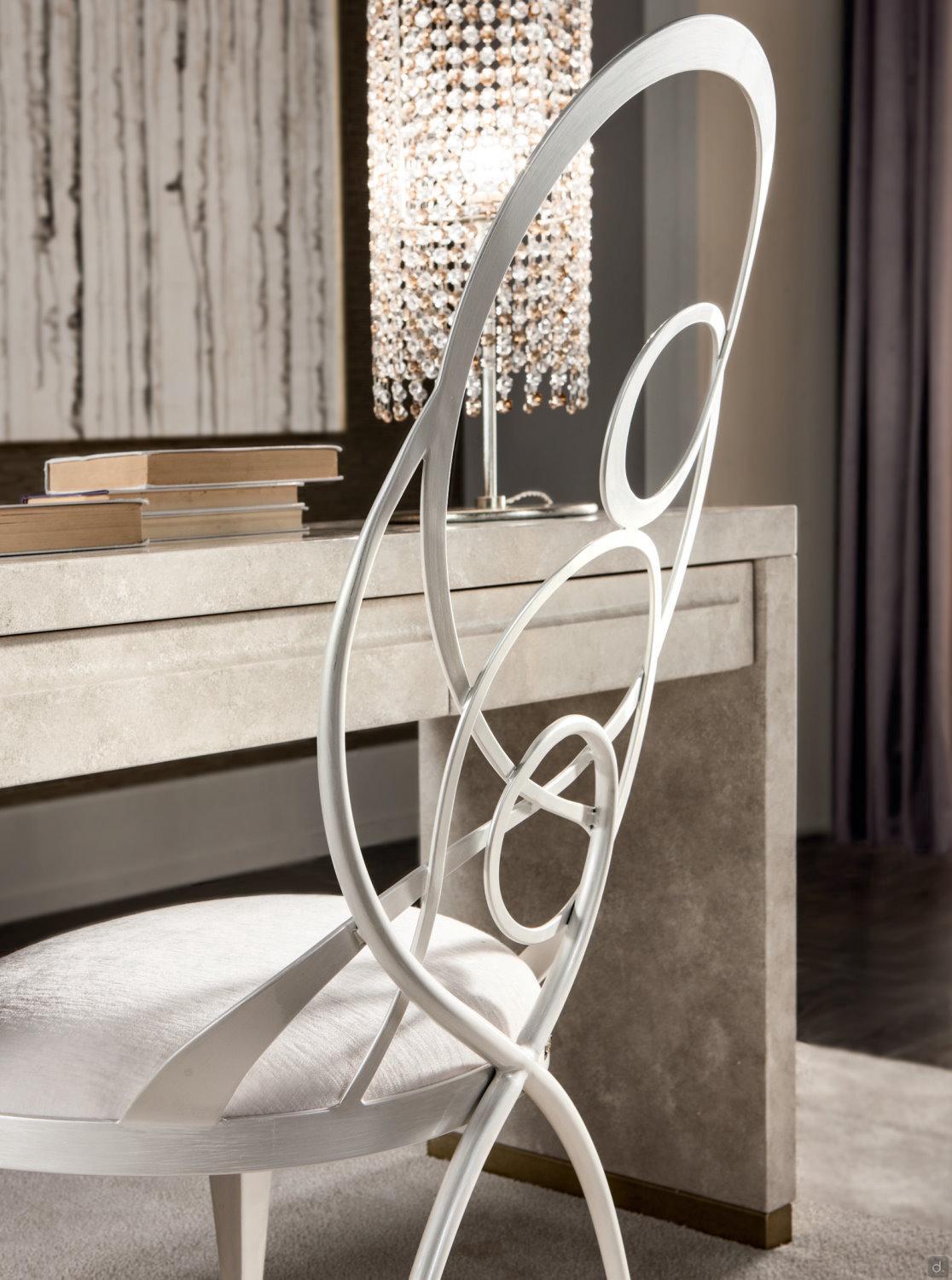 Die Meinung des InnenarchitektenGhirigori Stuhl mit Designer Rückenlehne wird dank des harmonischen und auffälligen Aussehens in Kombination mit den hochwertigen Materialien ein echter Hingucker. Die Rückenlehne ist wie ein Metallband, das sich windet und das Locken schafft, die zu dem Wohnbereich Dynamik verleiht. Die Version mit gepolsterter Lehne weist diese Dynamik in der Verbindung der hinteren Beine auf. Ghirigori Stuhl ist klassisch und originell; er bringt das typische Muster der Serie Ghirigori in Ihr Esszimmer. Diese Serie hat auch ein Bett, Kommoden und Nachttische, den Spiegel.