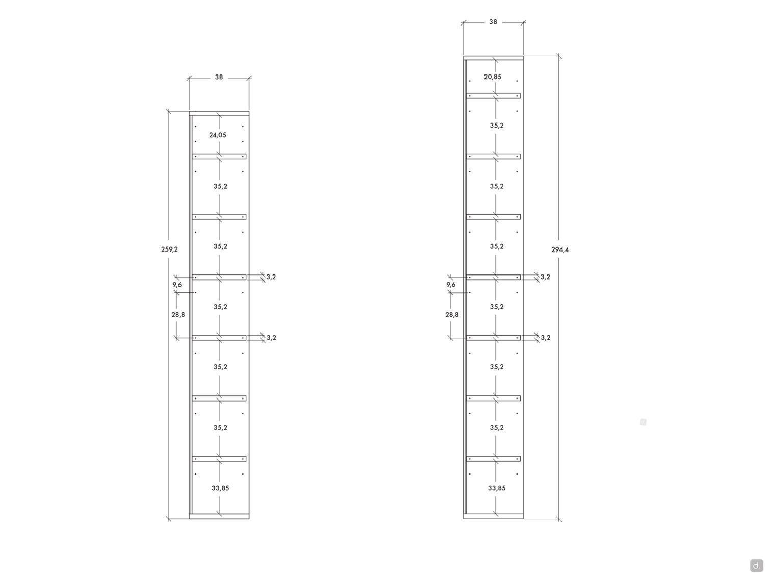 Bitte beachten Sie: Die Seitenwände werden immer ohne Verkleidung an den kurzen Seiten geliefert. Dieser Unterschied in der Verarbeitung, der nach der Montage des Schranks oft nicht mehr sichtbar ist, lässt den Rahmen aus massiver Fichte des Wabenkörpers bewusst sichtbar, um die Holzkomponente des Elements hervorzuheben und die hohe Qualität des Endprodukts zu zeigen.