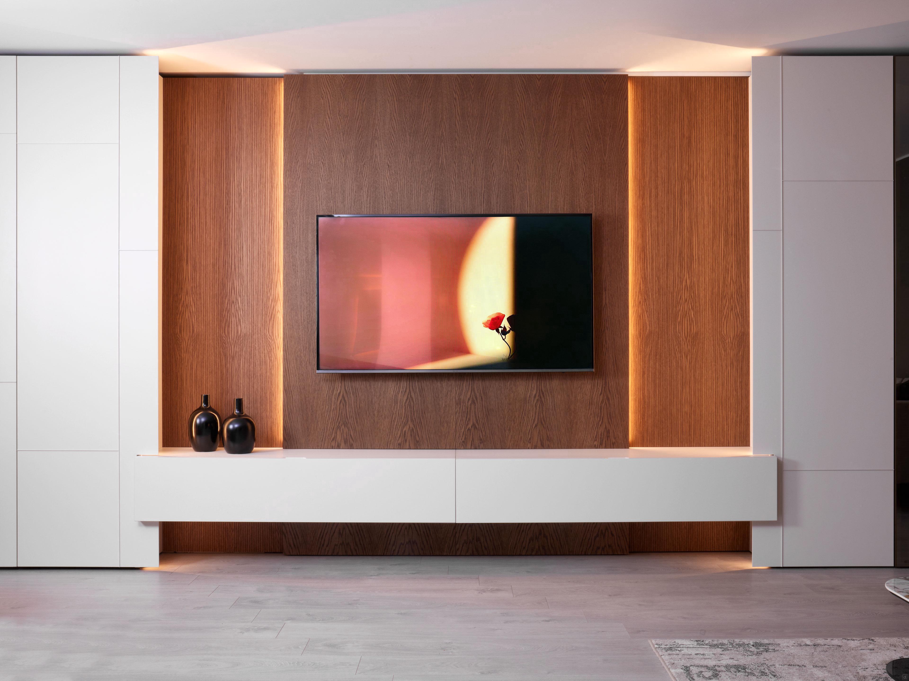 Hängeunterschränke: Struktur aus MDF, Stärke 1,8 cm, mit 45°-Bearbeitung an allen Seiten. Erhältlich mit Schublade oder Klapptür. Serienmäßig mit Kabeldurchführung 20 x 2 cm (Abstand zur Rückwand 3 cm). Die Kabeldurchführung bleibt unsichtbar und ist über den 6,8 cm breiten Technikraum zugänglich, der die Wand von der Boiserie trennt.