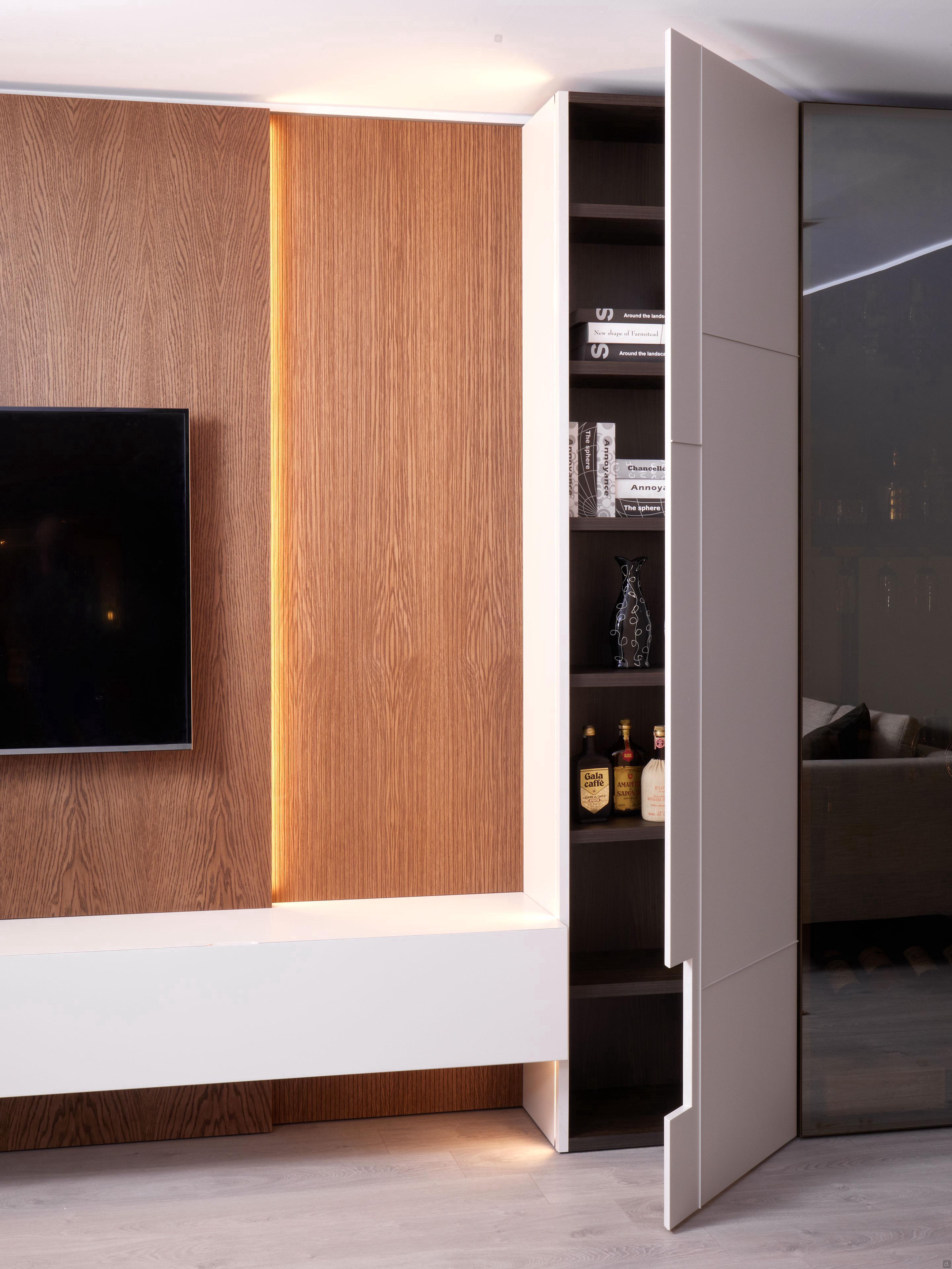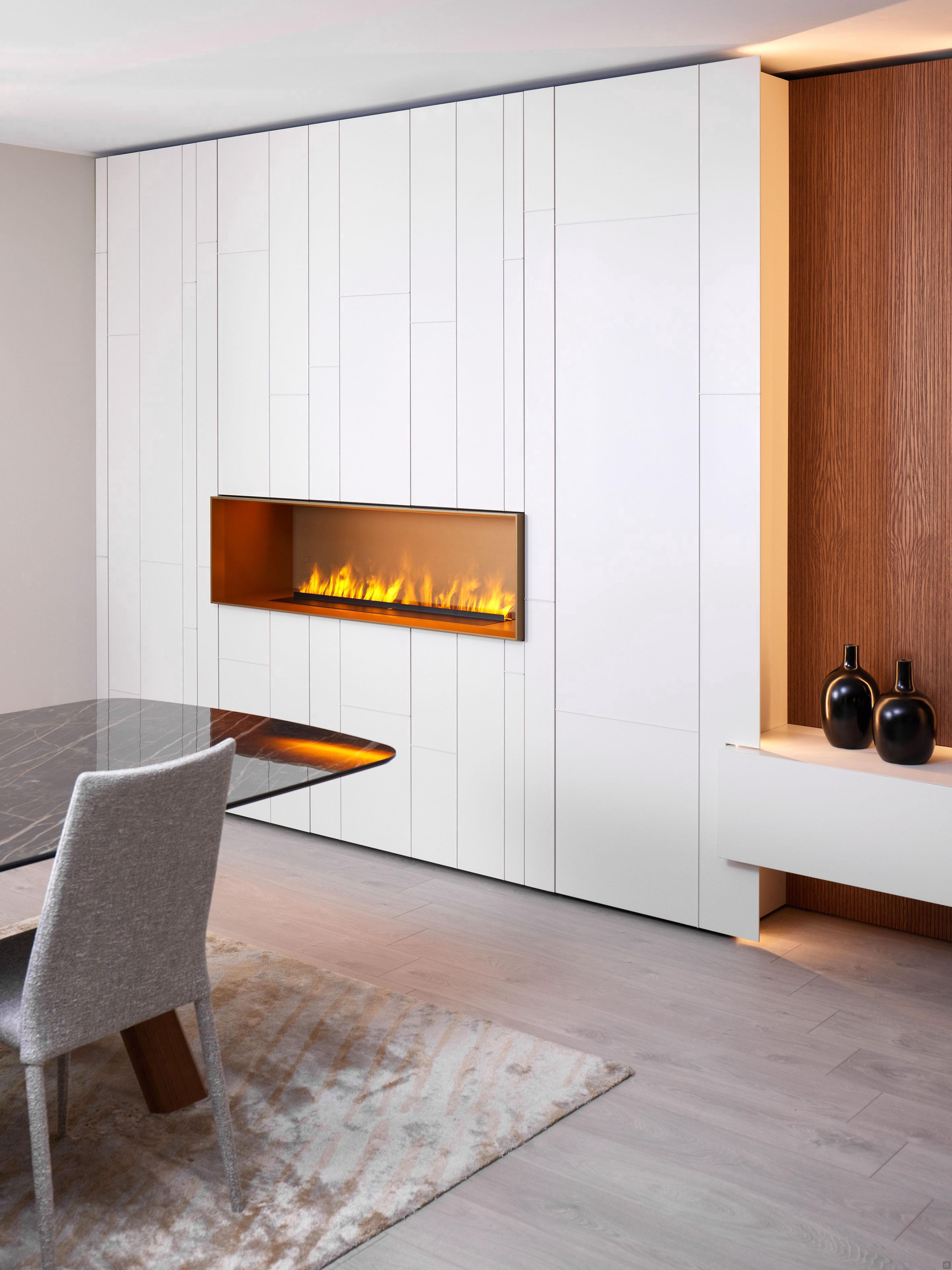 Der Elektrokamin wird in den Schrank integriert, indem das offene Fach durch eine spezielle Struktur ersetzt wird, die auch den umlaufenden Rahmen in Türfarbe umfasst, der matt lackiert oder metallisch sein kann.