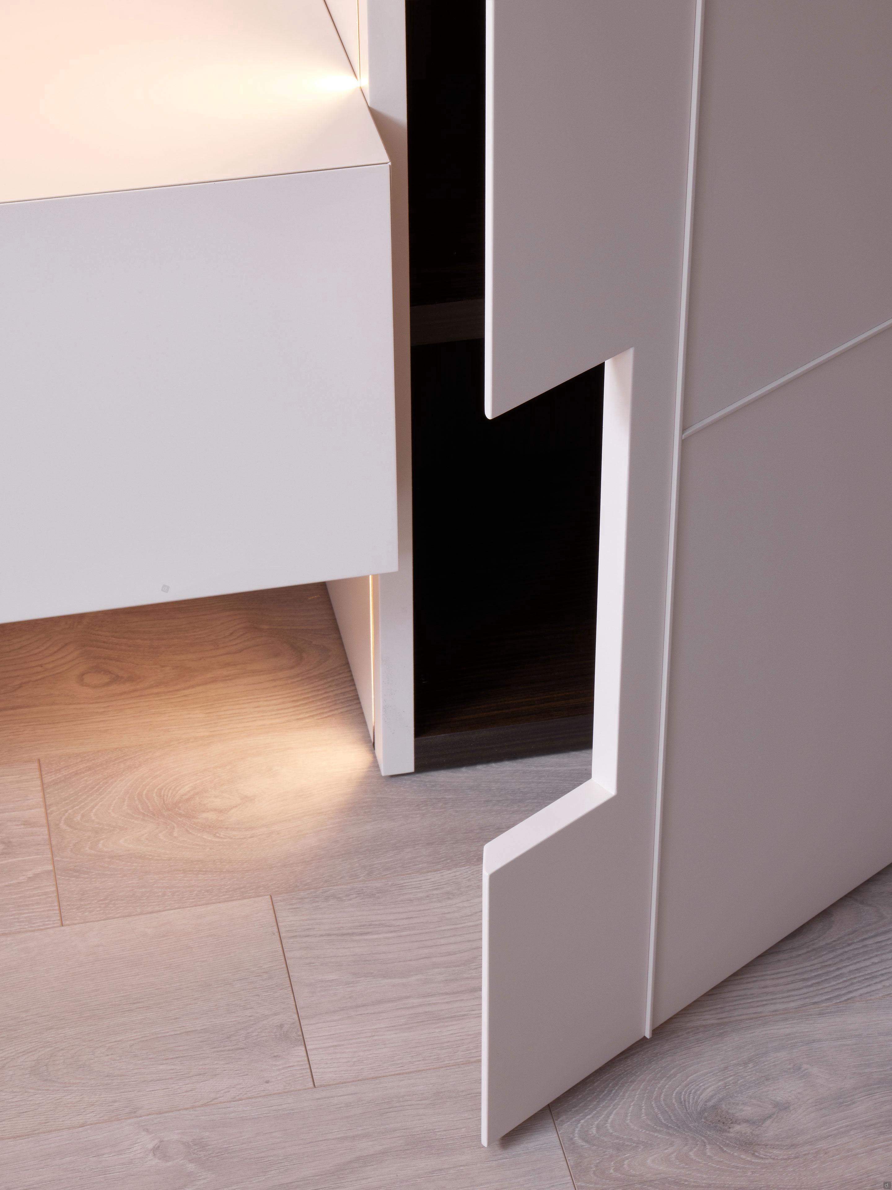 Griffe: Push-Pull oder durchgehende Griffmulde. Letztere besteht aus einer 3 mm starken Holzleiste, die in allen matten und metallischen Farben lackiert oder mit offenporigem Eichenholz versehen werden kann.