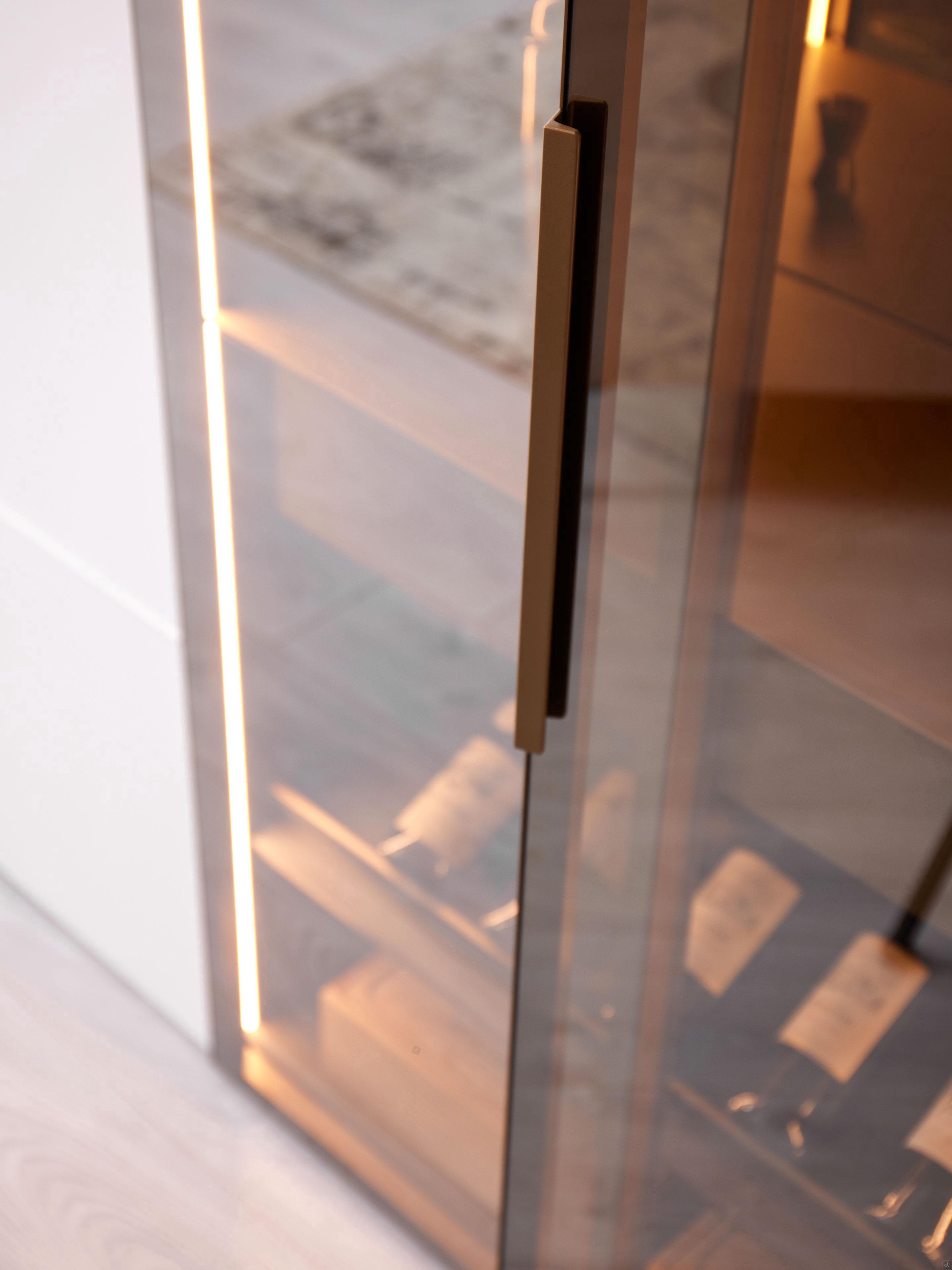 Vertikale LED-Leisten: Sie werden an den Seiten und/oder an den inneren Trennwänden der Module angebracht und sind 30° nach innen ausgerichtet: Für die Beleuchtung außerhalb der Module sind die Leisten 3 cm von den Fronten entfernt, während sie für die Beleuchtung innerhalb der Module 0,6 cm von den Fronten entfernt sind. Sie können mit einem Transformator ausgestattet werden (max. unterstützte Leistung 30 / 75 / 150 W) und über eine gesteuerte Steckdose (offene Fächer oder transparente Glastüren) oder einen Sensor (für alle anderen Türen) geschaltet werden. Warme LEDs 3000K-24V.