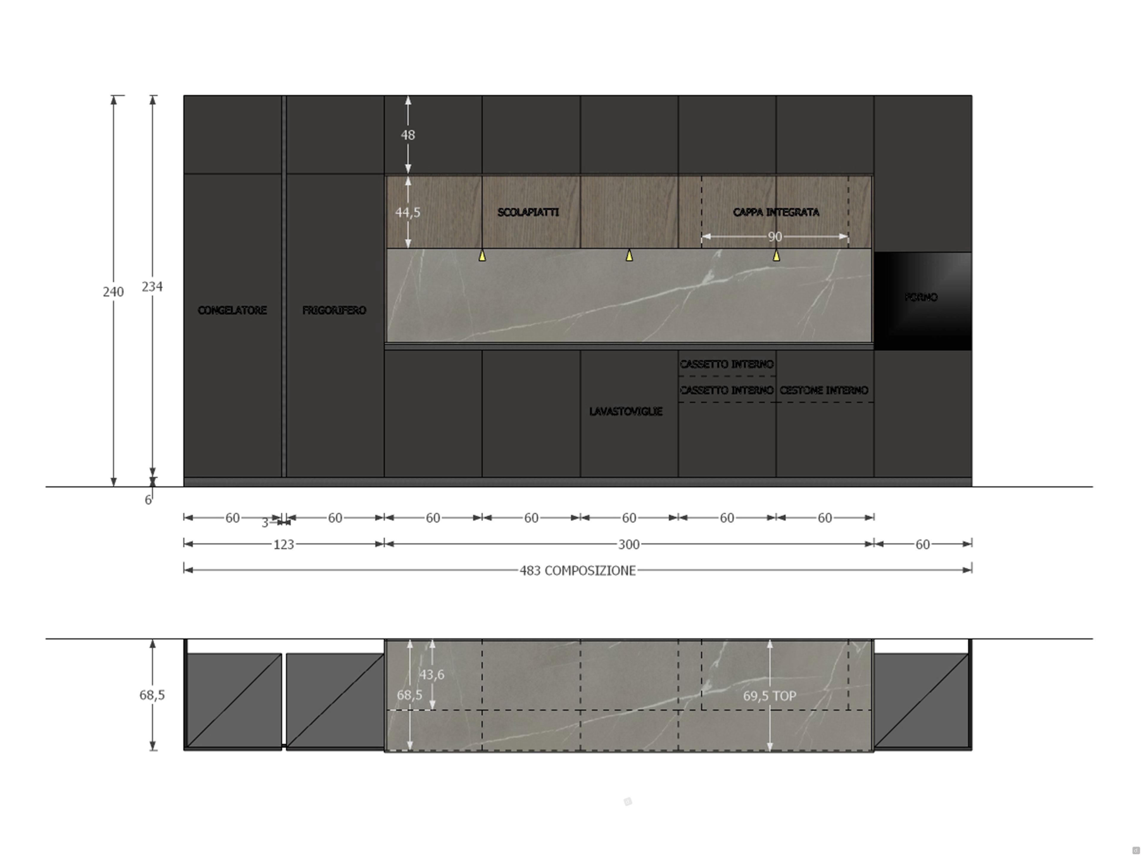 Moderne lineare Küche Plan 03 Outlet mit doppelten Oberschränken und doppelter Oberfläche: schwarzes, geätztes Glas Pece für Unterschränke, Hochschränke und Oberschränke; Holz Fashion Wood Rovere Ghiro für Unterschränke und Rahmen des Arbeitsbereichs.