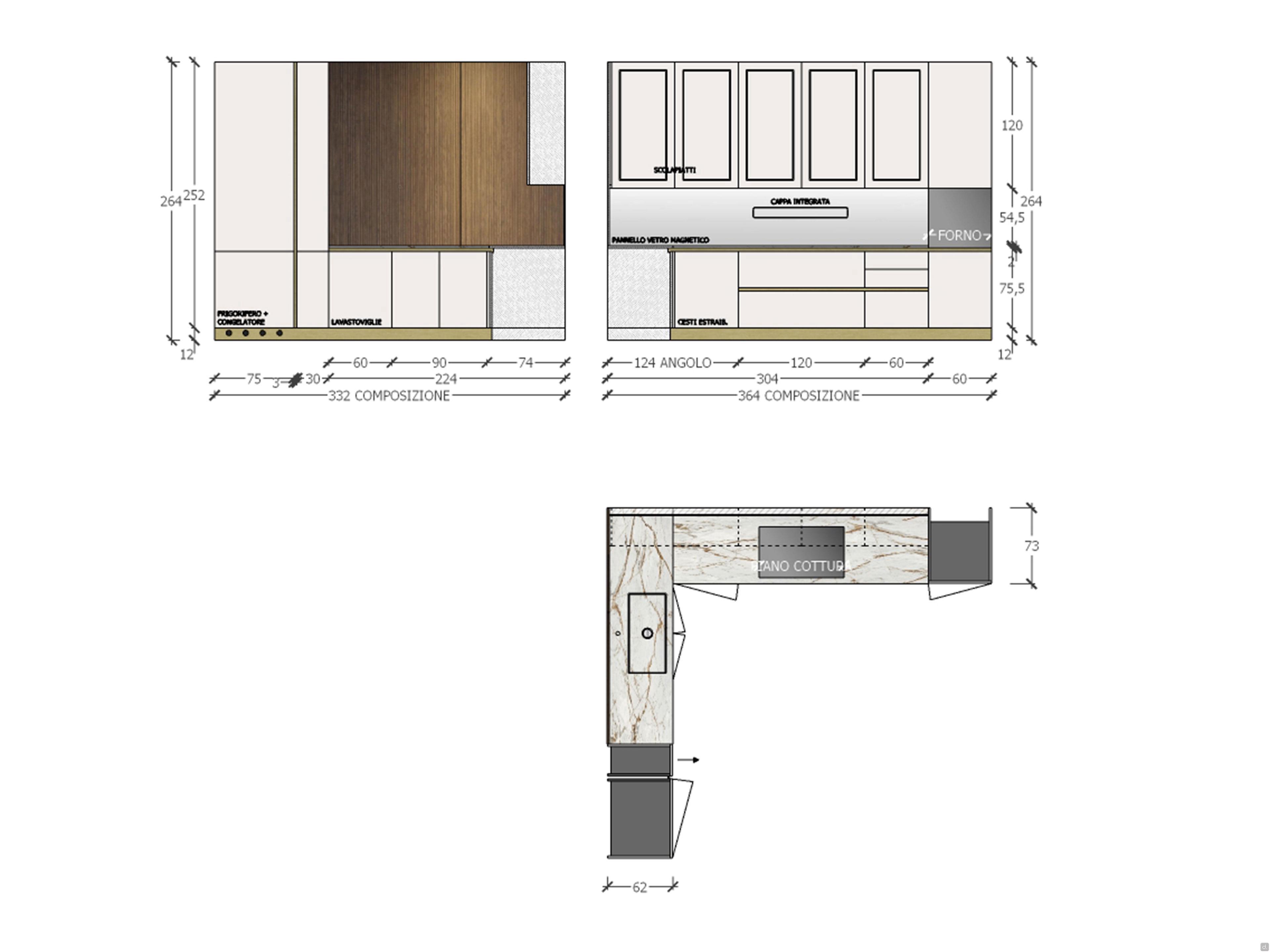 Eleven 01 wird in einer Eckkonfiguration von 364 x 332 cm angeboten, komplett mit allem, was dazugehört: Hochschrank mit eingebautem Kühlschrank, Vorratsschrank mit ausziehbarer Tür, in die Arbeitsplatte integrierte Spüle, Induktionskochfeld mit in die Magnetolab-Rückwand integrierter Dunstabzugshaube, Geschirrspüler und Backofeneinheit. Eine kompakte, aber vollständige Eckküche, ideal für die Einrichtung eines offenen Raums oder einer modernen und jugendlichen Küche.
