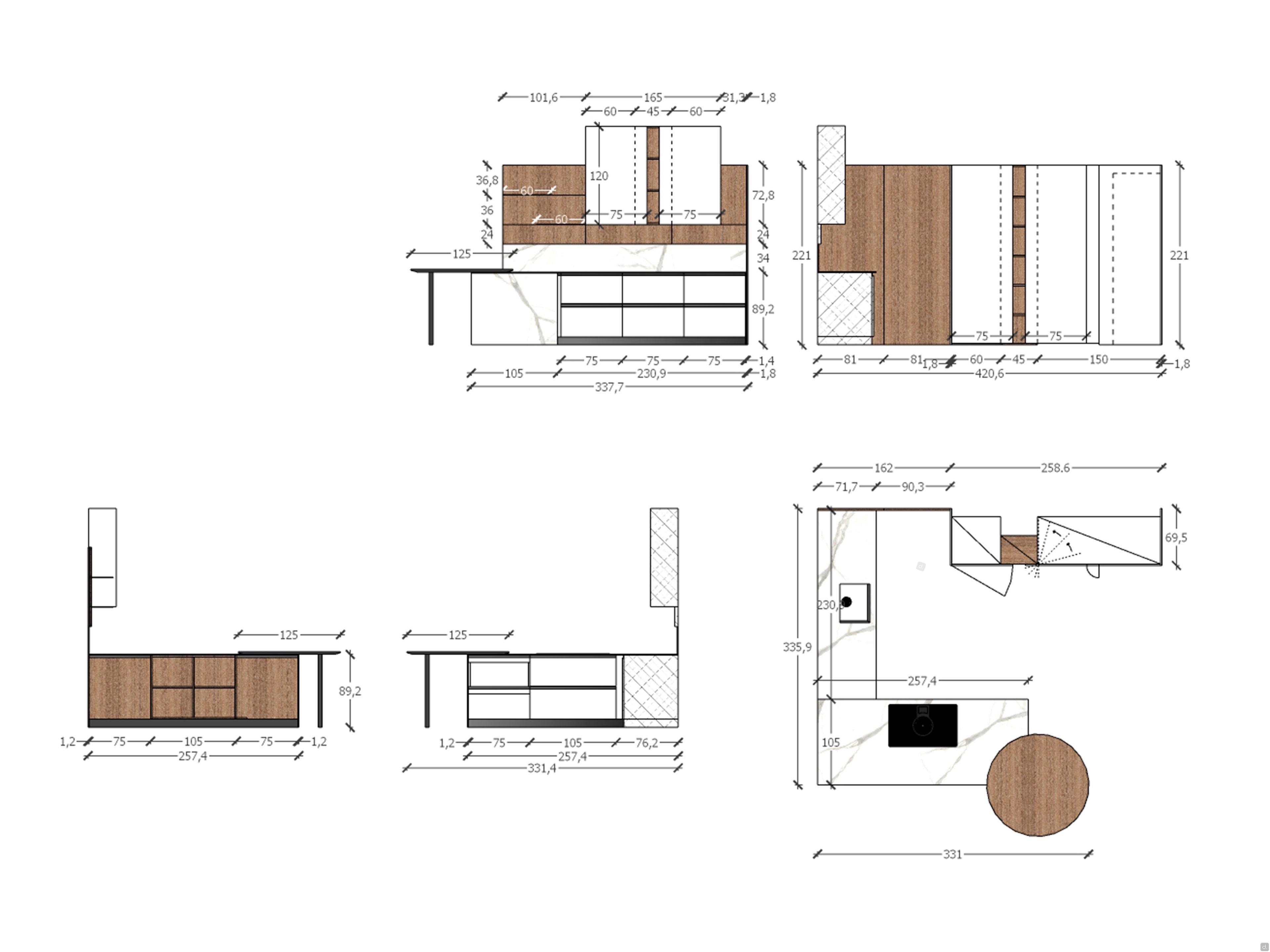 Zu diesen beiden edlen Materialien kommen noch die Laminam-Platte in Calacatta-Marmoroptik und das moka shine-lackierte Metall für die Details hinzu: Kanten, Regale und Beine der Snacktheke.