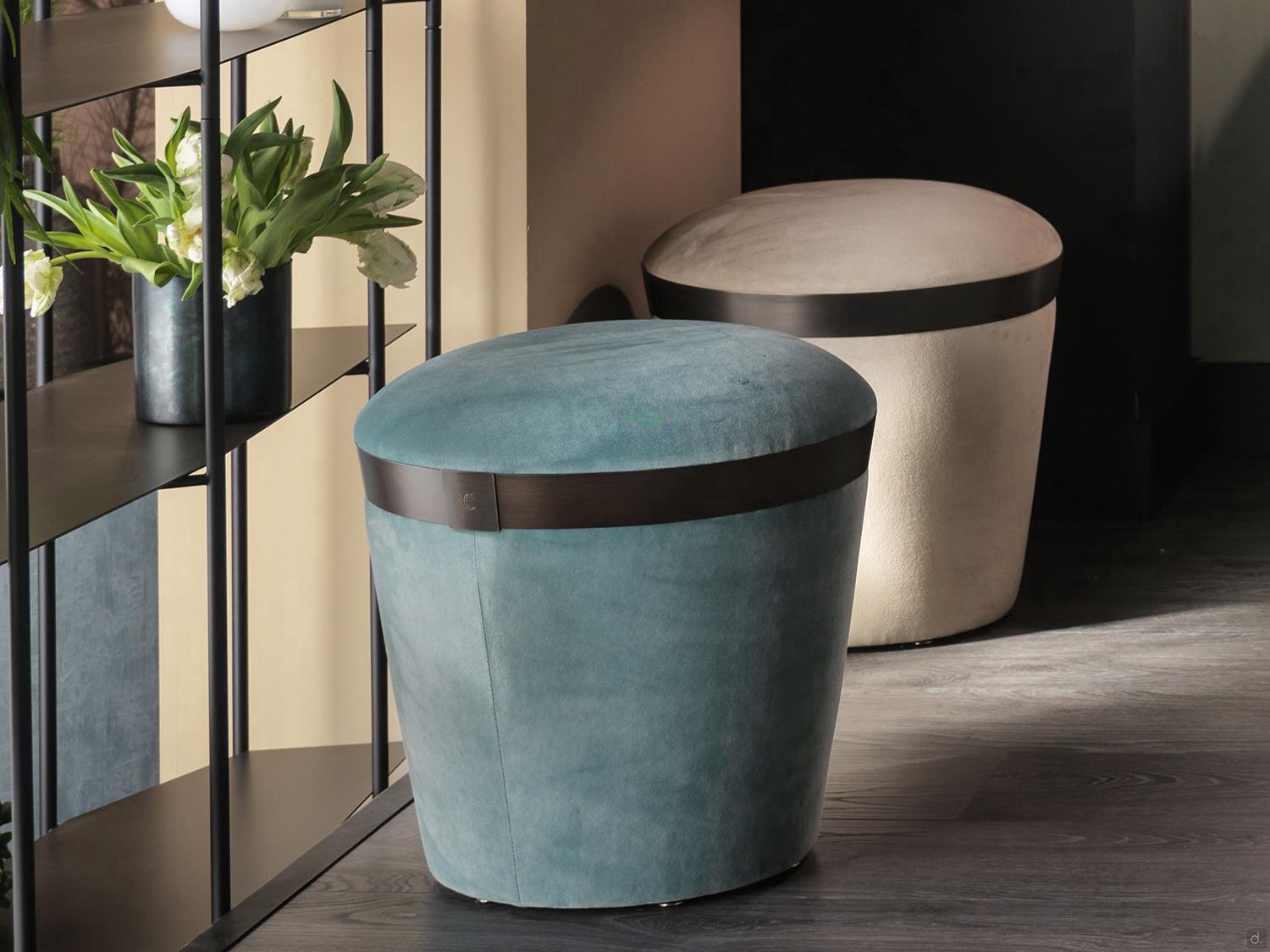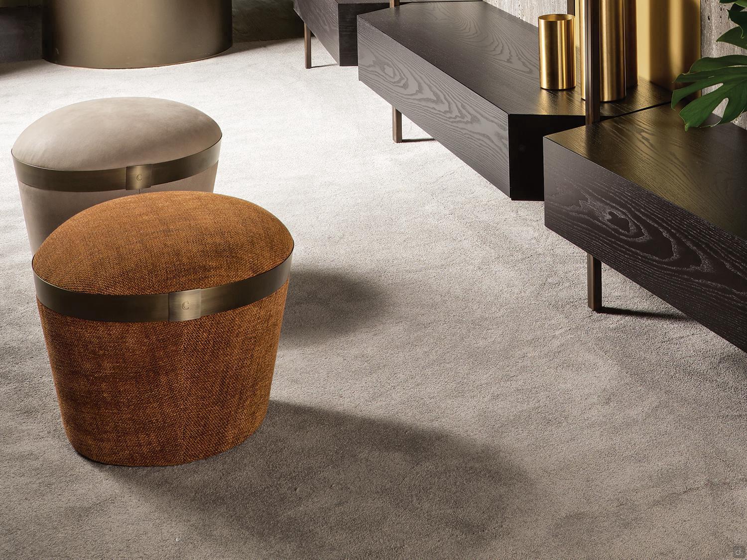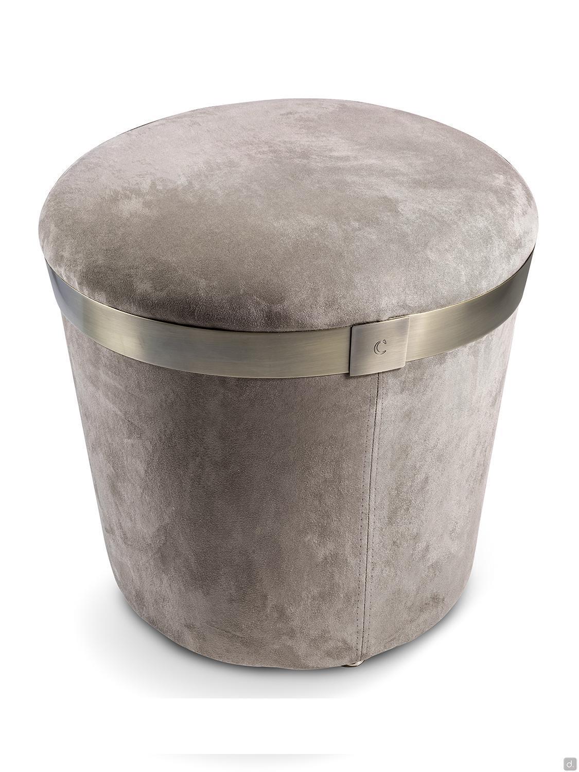Portofino von Cantori ist ein moderner, luxuriöser Hocker, der vollständig mit Stoff, Samt, Kunstleder oder Leder bezogen und mit einem runden Metallband verziert ist. Portofino ist eine raffinierte und vielseitige Ergänzung, die Räume zart vervollständigen kann; ideal in Kombination mit dem Sofa oder Sessel der gleichen Familie, um ein kostbares koordiniertes Leben zu schaffen.Die originelle kegel, stumpf förmige Form und die handwerkliche Verarbeitung unterstreichen den nüchternen und wichtigen Charakter dieser Ergänzung, die sich sowohl für moderne als auch für klassischere Umgebungen eignet.