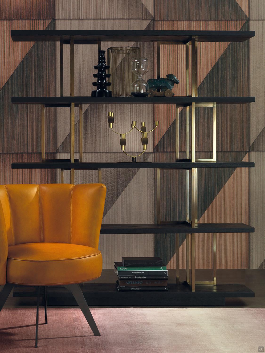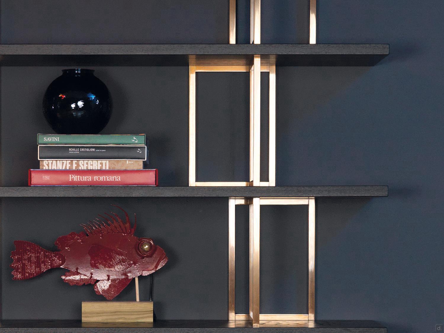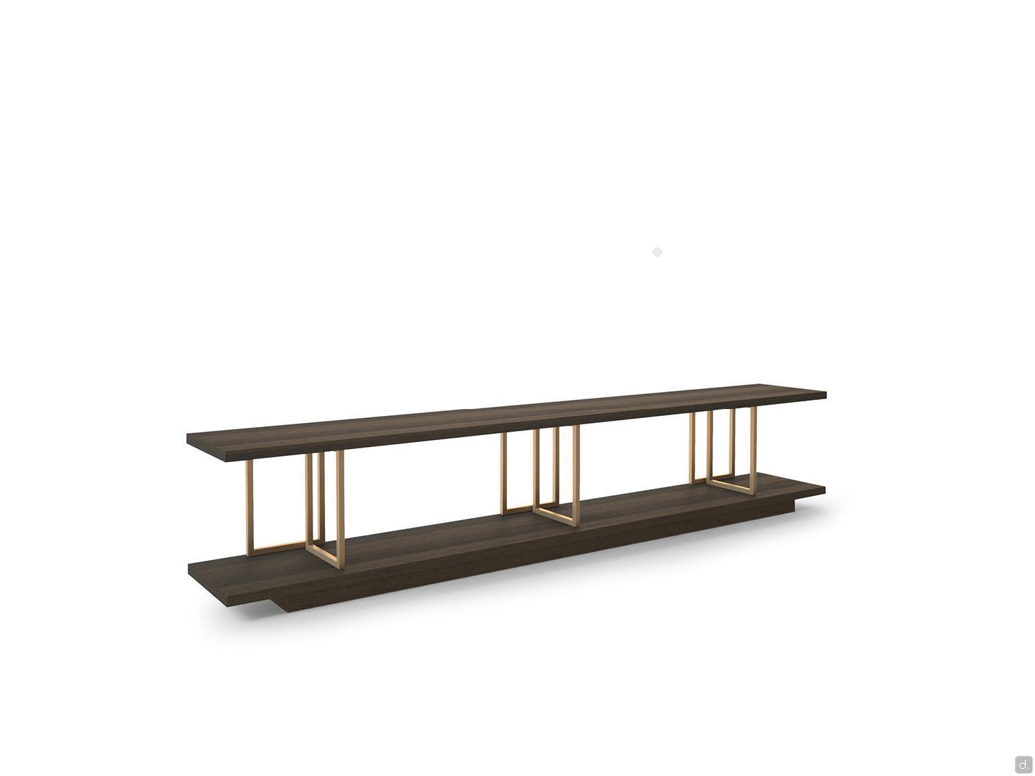 Lana ist ein modernes Design-Bücherregal mit freistehenden Holzablagen das sich sowohl für ein Wand-Bücherregal als auch Raumteiler in der Mitte des Raumes eignet. Es zeichnet sich durch seine ästhetische Leichtigkeit aus, die durch das Fehlen von Rückwänden und die dünnen, nach innen gerichteten Stützen aus Eisen oder Messing entsteht, die die freitragenden Regalböden frei lassen.Die Regalböden mit einer Tiefe von 35 cm sind aus Furnierholz Eiche gebeizt oder Nussbaum Canaletto und verlaufen ohne Unterbrechung über die gesamte Breite des Bücherregals, so dass ein schwebender Effekt entsteht.Je nach Bedarf kann man sich für eine der fünf verfügbaren Höhen von 46 bis 198 cm entscheiden: Das Bücherregal mit einer Breite von 140 oder 240 cm lässt sich äußerst vielseitig einsetzen, vom eleganten hohen Bücherregal über ein nützliches Regal für Räume mit geringer Tiefe bis hin zu einem Konsolentisch und einem TV-Schrank bei den niedrigeren Modellen.