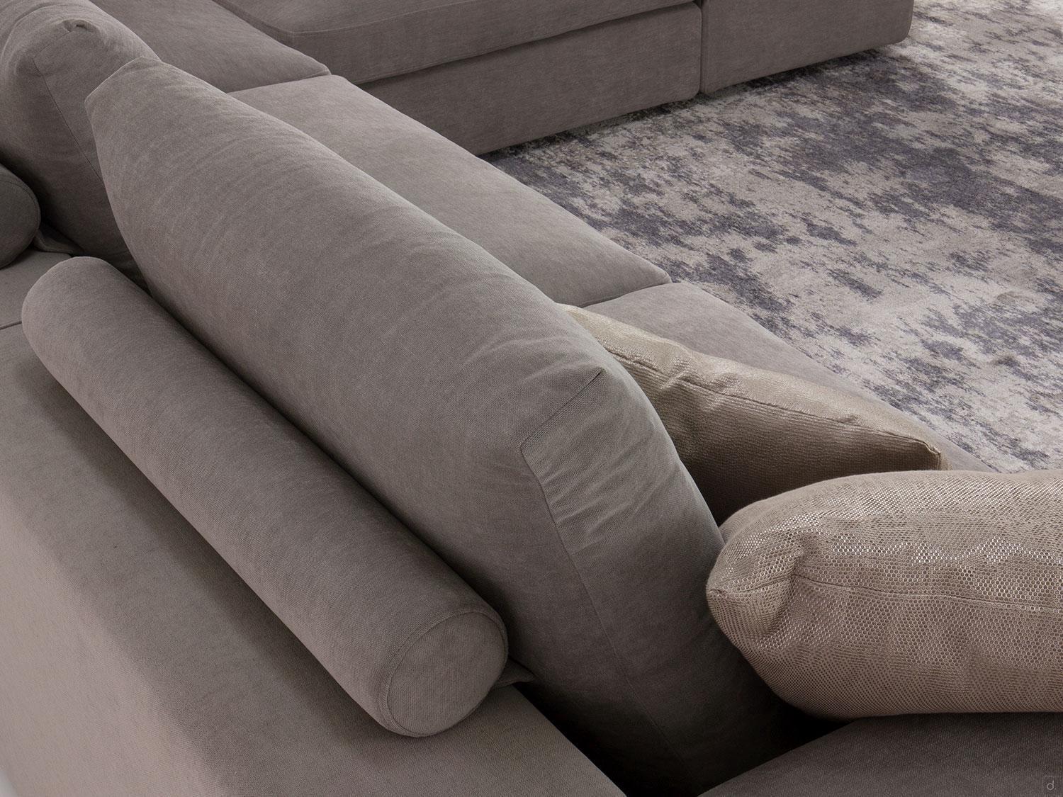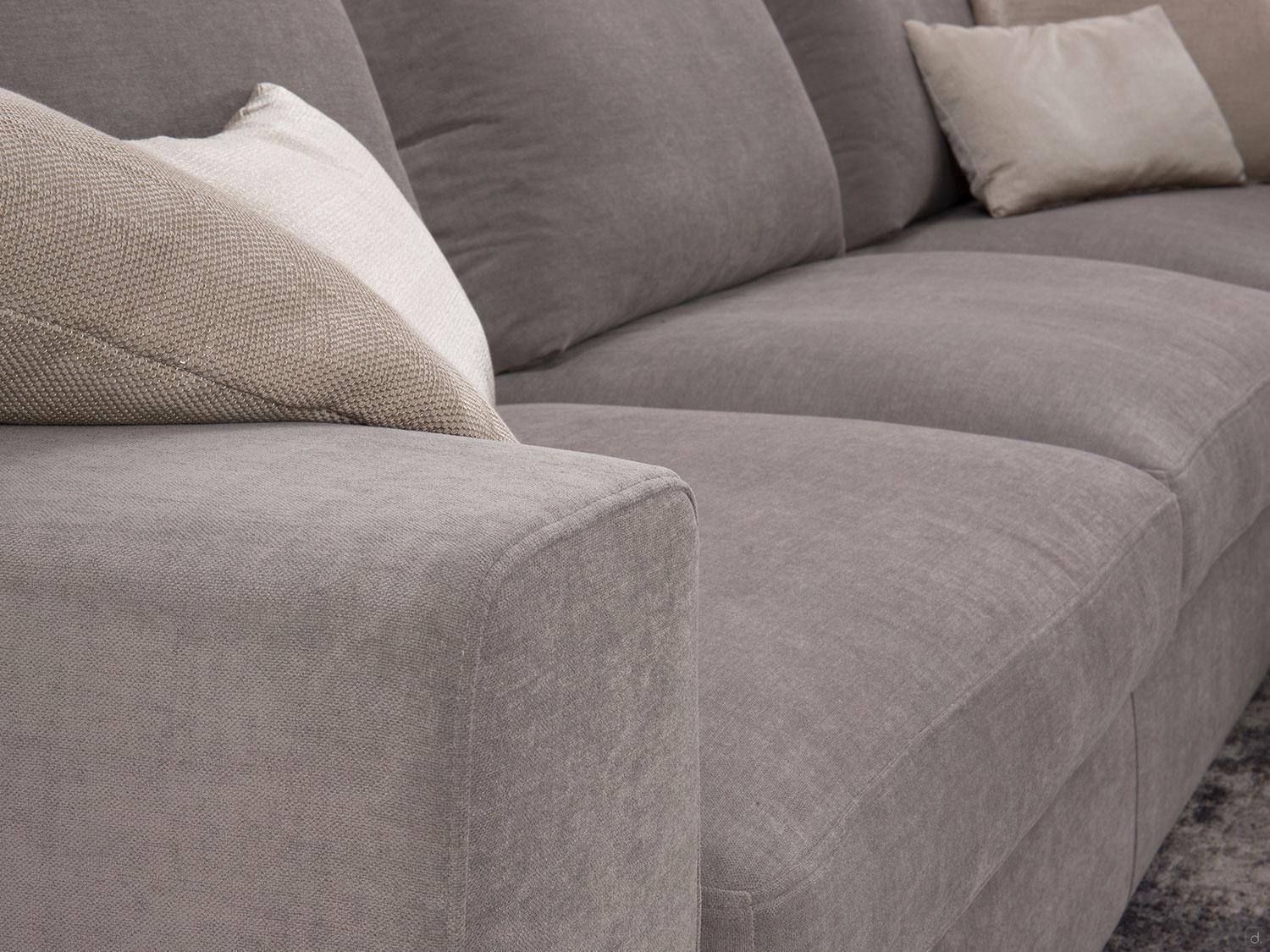 Hyeres Outlet ist ein Ecksofa mit einem Hocker als Endelement, das mit einem fleckenabweisenden, robusten, aber weichen Bezug mit Chenille-Effekt in Grau angeboten wird. Fünf elegante Zierkissen, bezogen mit raffinierten, glänzenden Stoffen, sind im Angebot enthalten.