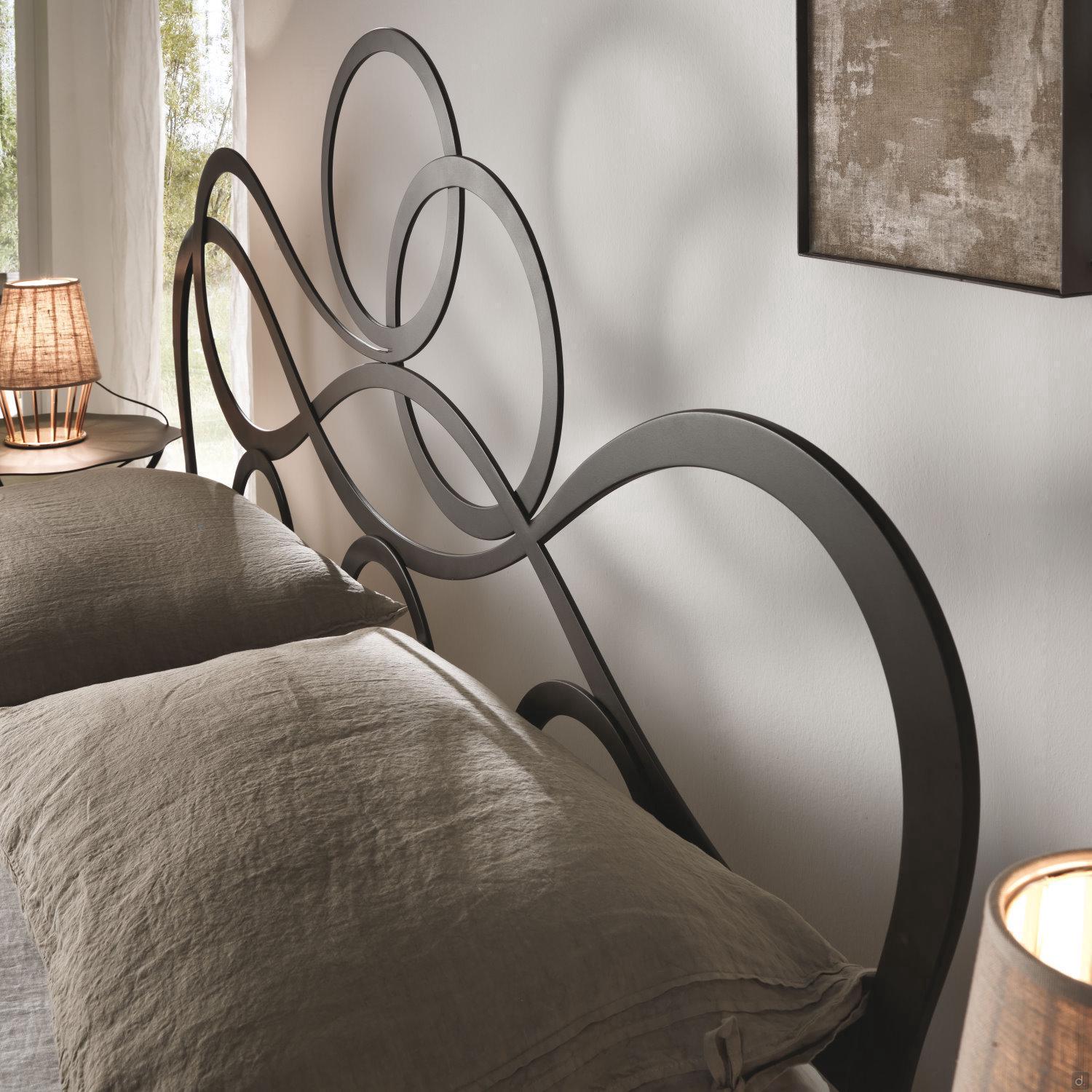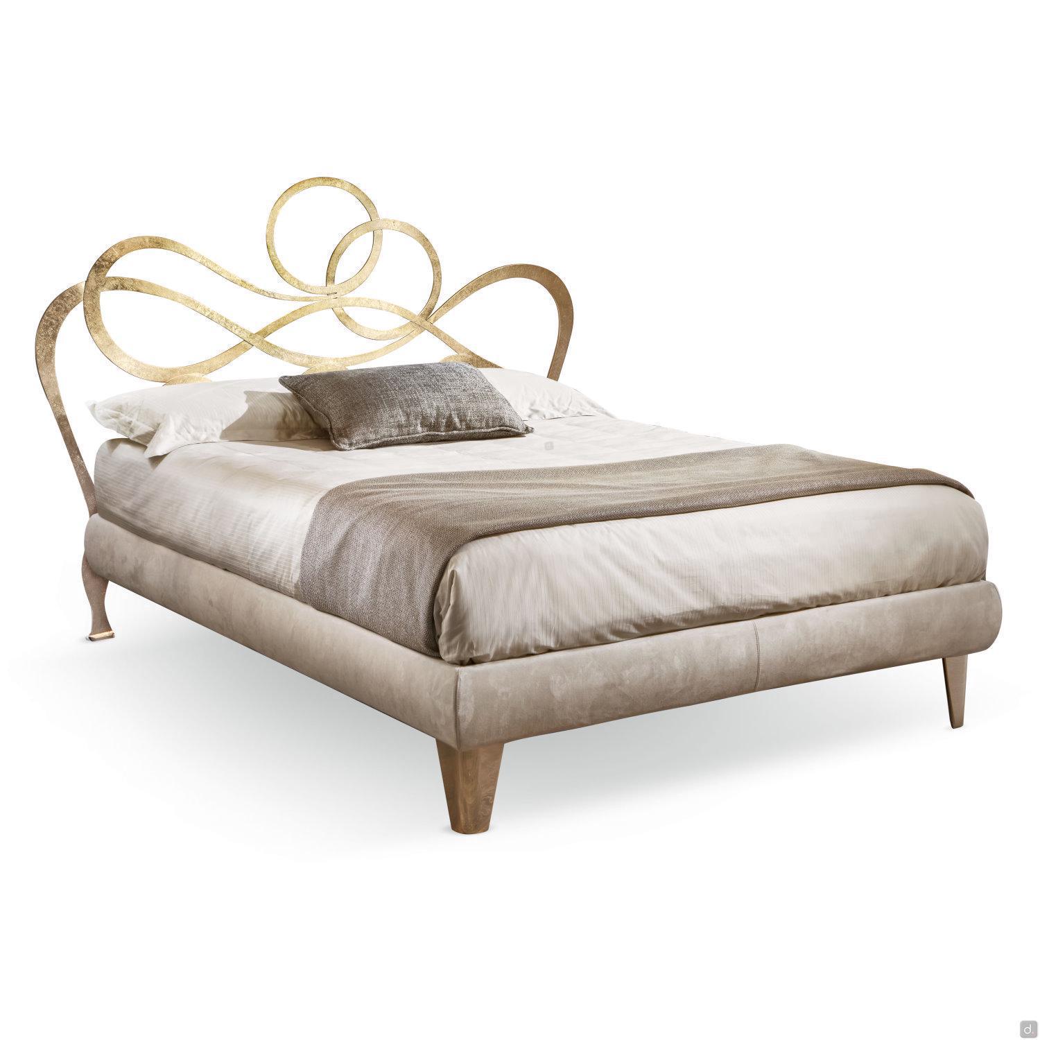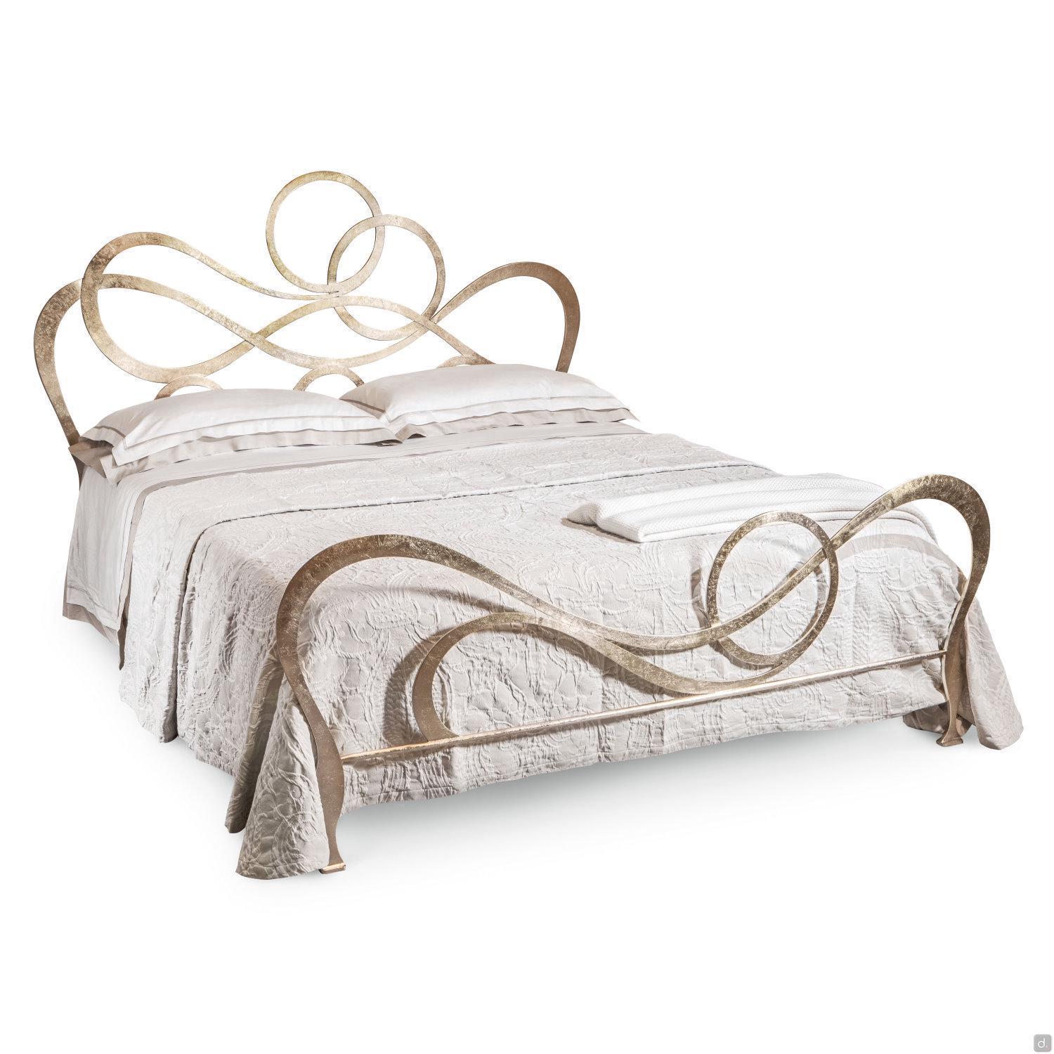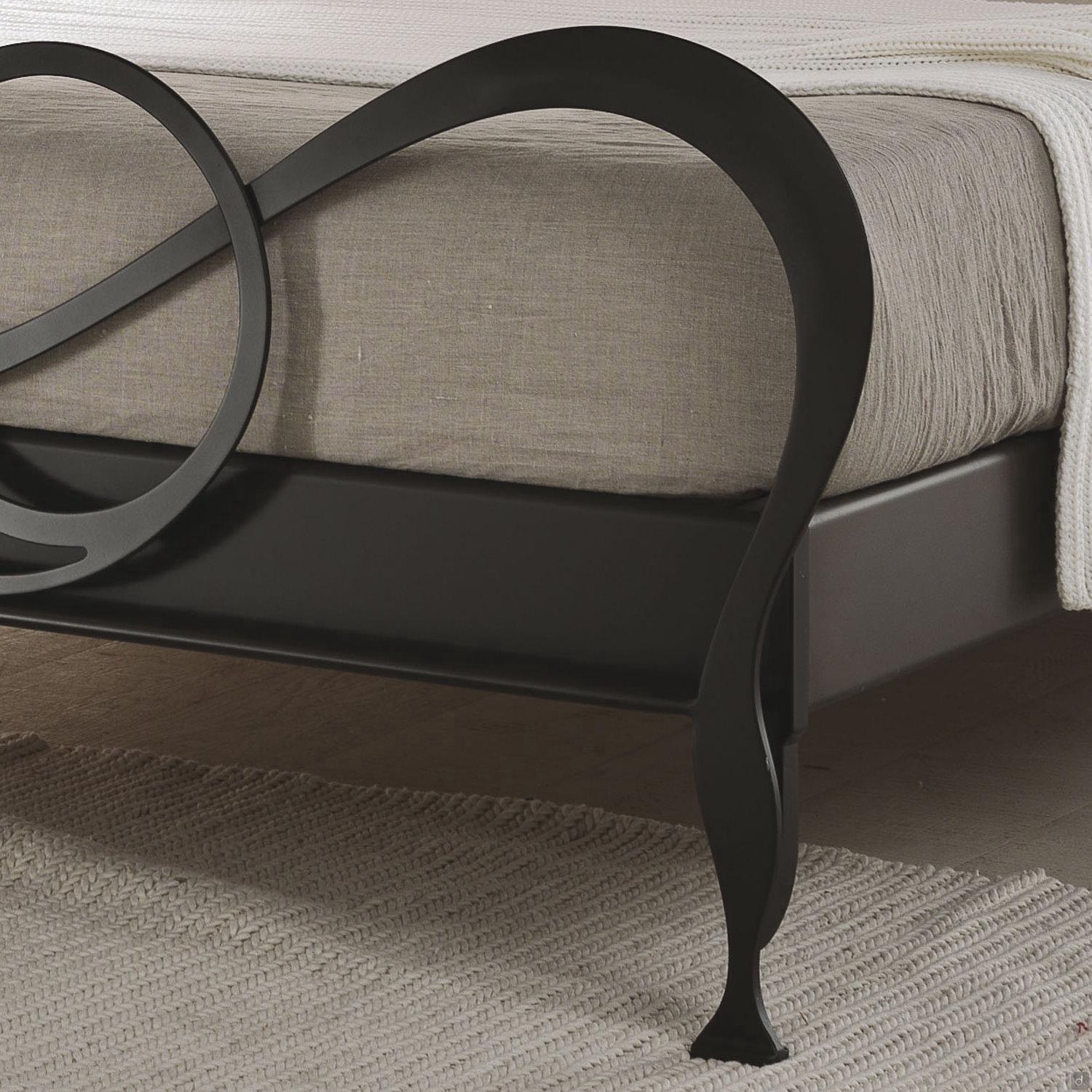 J'Adore Doppelbett aus Eisen mit dekorativem Kopfteil und Fußteil in geschwungenen und harmonischen Linien, welches in modernem Stil neu erfunden wurde. überarbeitet wurde. Die Struktur besteht aus lasergeschnittenem, flachem Metall, mit Drahtschweißnähten und vollständig von Hand polierten und bearbeiteten Oberflächen. In der gepolsterten Version hat das Bettgestell einen inneren Holzkern, der mit Kunstleder oder Kunstleder überzogen ist. Die vorderen Füße sind aus Aluminiumguss gefertigt und haben eine charakteristische eckige Form. J'Adore ist ein modernes und ausbalanciertes Bett: Die Spiralen, die das Kopf- und Fußteil zieren, sind weich und ausgewogen und geben dem Bett einen eleganten und romantischen Aspekt.