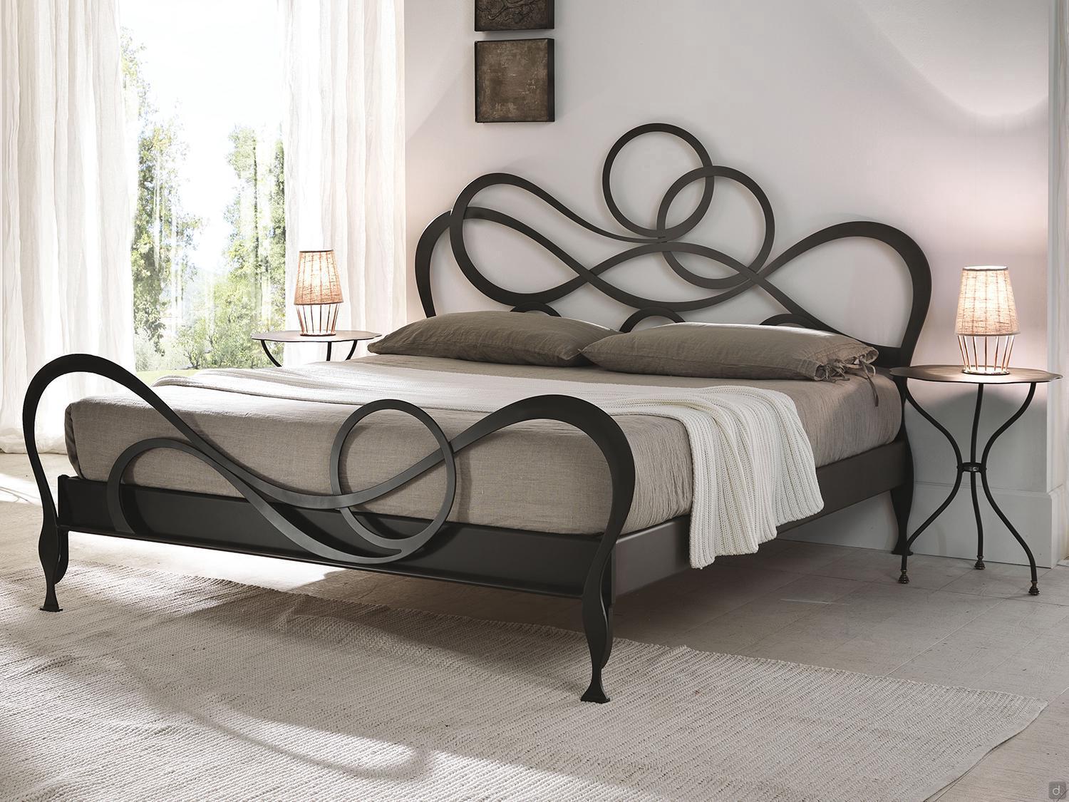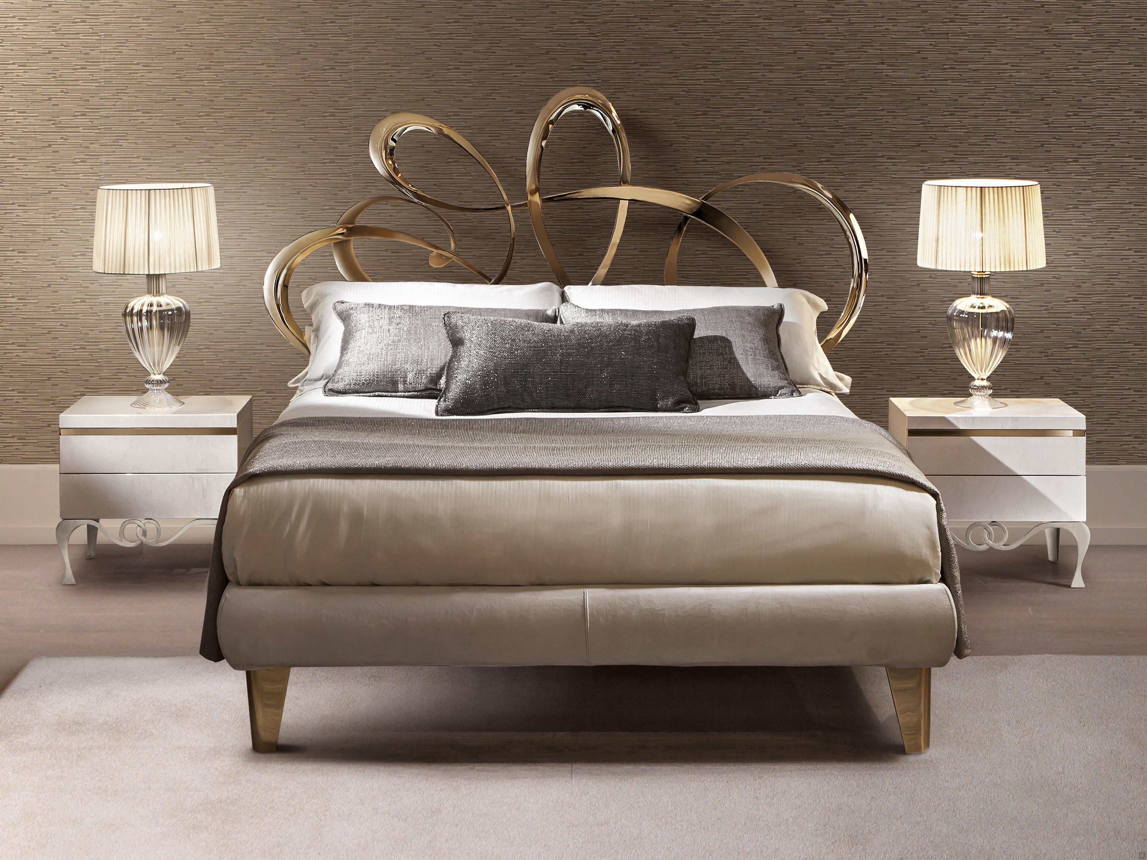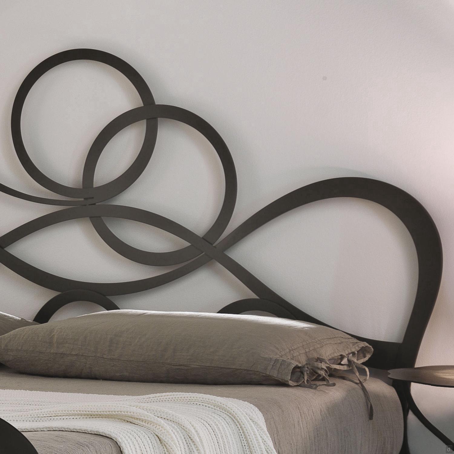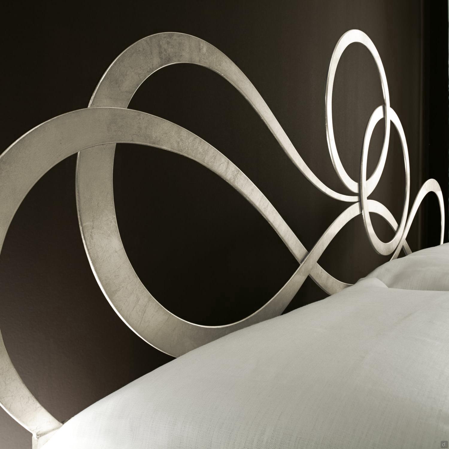 J'Adore Doppelbett aus Eisen mit dekorativem Kopfteil und Fußteil in geschwungenen und harmonischen Linien, welches in modernem Stil neu erfunden wurde. überarbeitet wurde. Die Struktur besteht aus lasergeschnittenem, flachem Metall, mit Drahtschweißnähten und vollständig von Hand polierten und bearbeiteten Oberflächen. In der gepolsterten Version hat das Bettgestell einen inneren Holzkern, der mit Kunstleder oder Kunstleder überzogen ist. Die vorderen Füße sind aus Aluminiumguss gefertigt und haben eine charakteristische eckige Form. J'Adore ist ein modernes und ausbalanciertes Bett: Die Spiralen, die das Kopf- und Fußteil zieren, sind weich und ausgewogen und geben dem Bett einen eleganten und romantischen Aspekt.